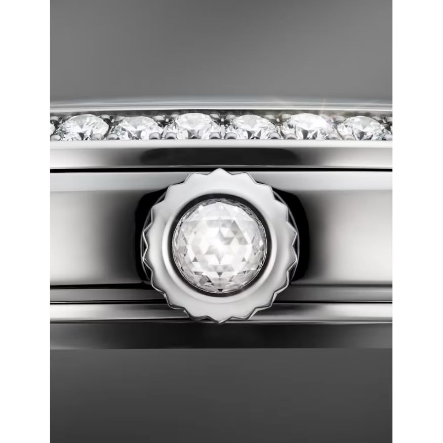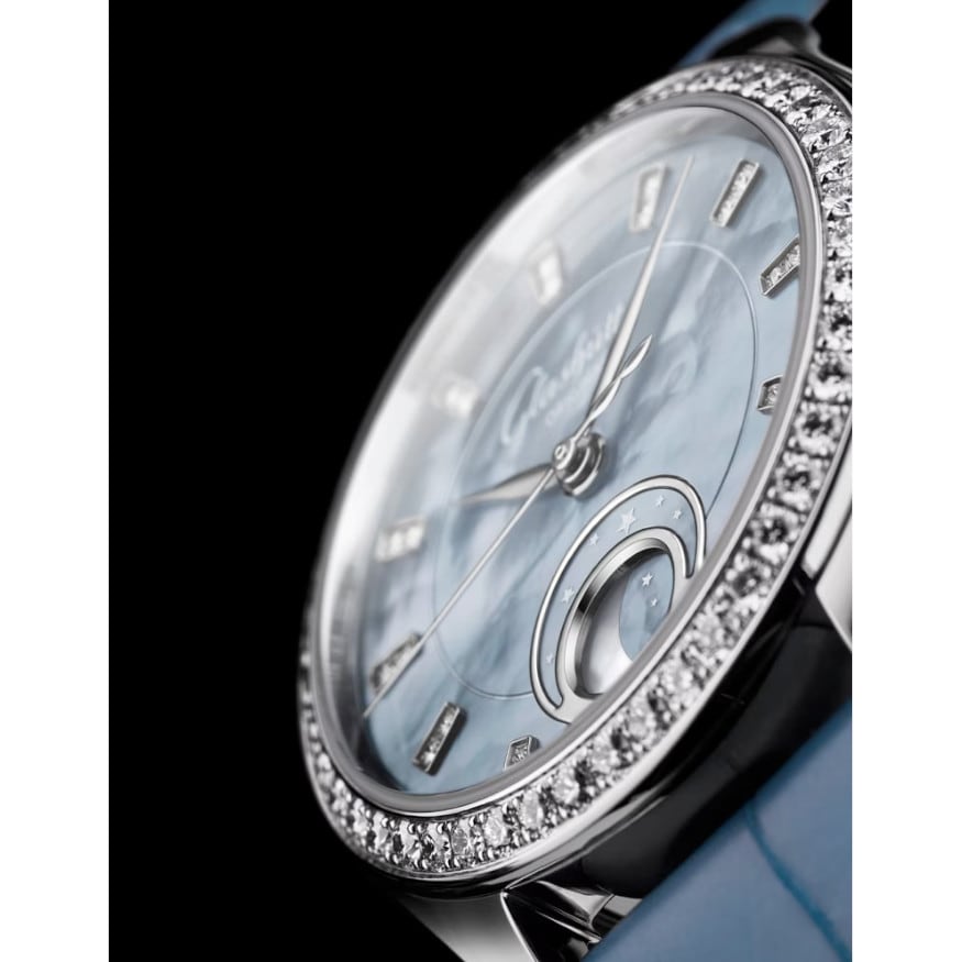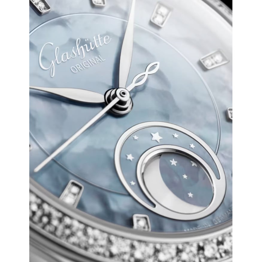 Sparkling diamonds and polished stainless steel complement the appearance of the dial, contrasting the soft shimmer of the mother-of-pearl with a cool shine. The bezel, set with 48 brilliant-cut diamonds, is echoed in the diamond indexes and the small silver stars of the magnificent moon phase display at 6 o’clock. This is also made of mother-of-pearl. The moon phase mechanism is extremely precise and only needs to be corrected by one day after 122 years.