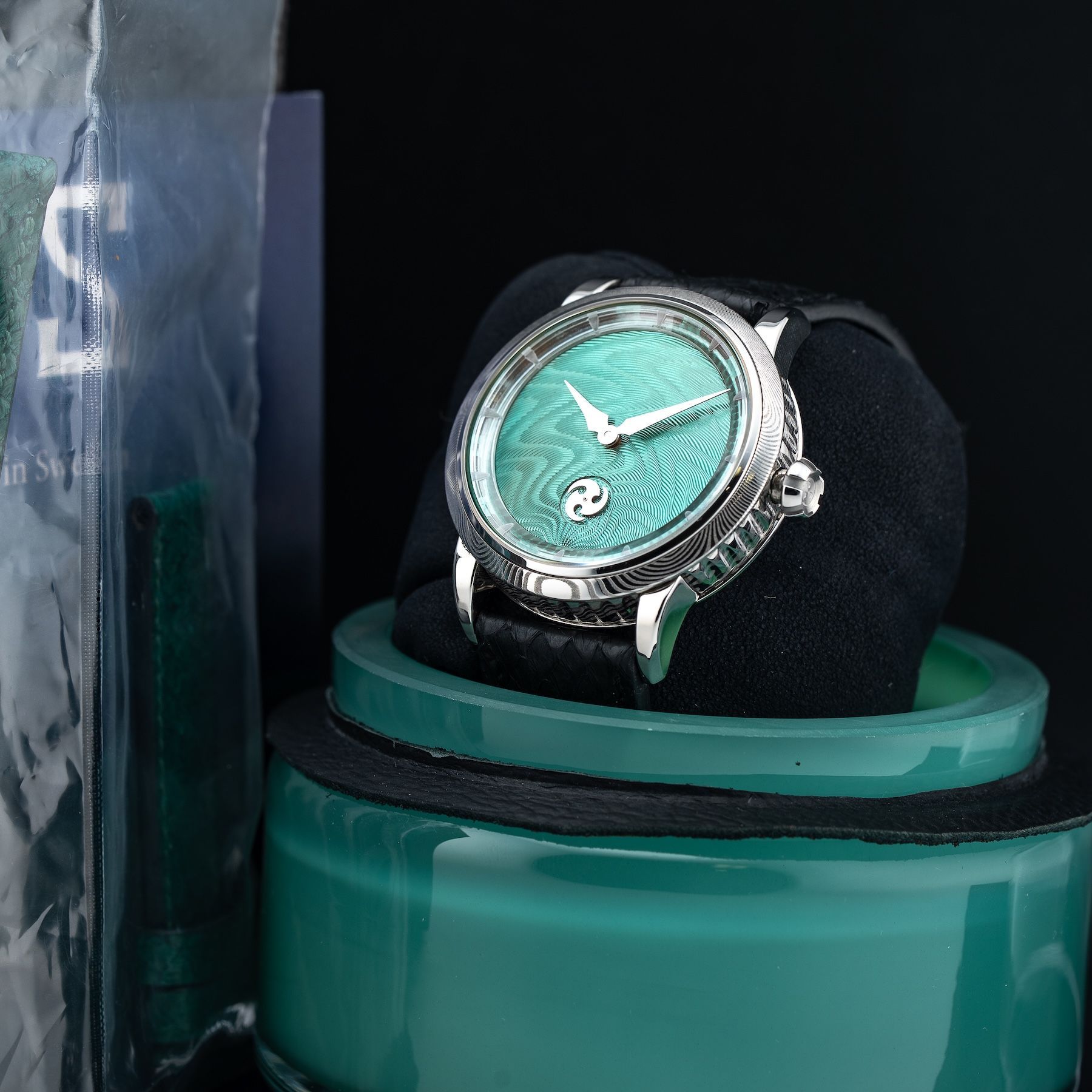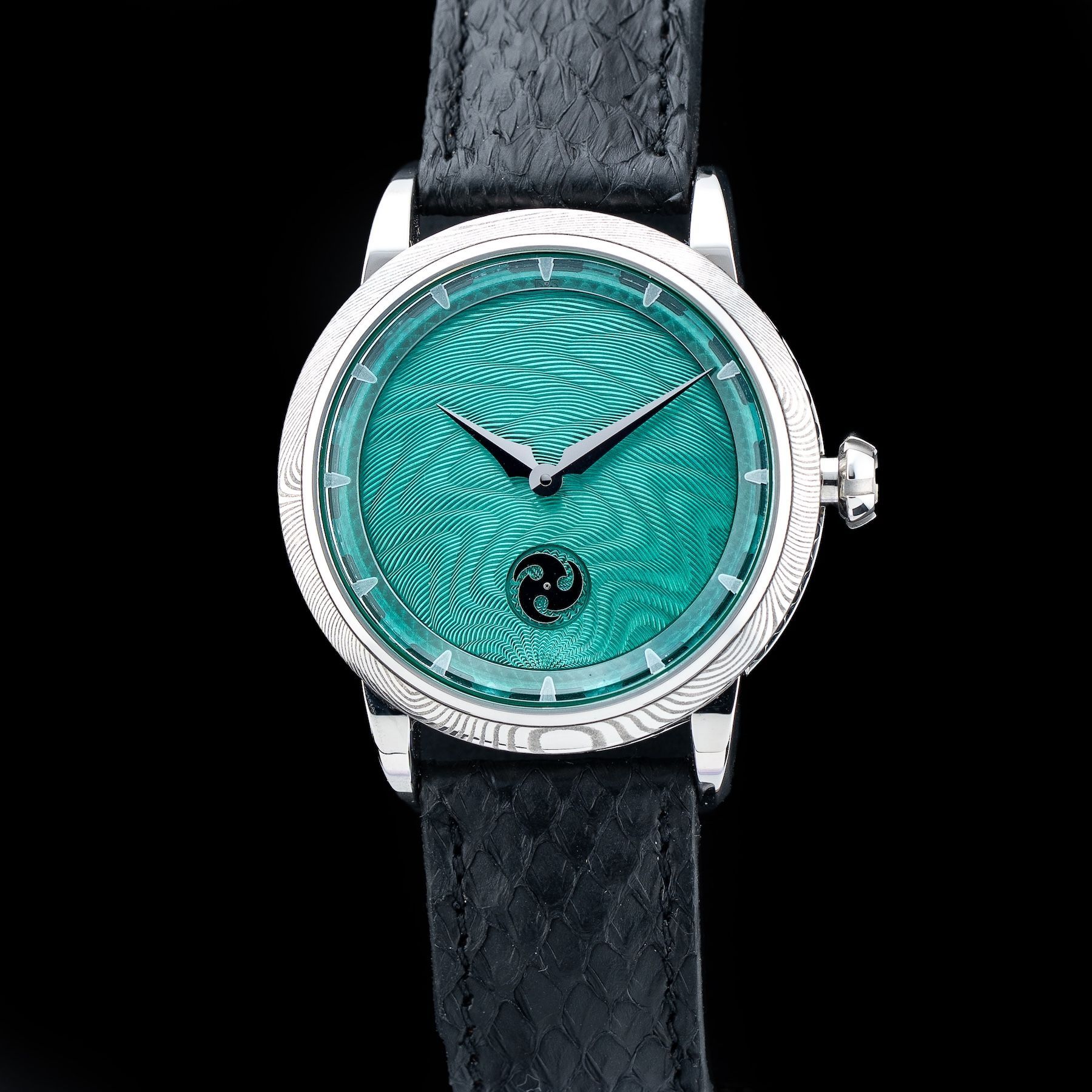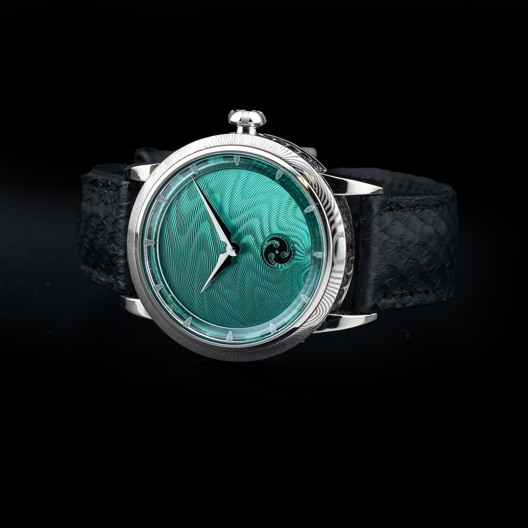 This GoS Norrsken Northern Lights Guilloché Green features a 41.5mm damascus steel case with an exhibition case back on a black leather strap. This watch also showcases a green guilloché dial with rhodium-plated hands and index dial markers covered by scratch resistant sapphire crystal.