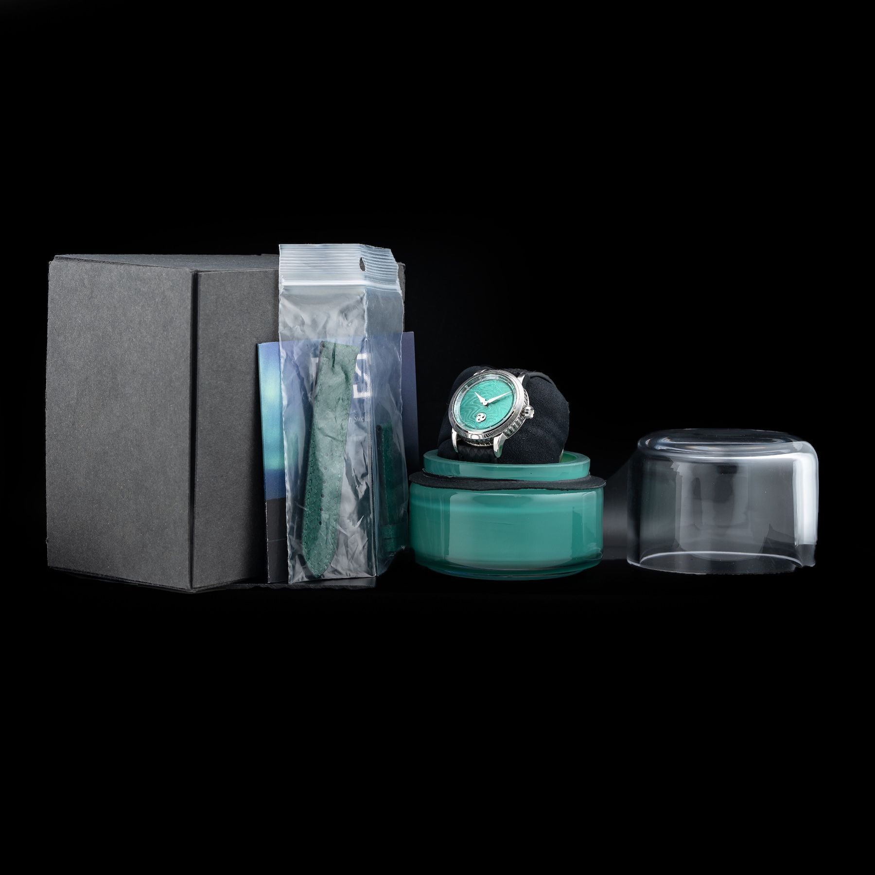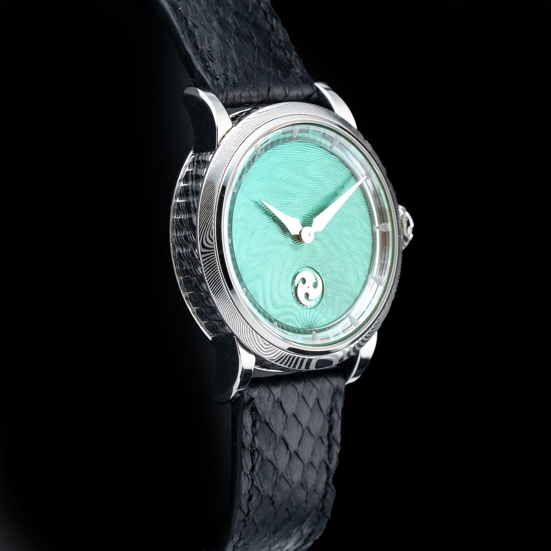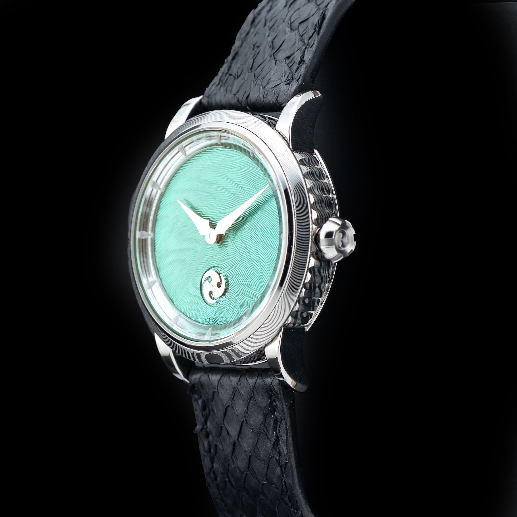 This GoS Norrsken Northern Lights Guilloché Green features a 41.5mm damascus steel case with an exhibition case back on a black leather strap. This watch also showcases a green guilloché dial with rhodium-plated hands and index dial markers covered by scratch resistant sapphire crystal.