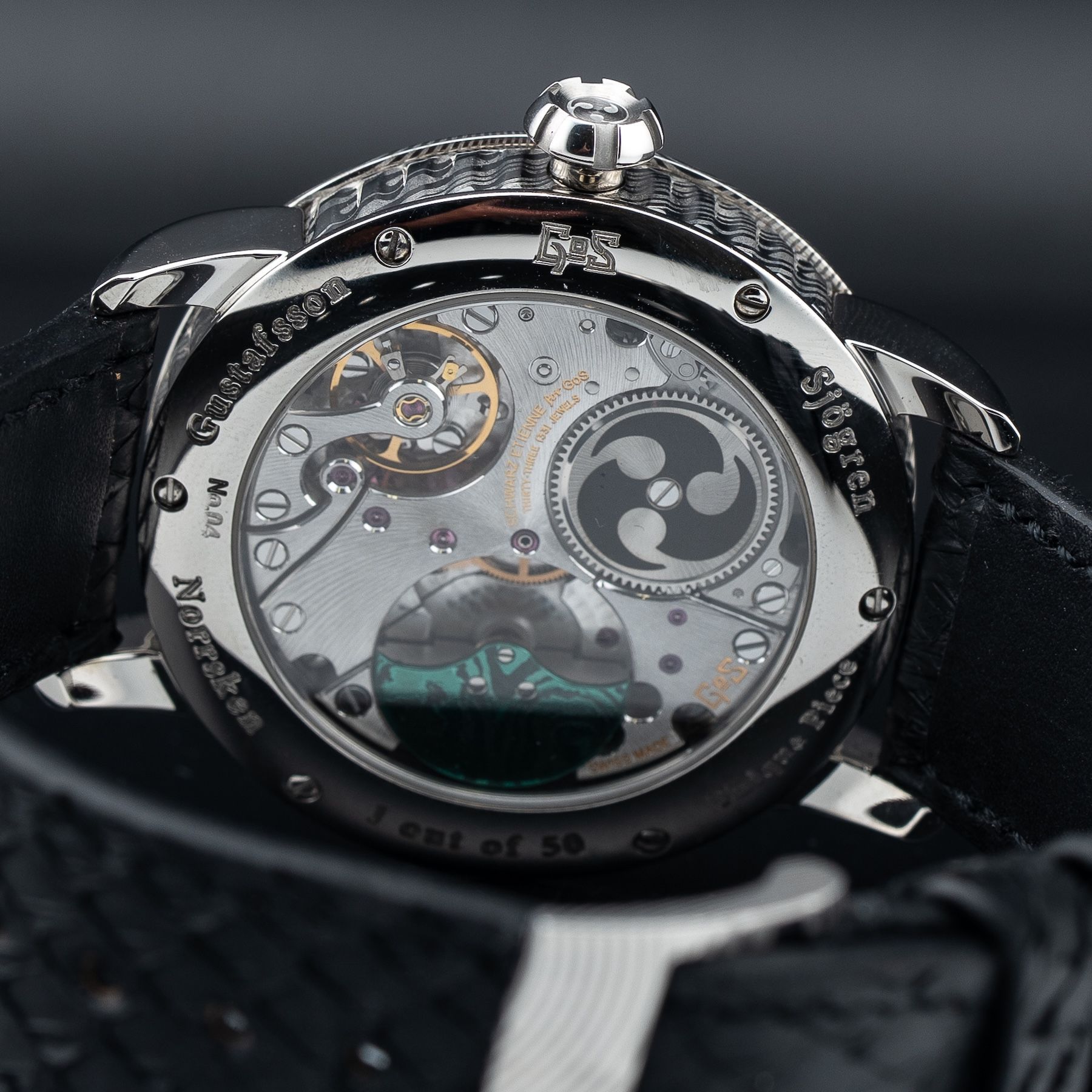 Manufacture movement by Schwarz Etienne with GoS-specific modifications and finishing with a power reserve of approximately 86 hours. Water resistance up to 50 meters.