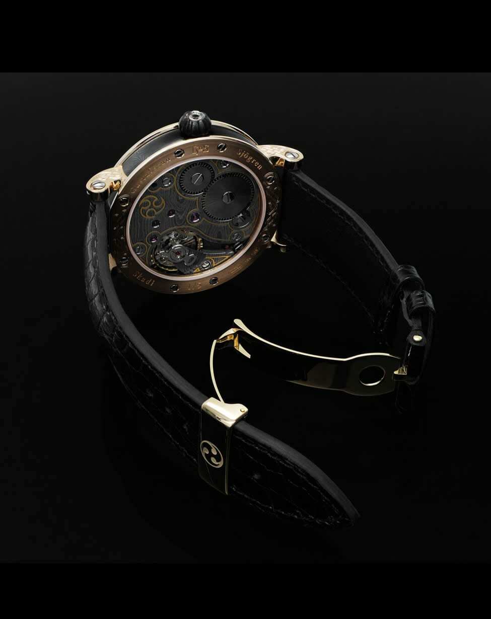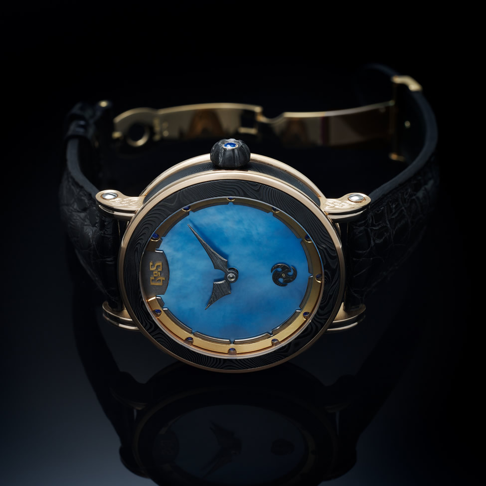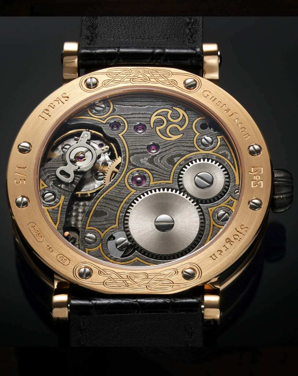 Case ring in black damascus steel made from stainless damascus steel provided by Swedish masters from Damasteel and reworked by GoS. Industry-strength PVD coating by ionbond Sweden, in Linköping. Case back, glass ring and lugs from 18k gold – all handmade in Linköping Sweden