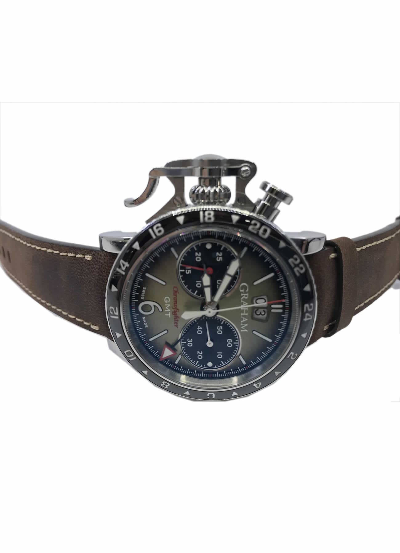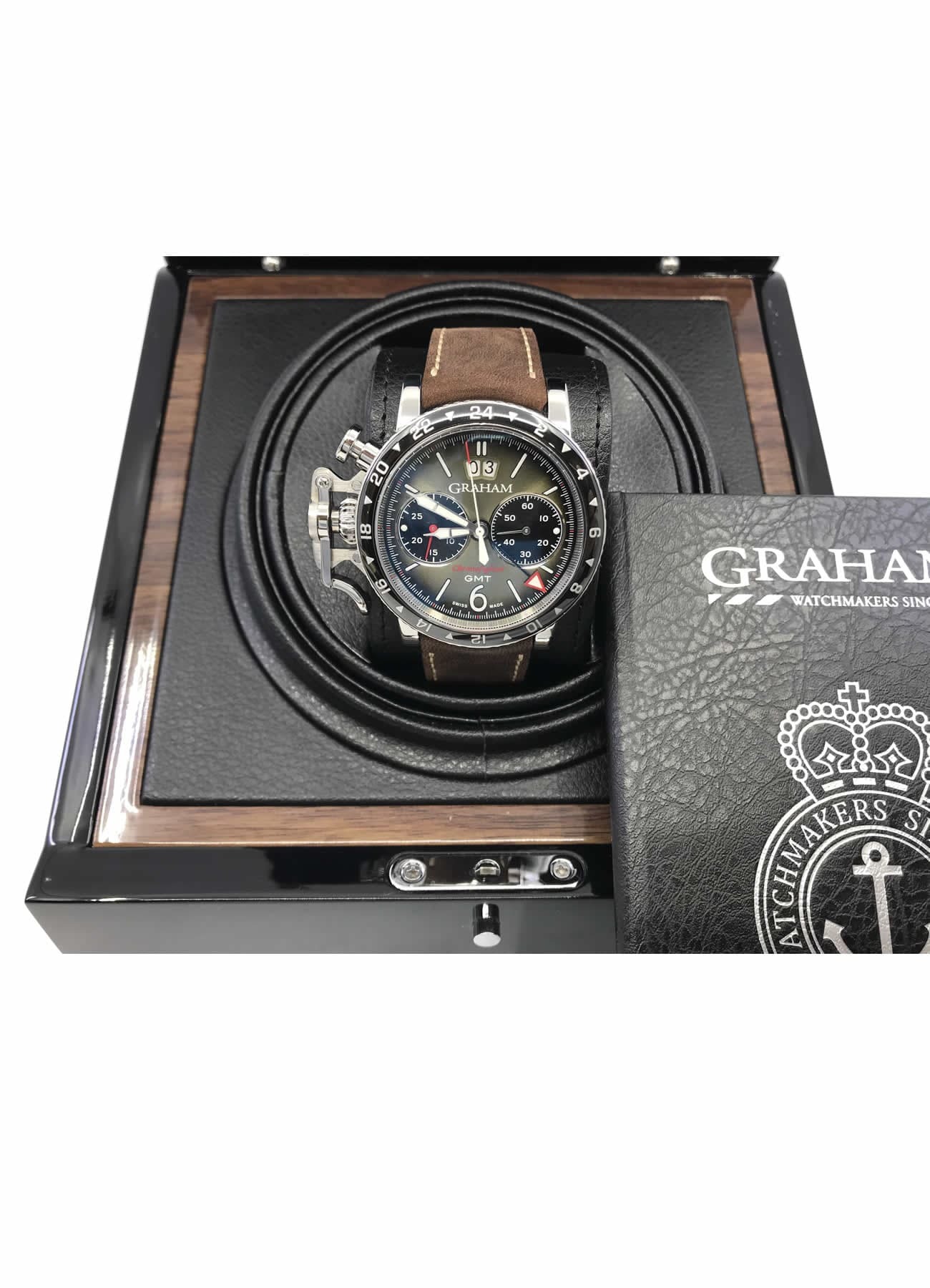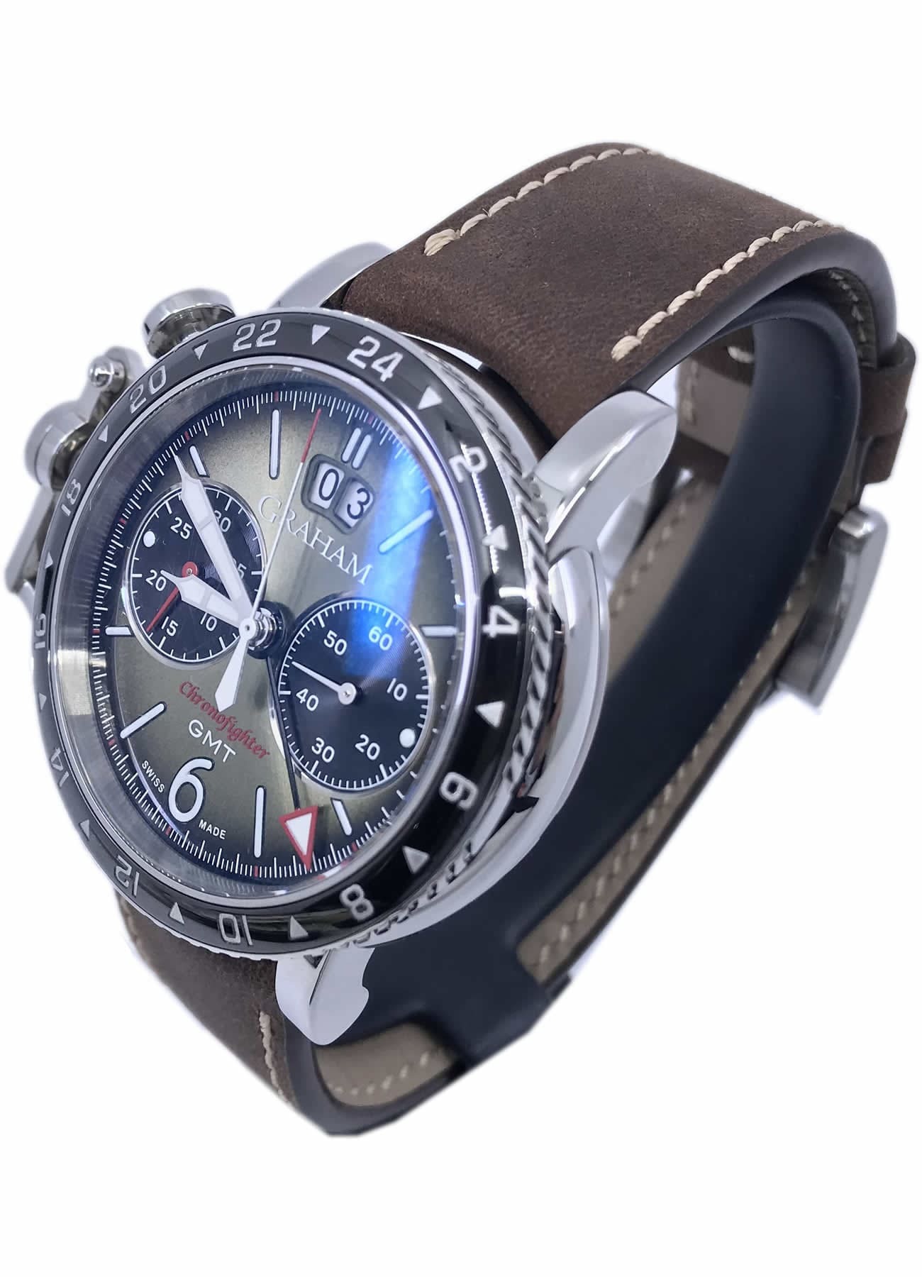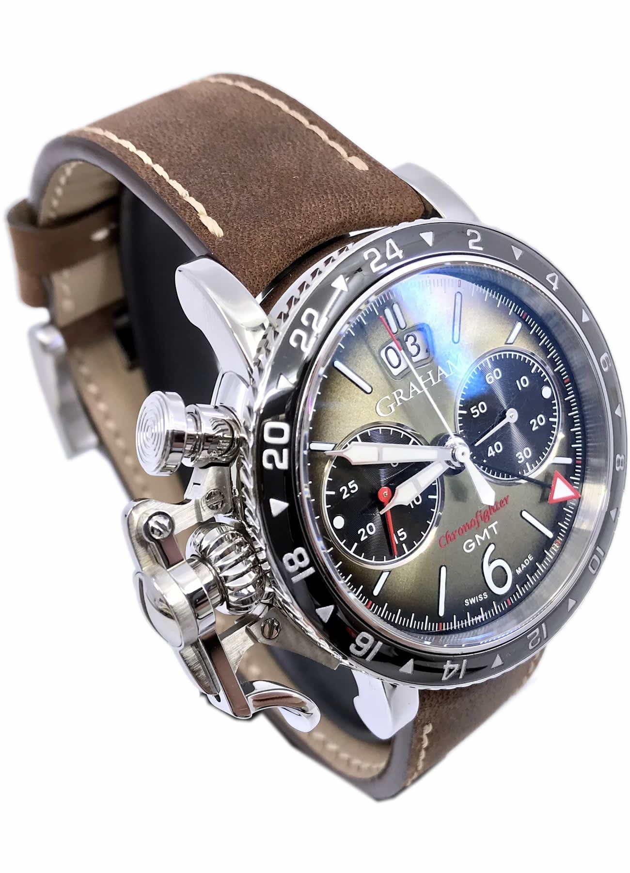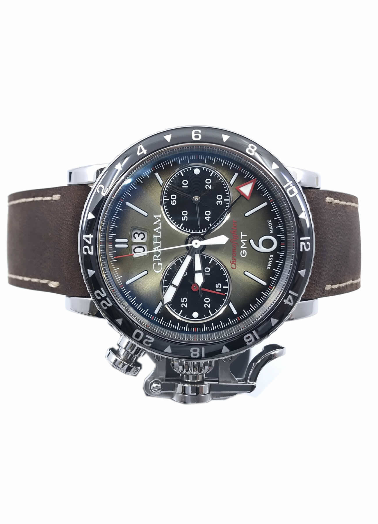 Green sunbrushed dial with radial gradient, black snailed minutes and seconds counters .White Super-LumiNova hands, numerals and indexes (Grade A, highly luminescent). GMT hand with red tip and white Super-LumiNova