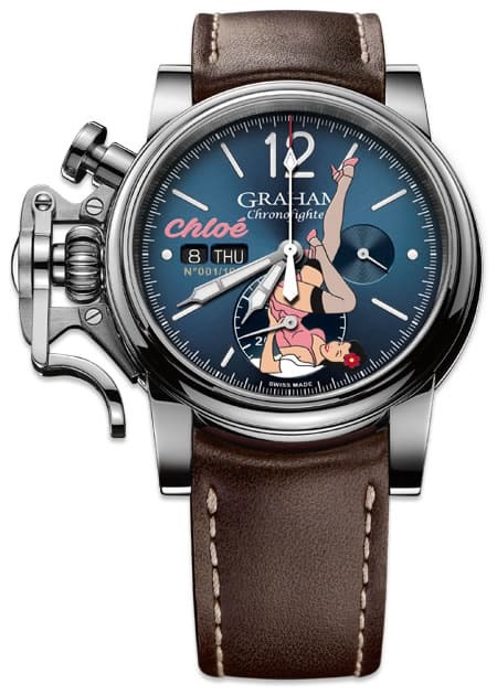 Blue sunbrushed dial with painted pin-up girl White Super-LumiNova hands, numerals and indexes Pin-up's name and limited edition serial number at 9 o'clock White varnish chrono hand with red tip Rhodiated minutes and seconds' counters hands