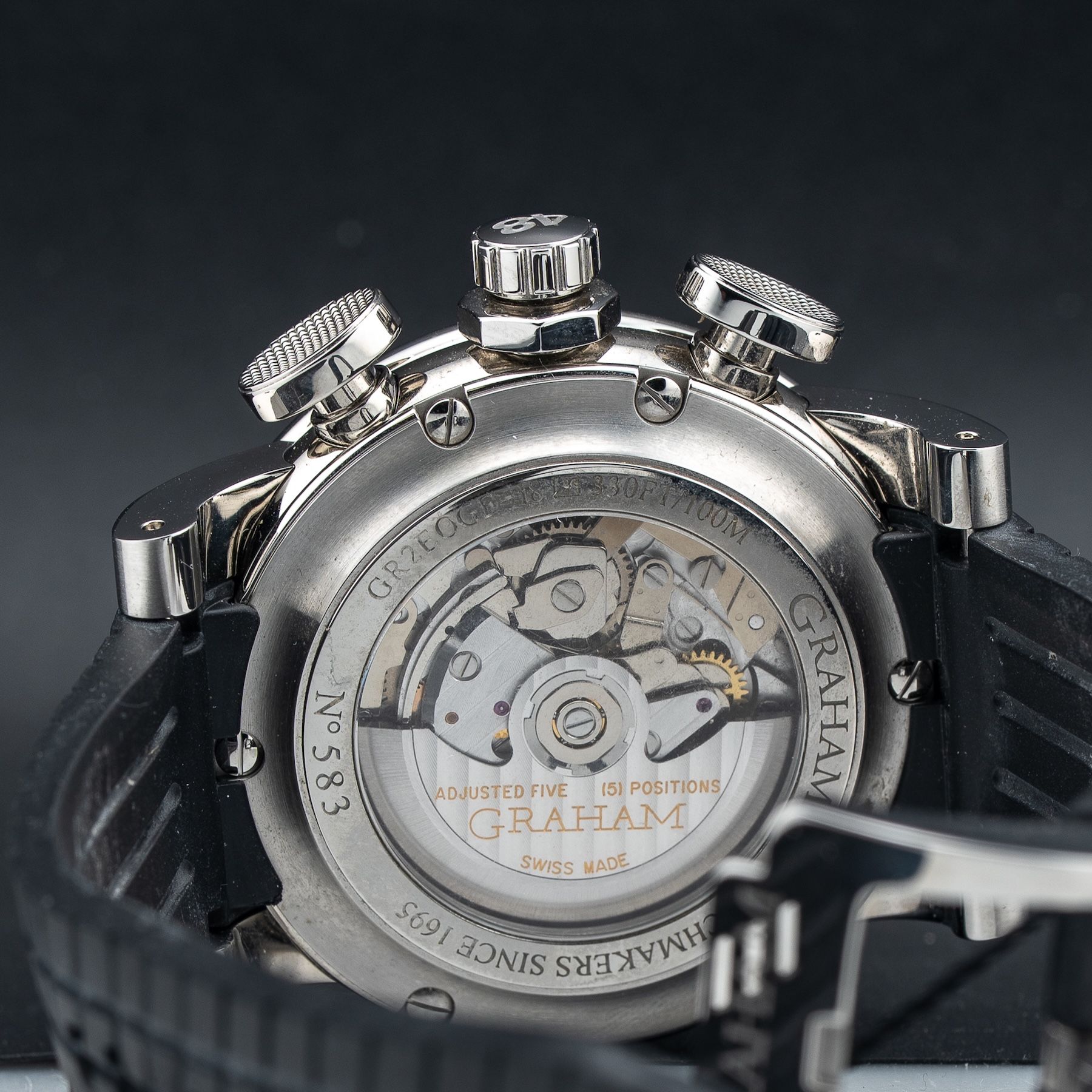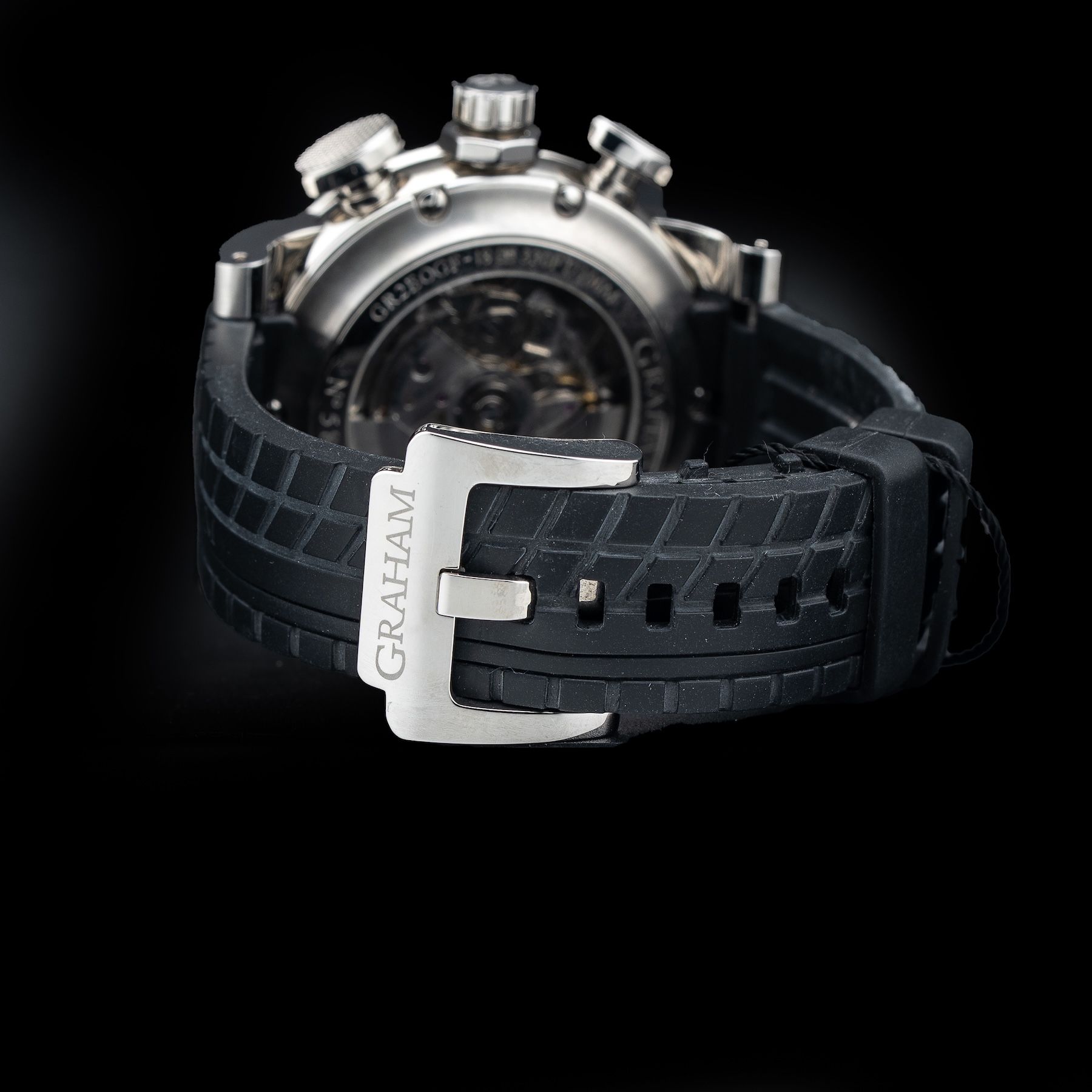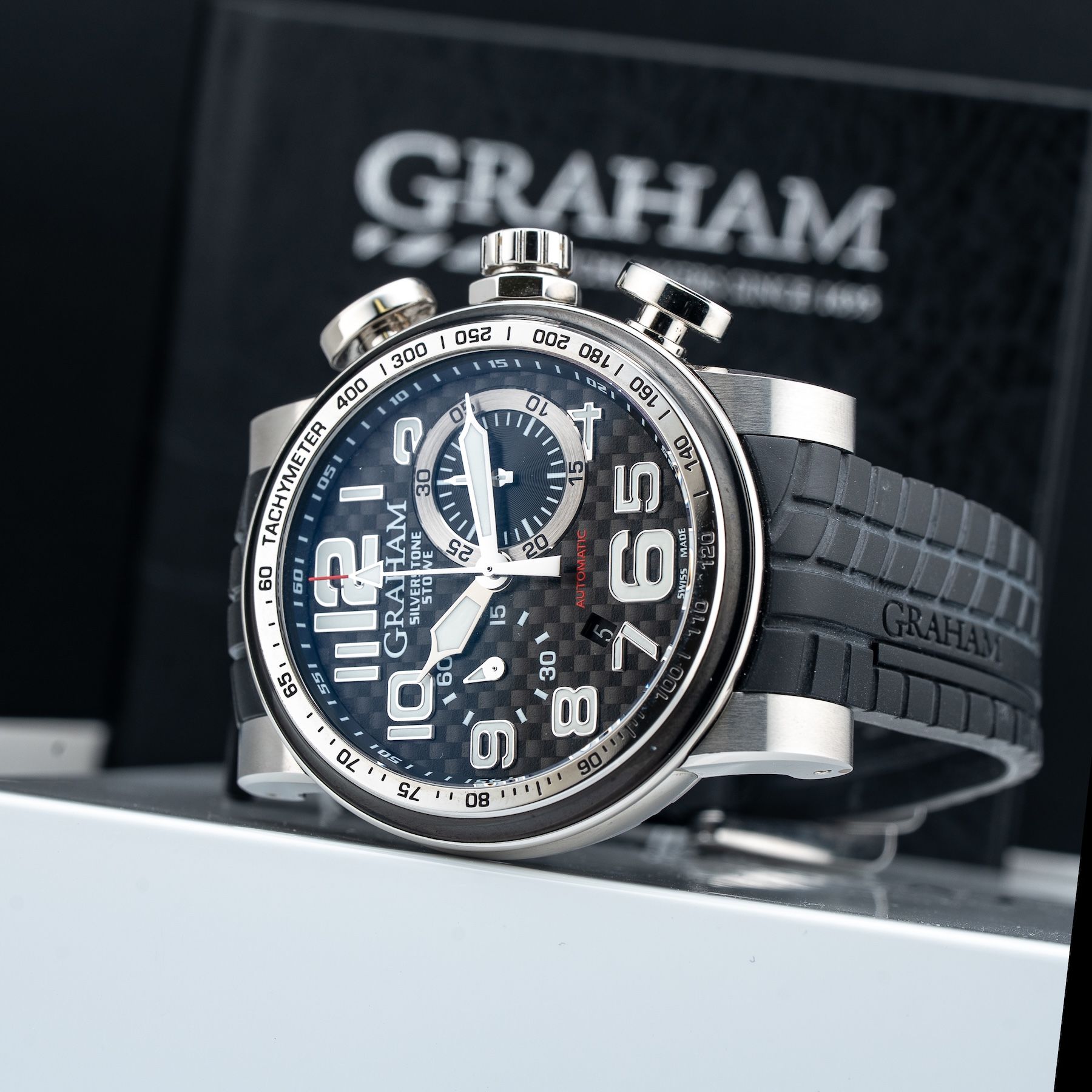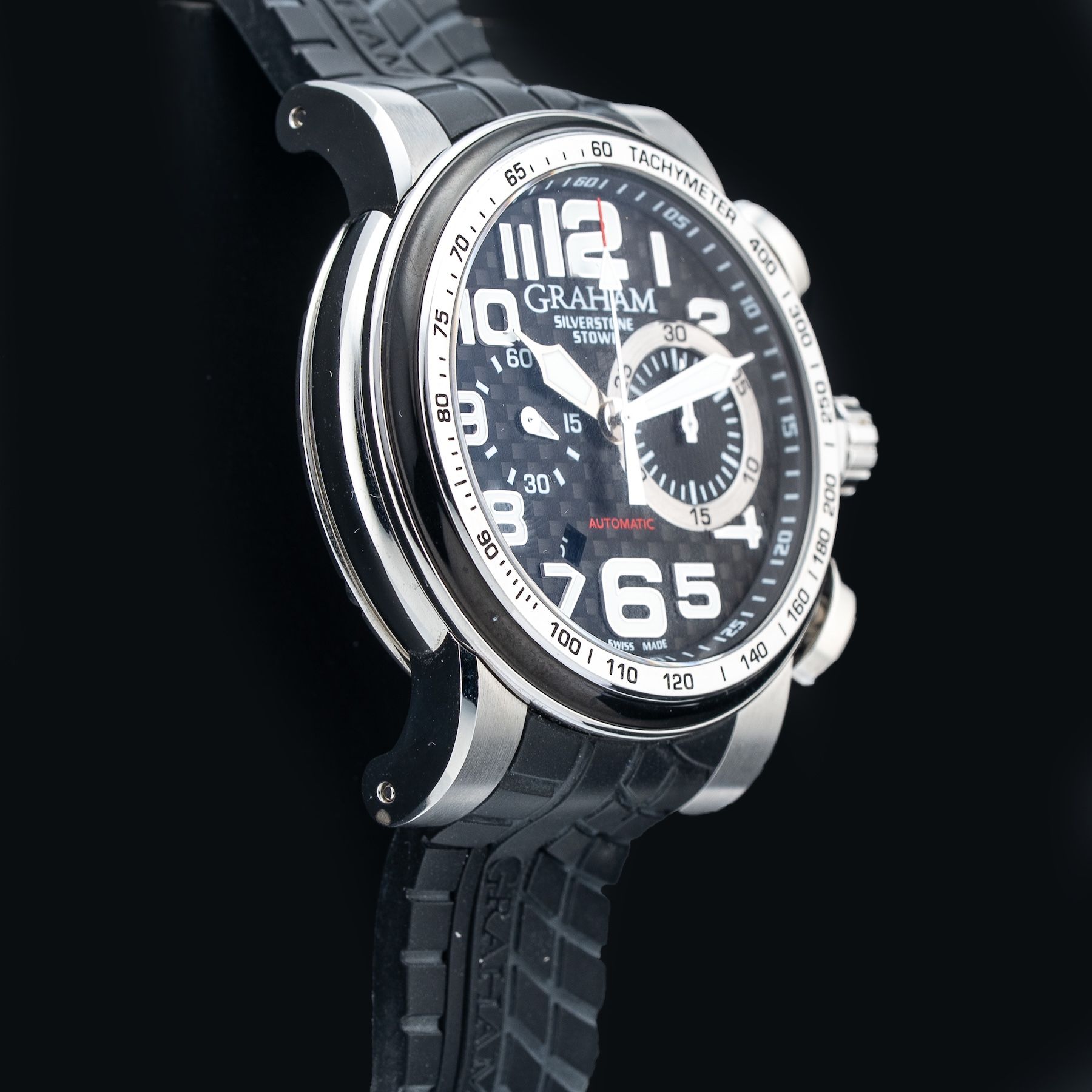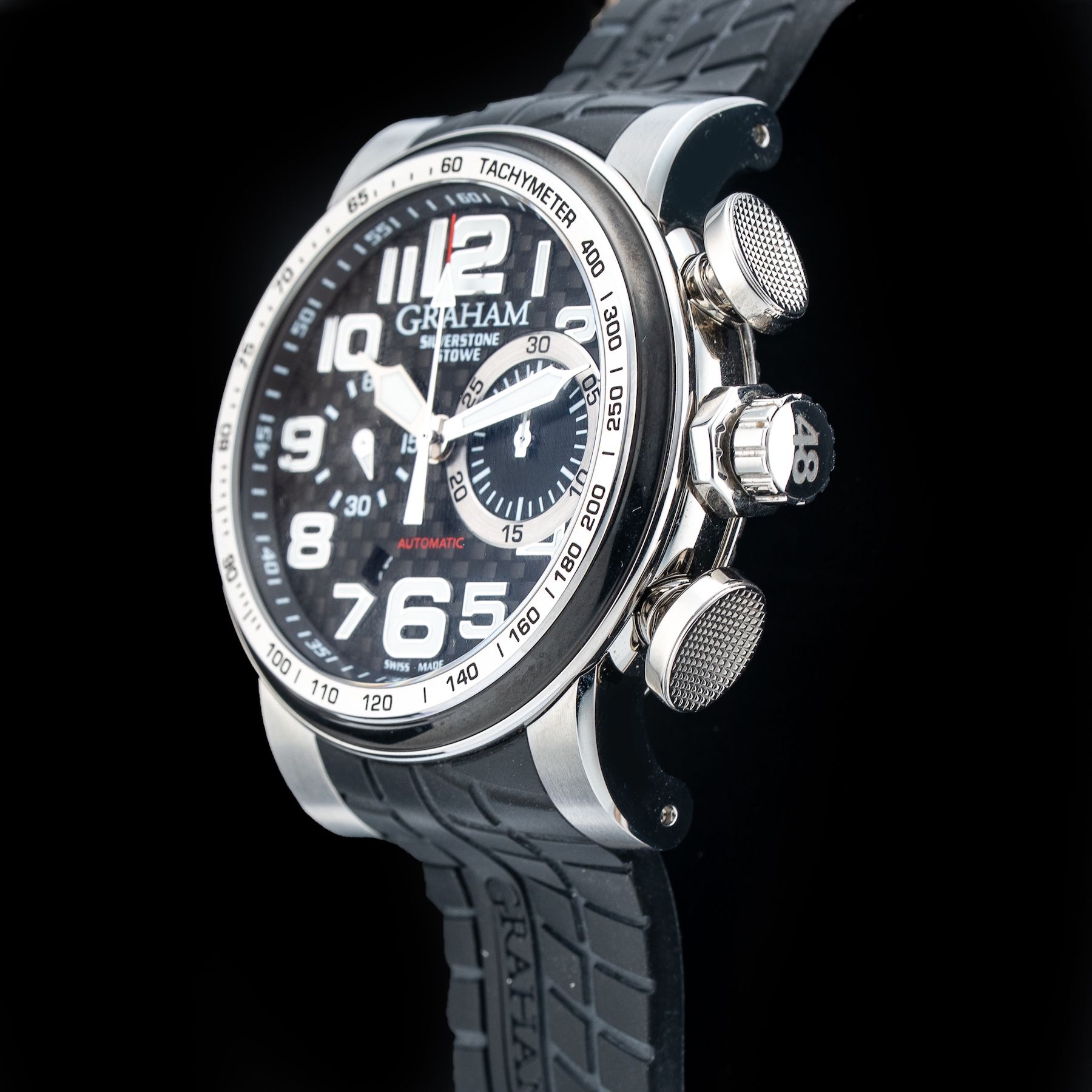 This Graham Silverstone Stowe Classic Chronograph Automatic 2BLDC.BLLA is in GREAT condition it has box, papers and warranty card not dated. This watch has been fully authenticated and certified by Exquisite Timepieces. Extra bracelet in box. Please note, the photos shown are of the actual watch you will receive.
