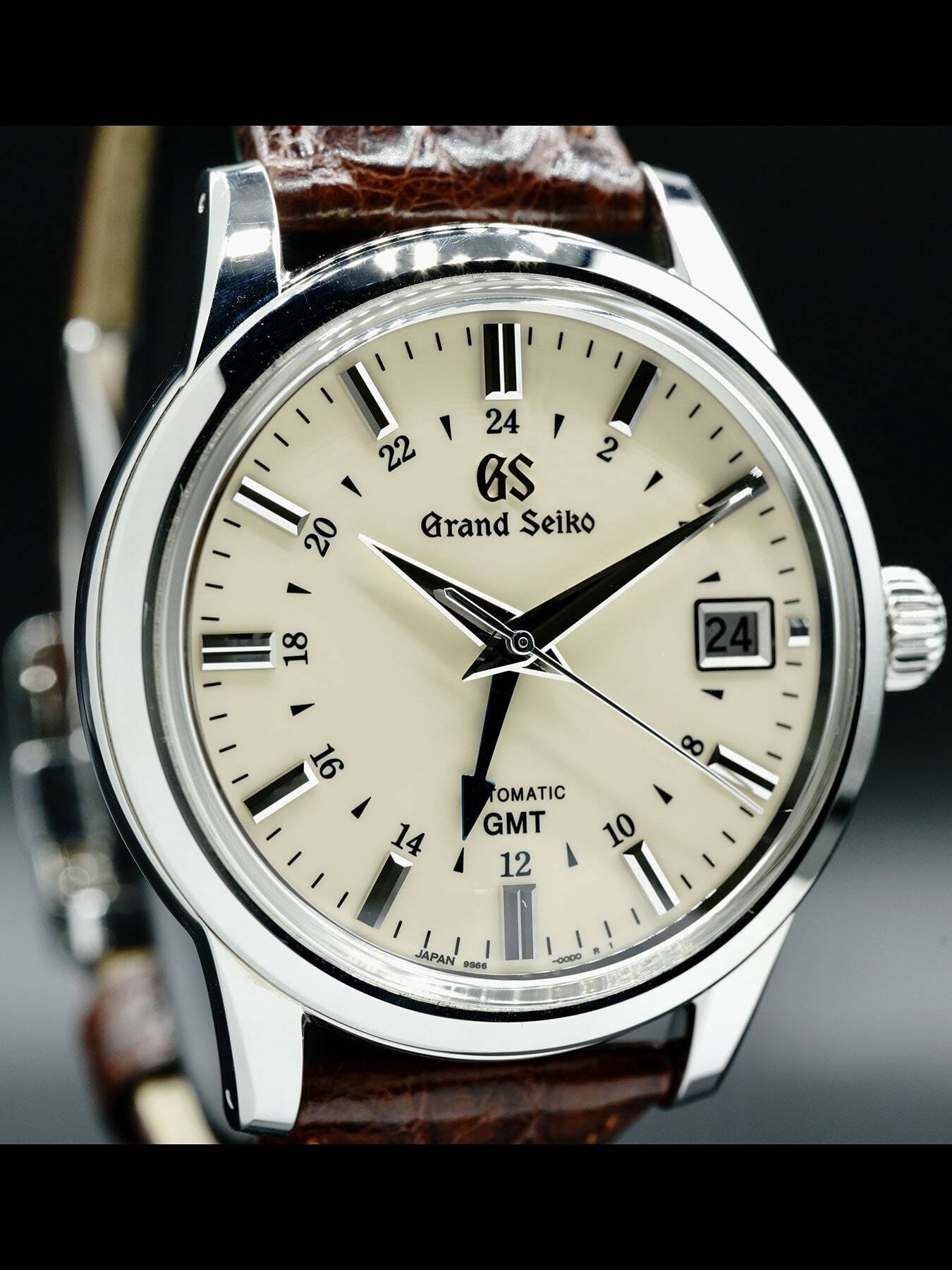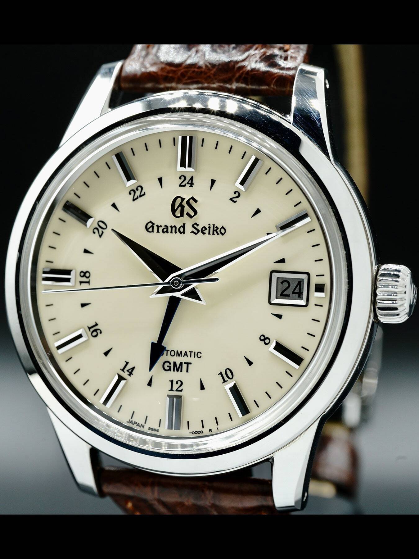 This Grand Seiko Automatic GMT features a 39.5mm stainless steel case with a transparent case back on a brown leather strap. This watch also showcases a deep ivory dial with silver-tone delta-shaped hands, index dial markers, and a date display covered by scratch resistant sapphire crystal.