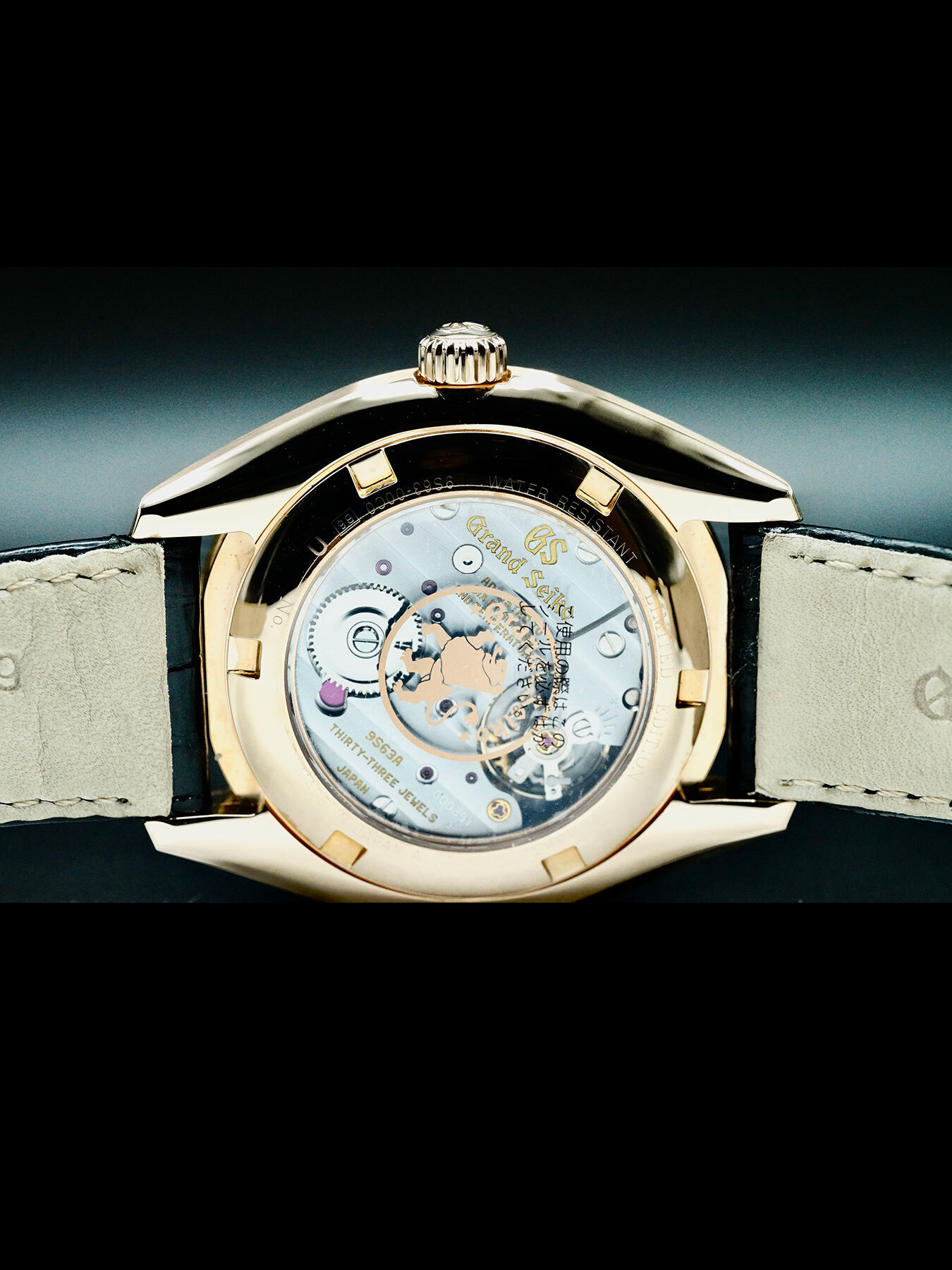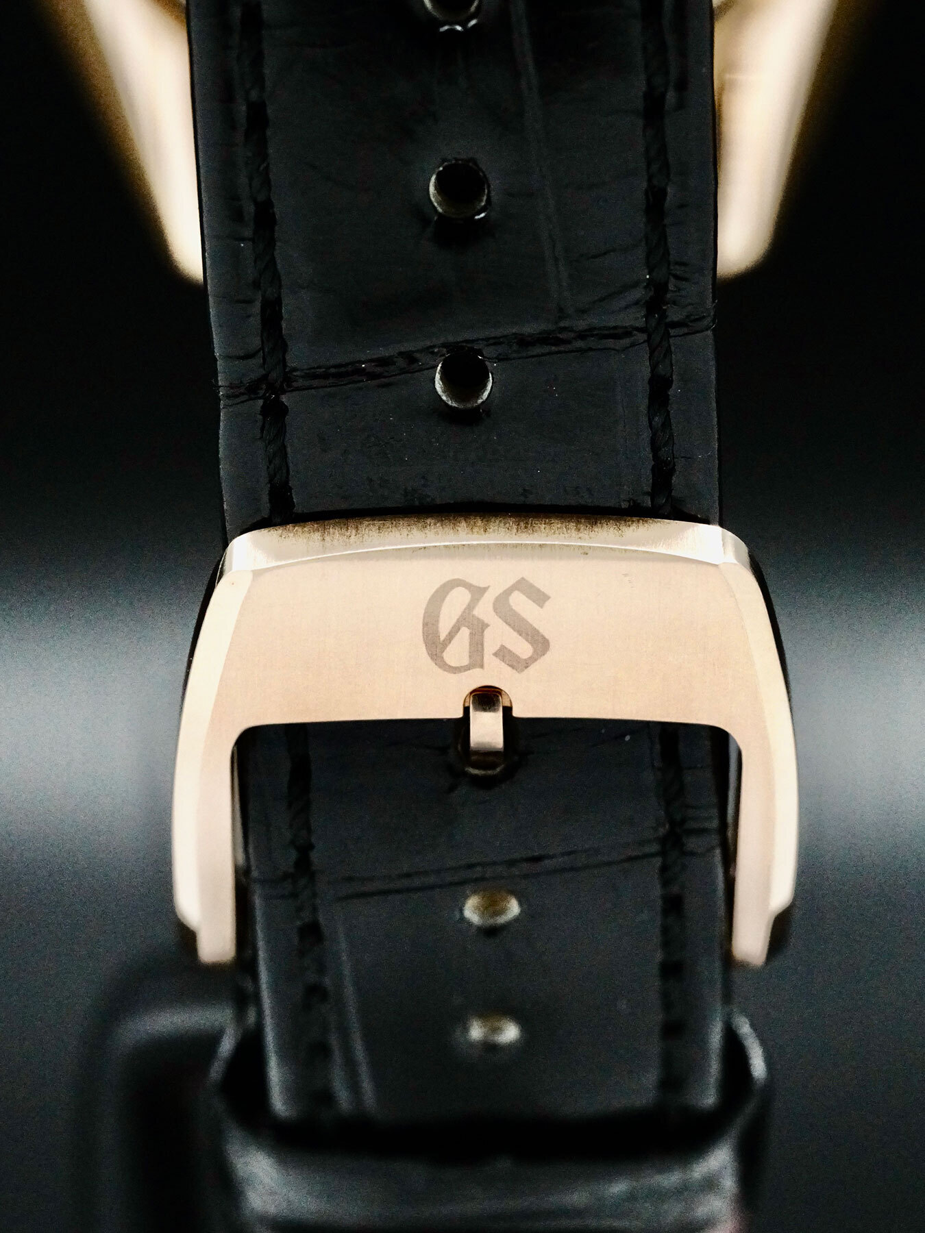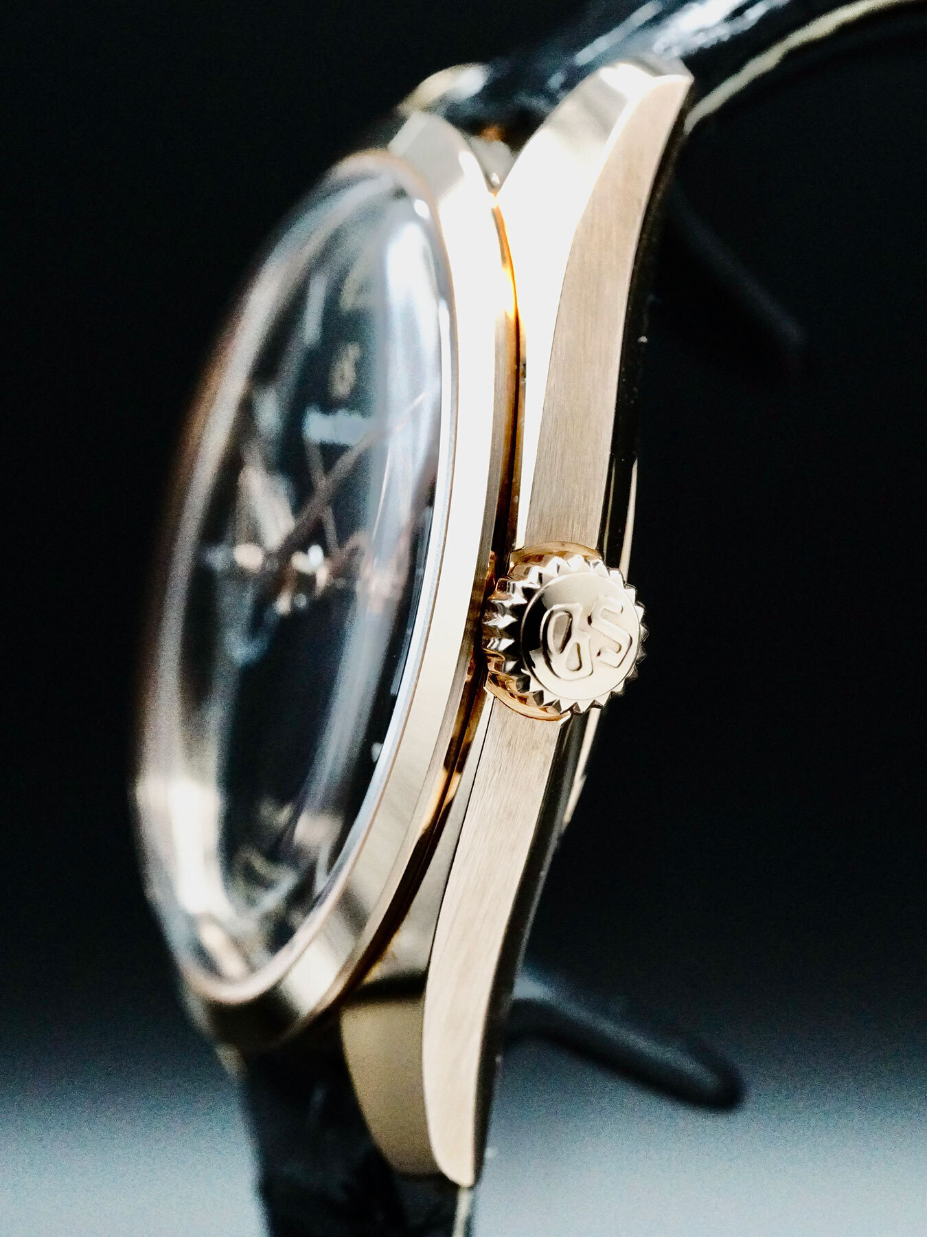 This Grand Seiko Elegance SBGK004 Black Dial Rose Gold Case is in EXCELLENT condition. This watch includes original box, instruction booklet and warranty card dated 2023. This watch has been fully authenticated and certified by Exquisite Timepieces.