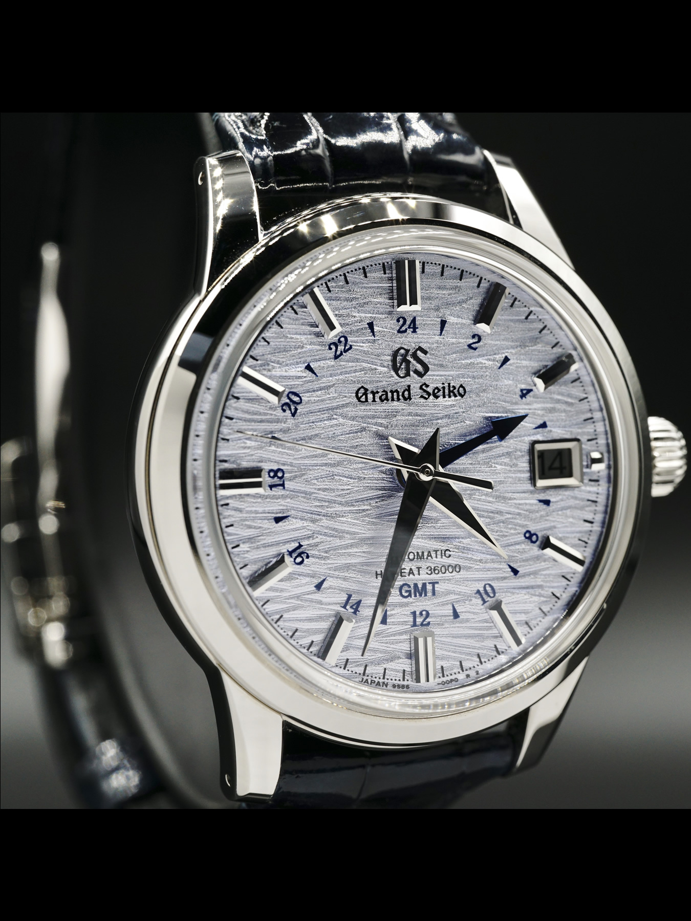 This Grand Seiko GMT Four Seasons features a 39.5mm stainless steel case. This watch also showcases a blue dial covered by scratch resistant sapphire crystal.