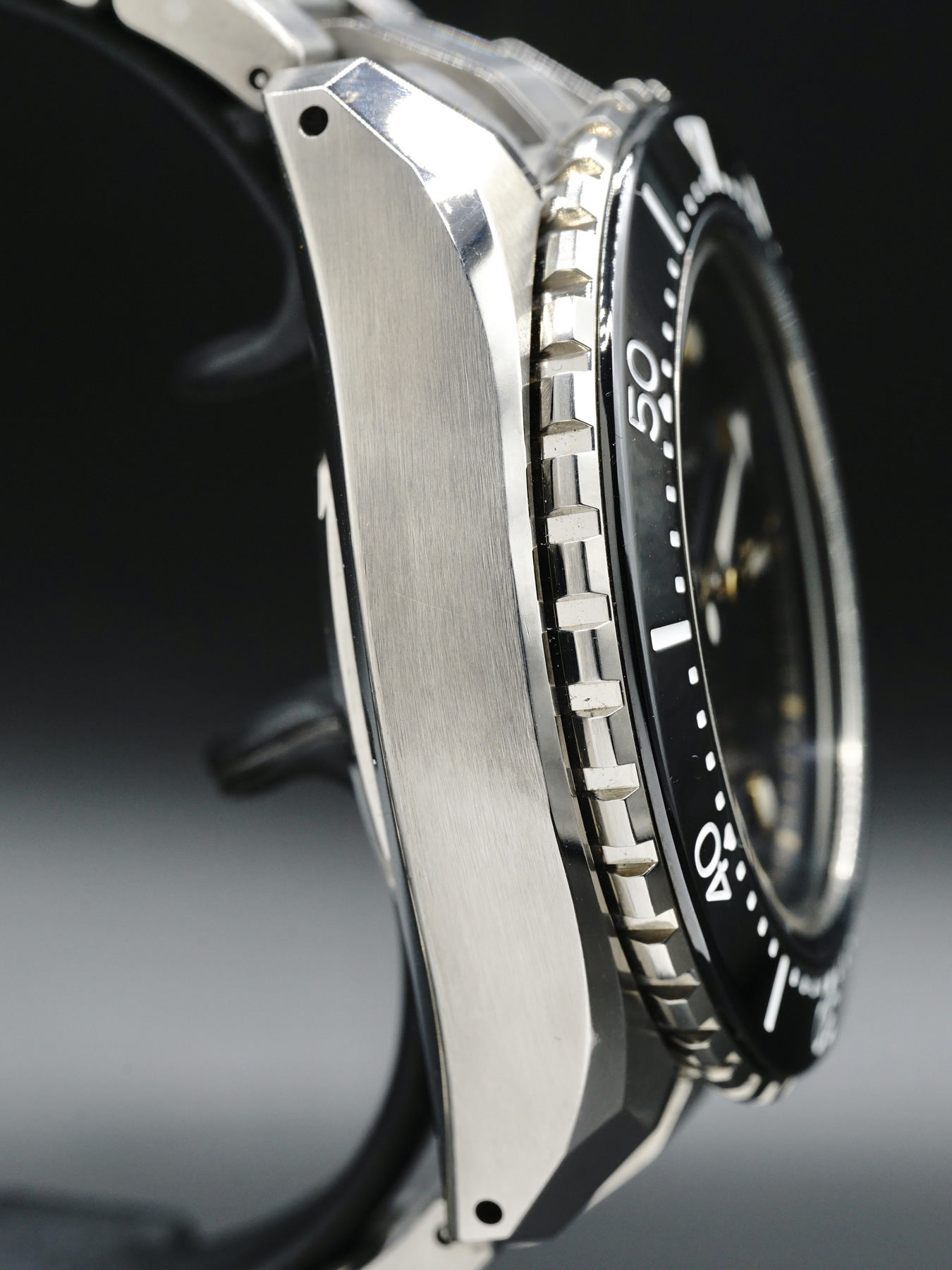 This Grand Seiko Hi-Beat 36000 Professional Diver features a 46mm high-intensity titanium case on a titanium bracelet. This watch also showcases a black dial covered by sapphire crystal.