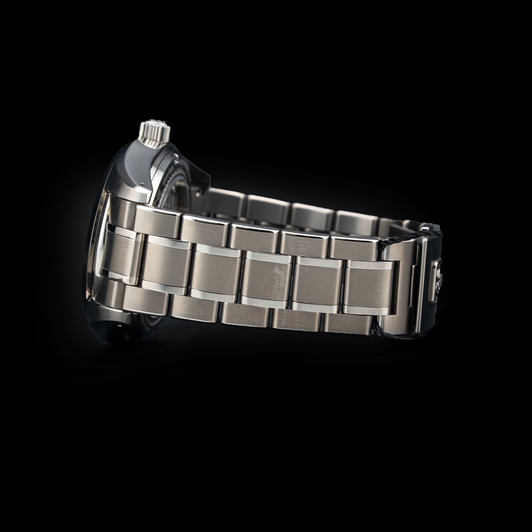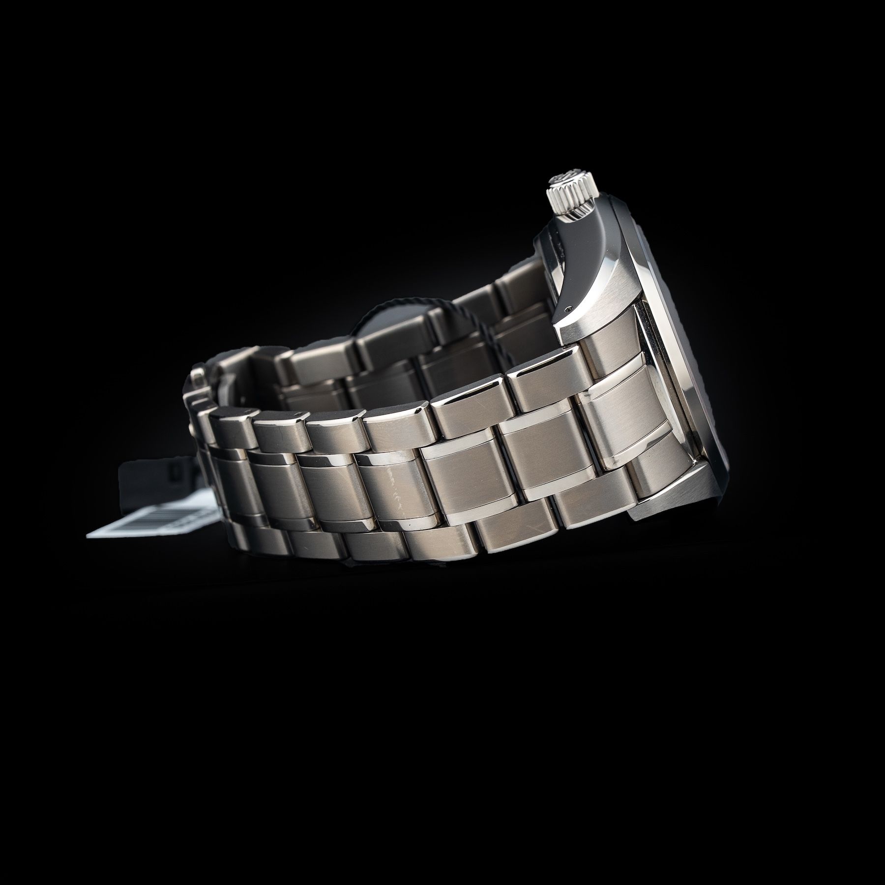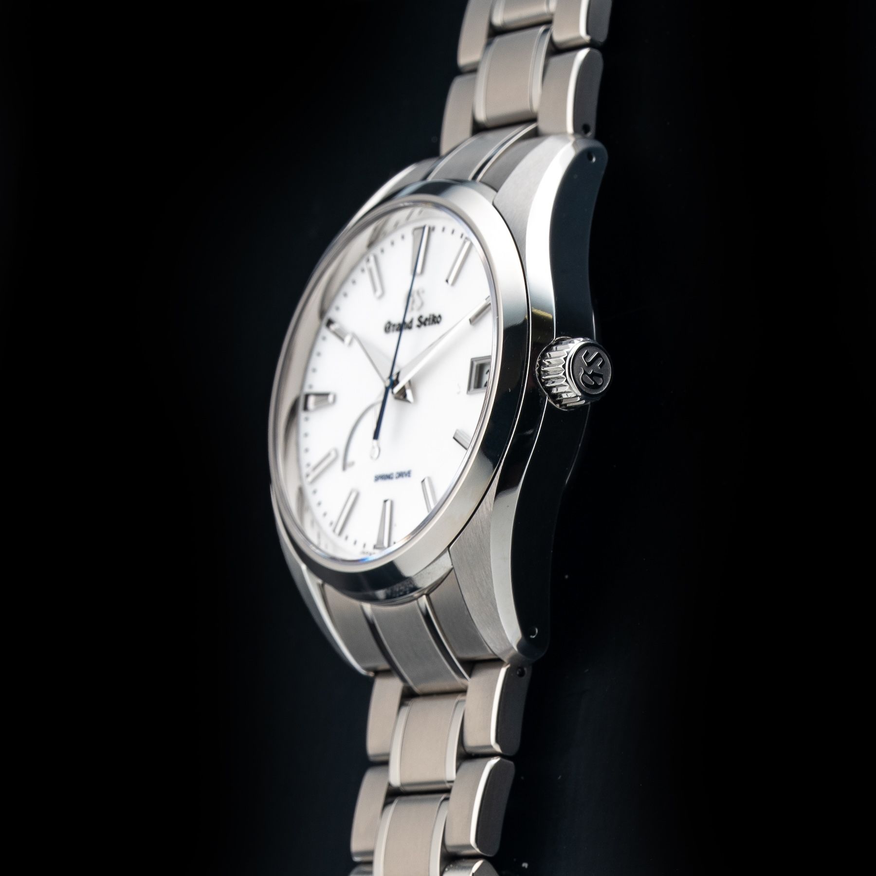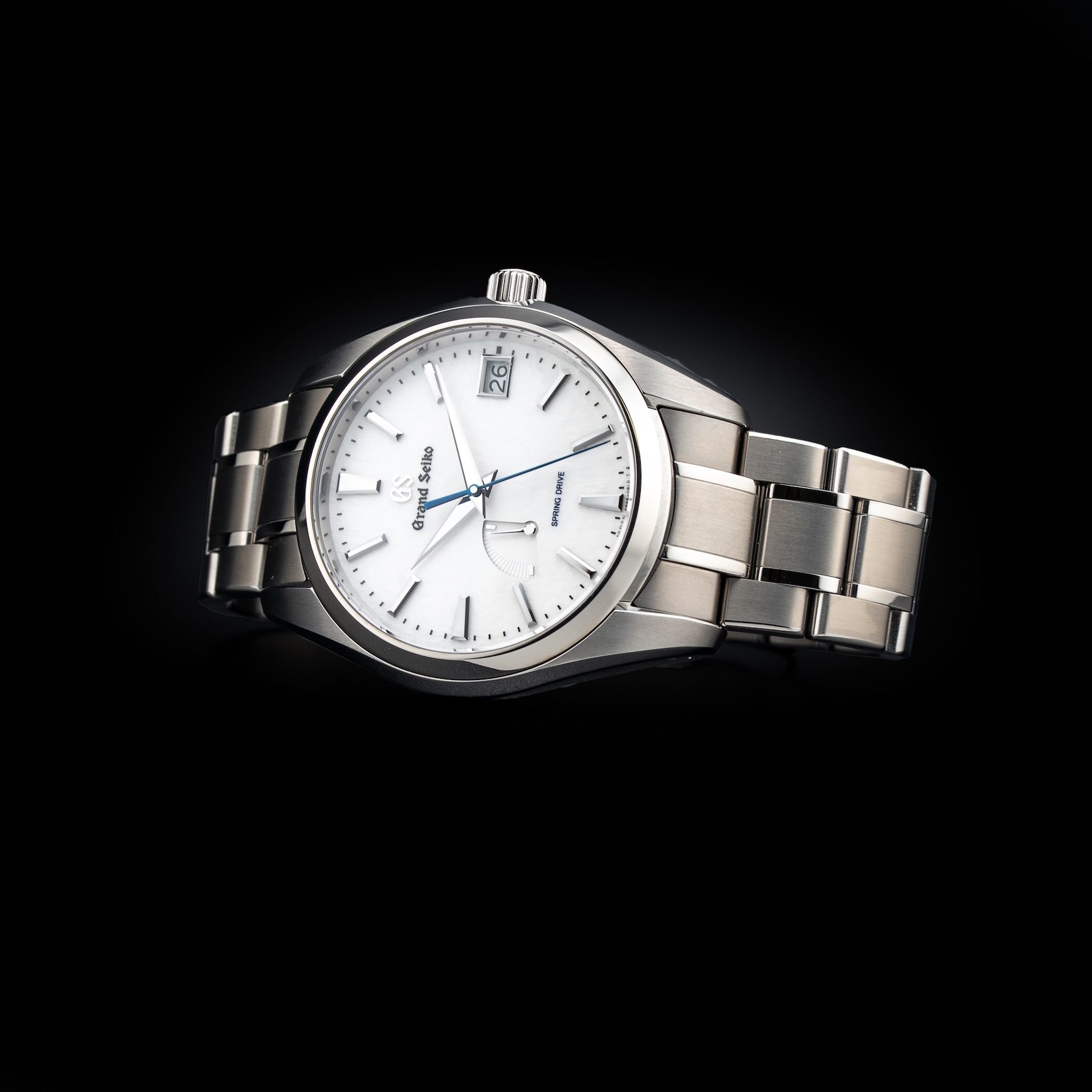 This watch features a 41mm titanium case on titanium bracelet. This watch also sports a white dial. Powered by a spring drive movement. Water resistance up to 100 meters.