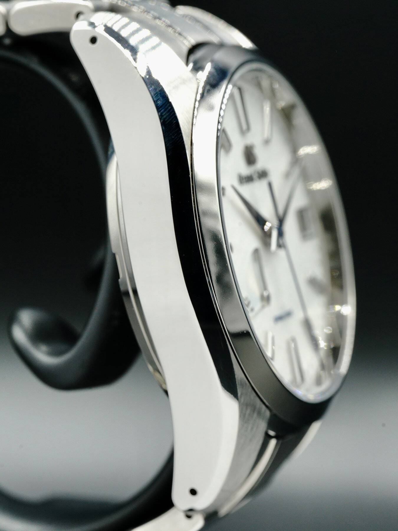 This Grand Seiko Spring Drive Snowflake features a 41mm high-intensity titanium case with an exhibition case back on a titanium bracelet. This watch also sports a white "snowflake" dial with Delta shaped hands, index dial markers, power reserve indicator, and date display covered by anti-reflective, scratch resistant sapphire crystal.