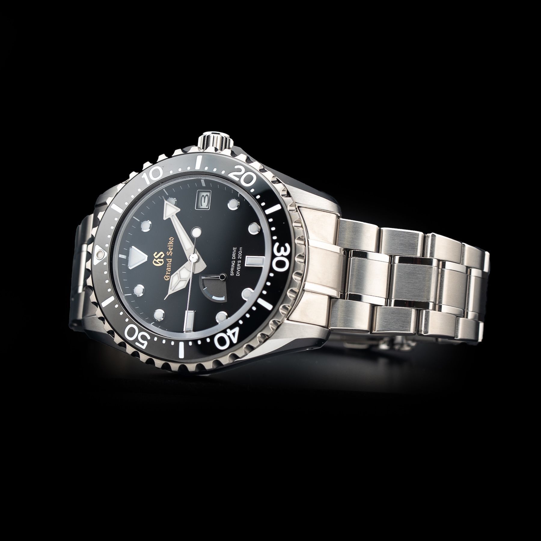 - This timepiece features a 44mm titanium case paired with a high quality titanium bracelet. It showcases a distinctive black dial and is powered by a precise spring drive winding movement. The watch is designed with a water resistance of up to 200m.