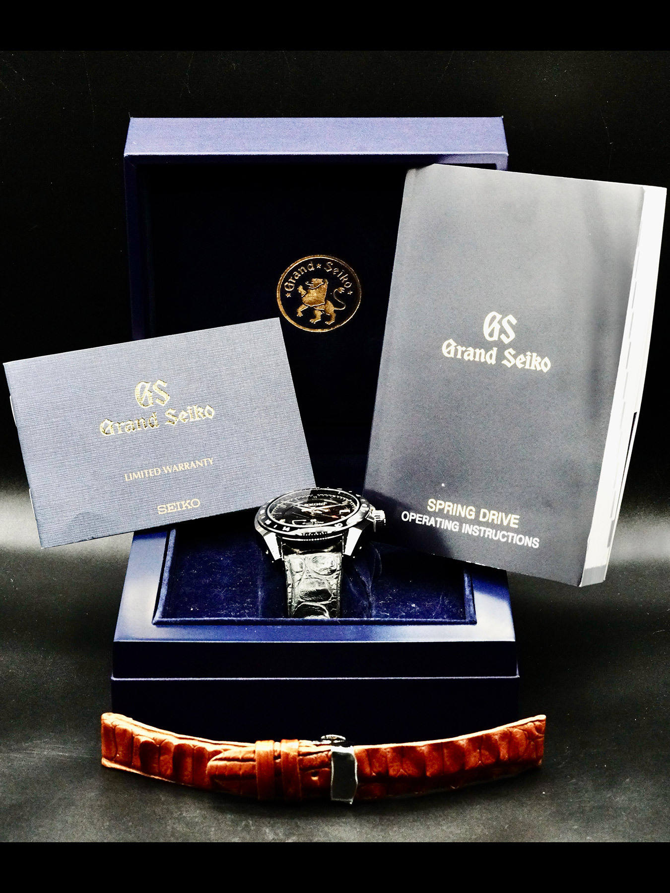 This Grand Seiko Spring Drive Sports SBGE037G is in EXCELLENT condition. This watch includes its original box, operating instructions, and limited warranty dated for April 2023. Extra brown leather strap.