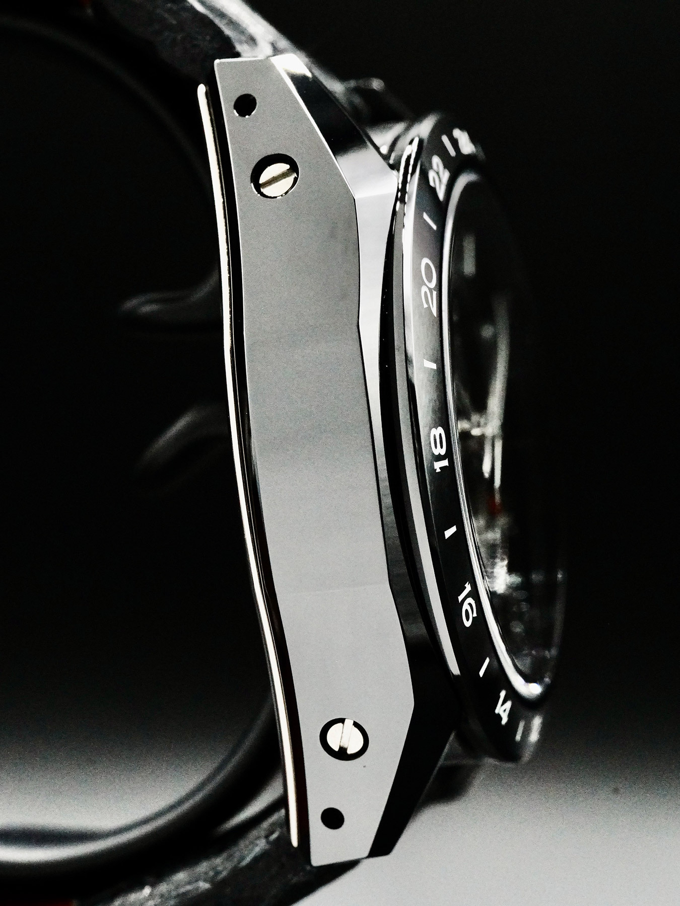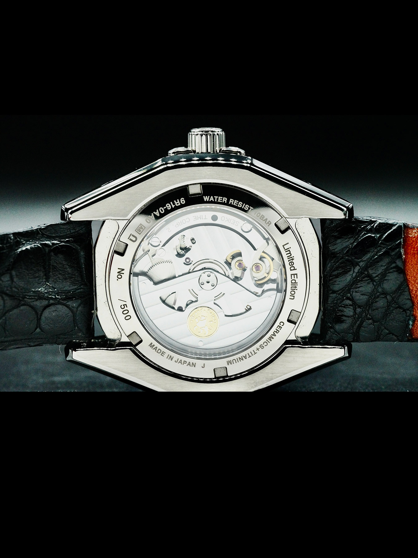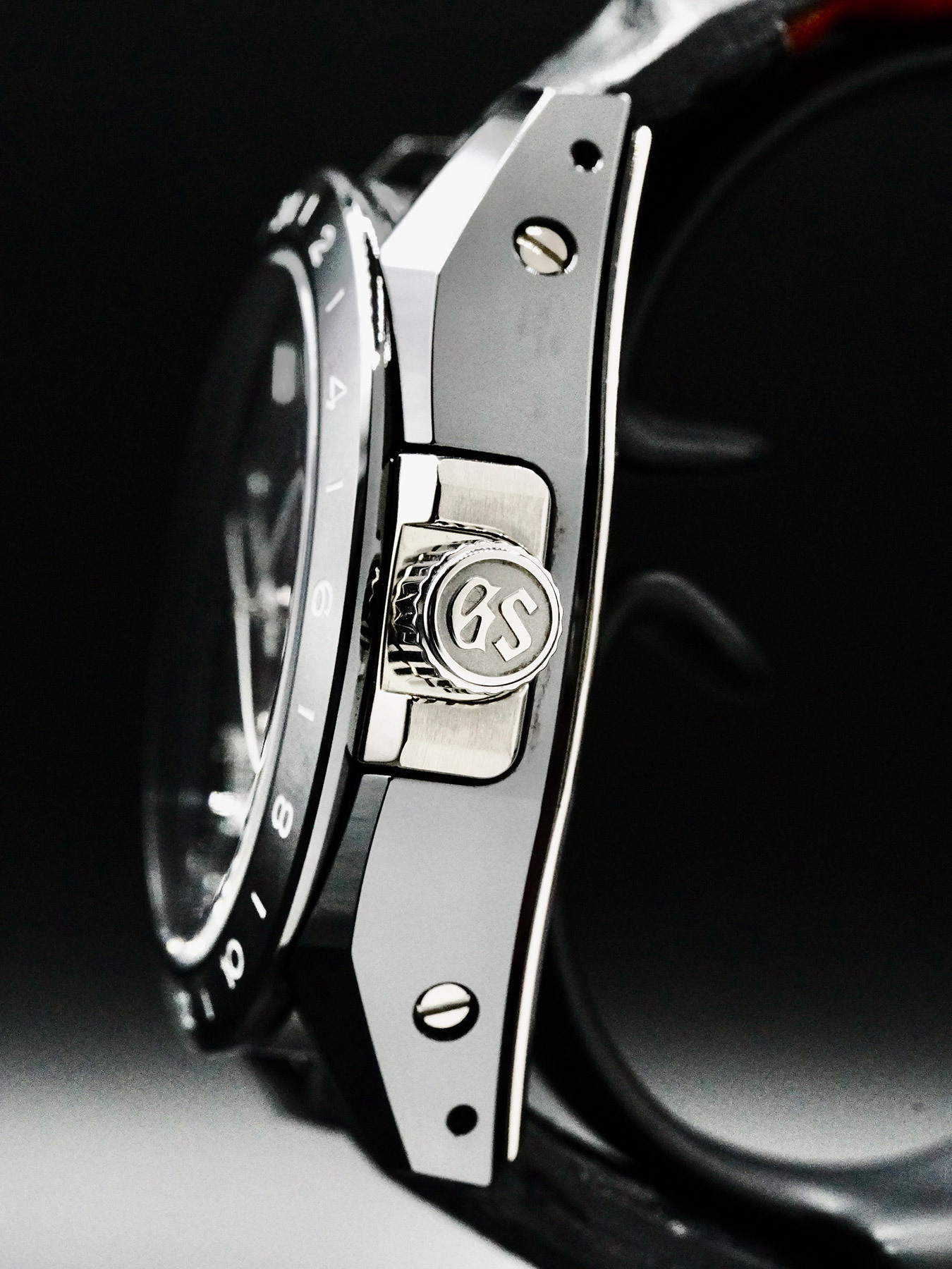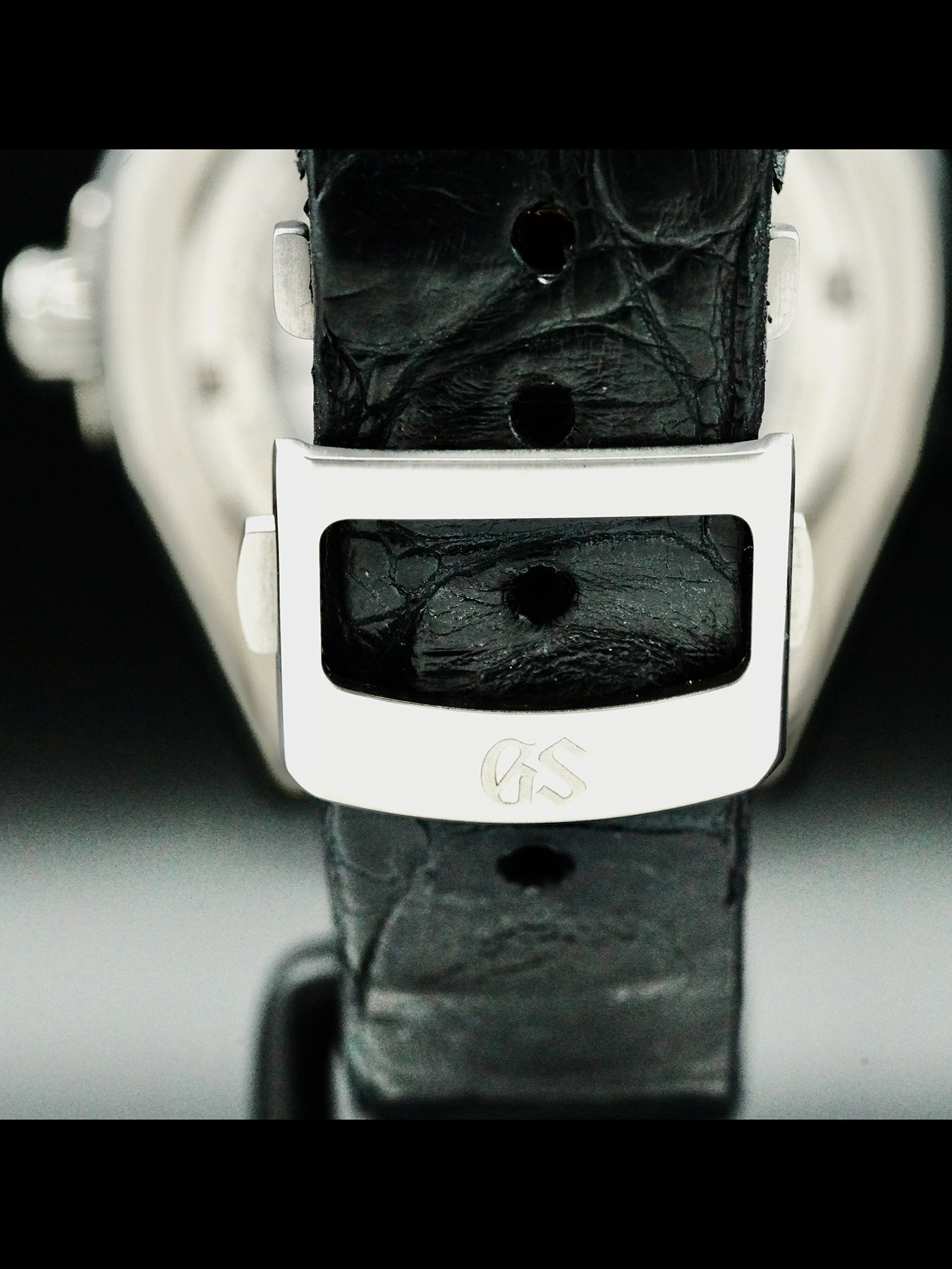 This Grand Seiko Spring Drive Sports features a 46.4mm high-intensity titanium and ceramic case with a display case back on a black leather strap. This watch also sports a black dial with silver hands and index dial markers covered by scratch resistant sapphire crystal.
