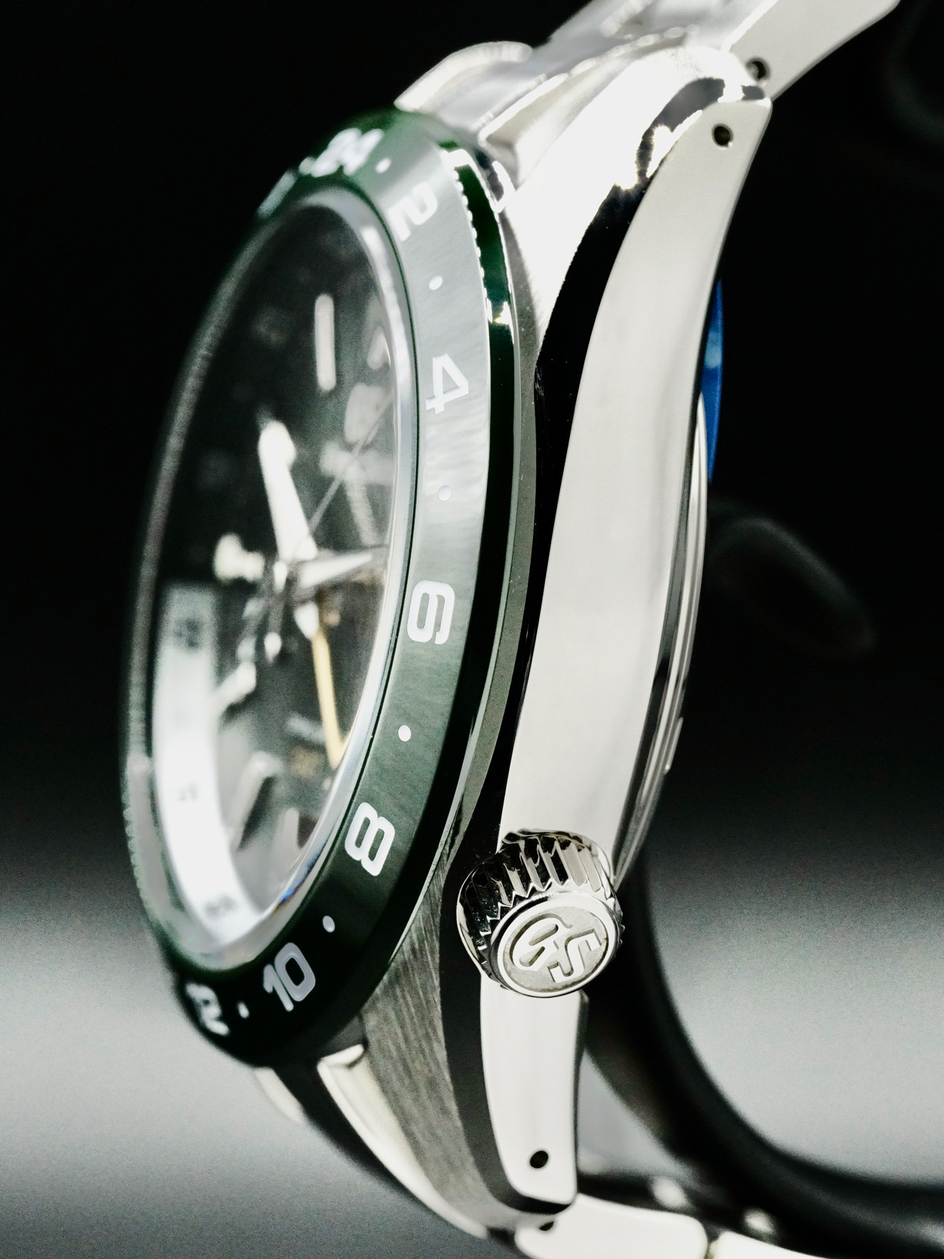 This Grand Seiko Sport GMT features a 40.5mm stainless steel case with a solid case back on a stainless steel bracelet. This watch also sports a green dial with luminous hands and index dial markers covered by scratch resistant sapphire crystal.