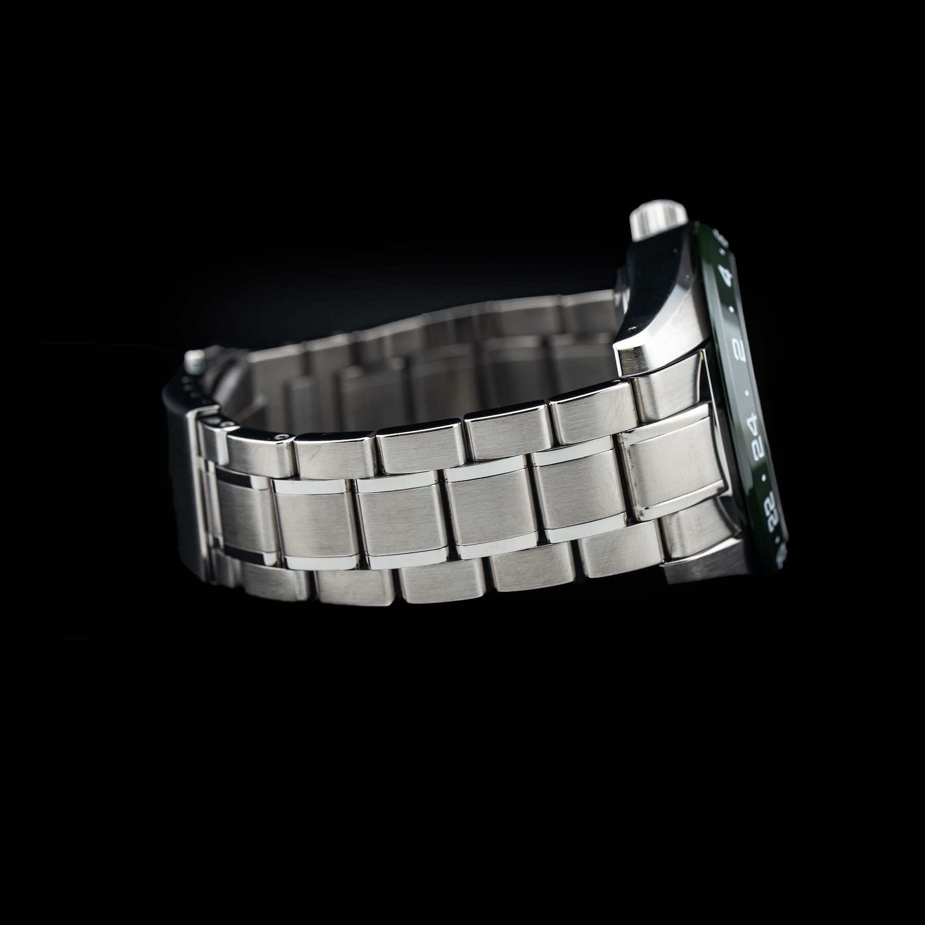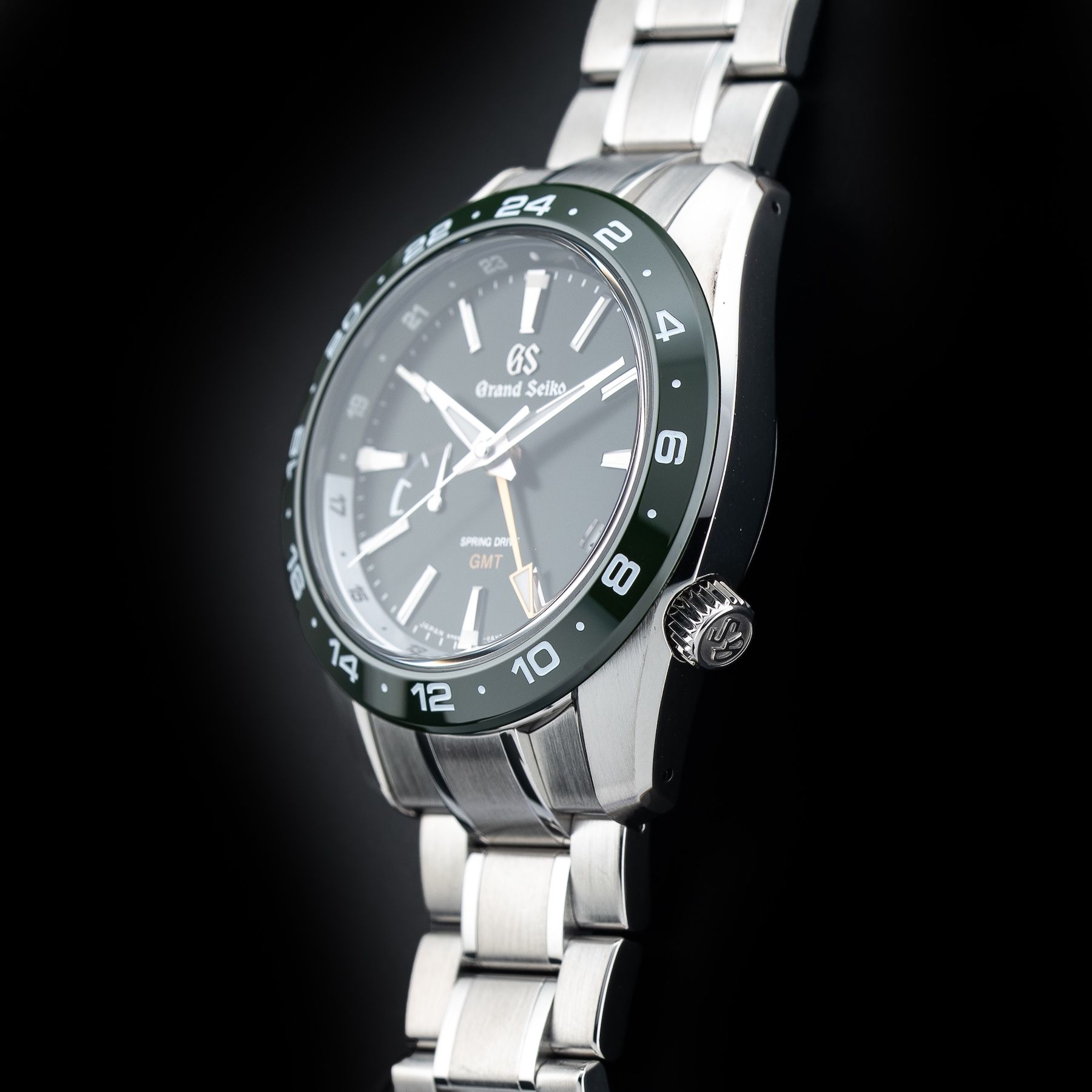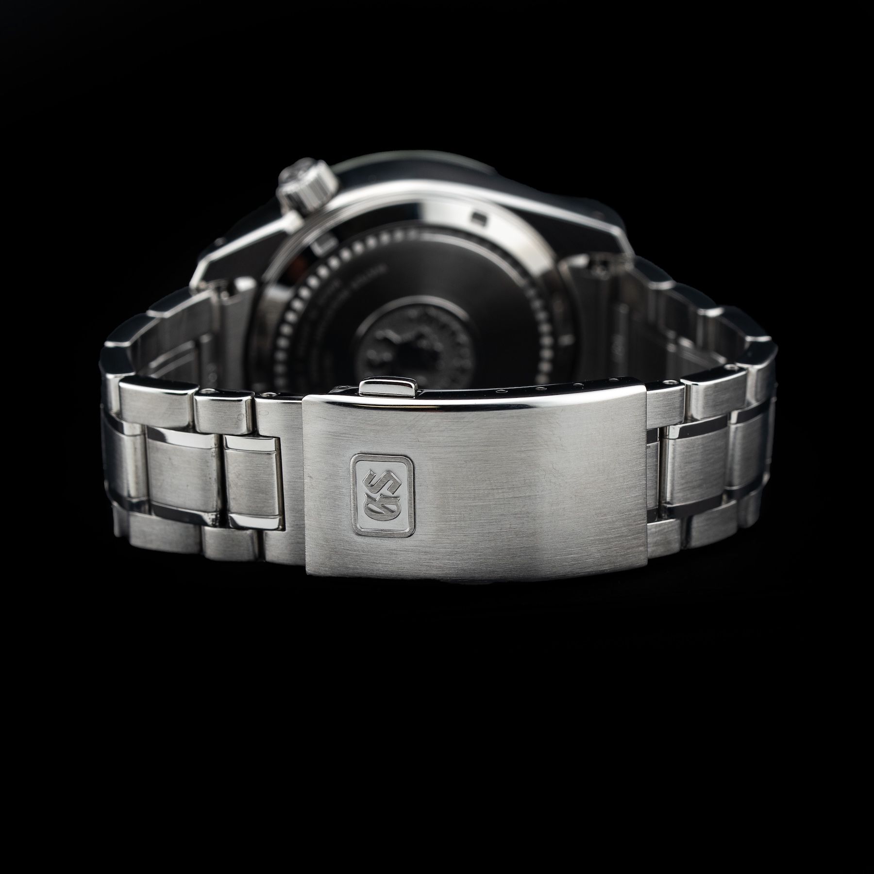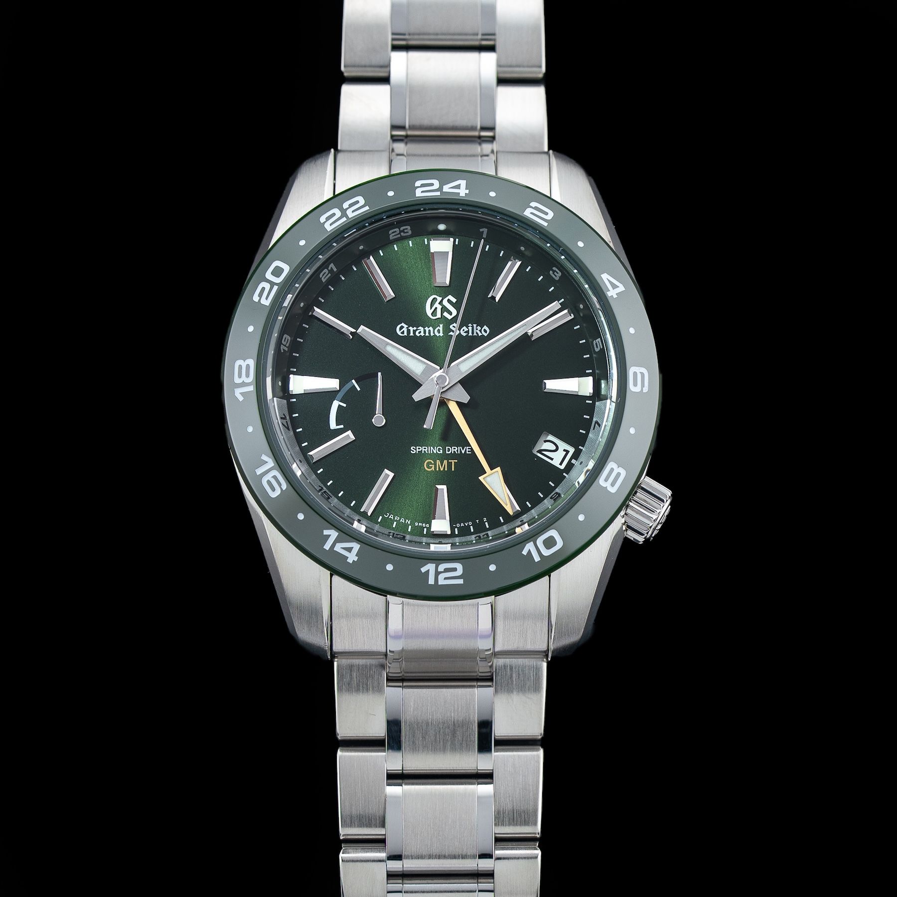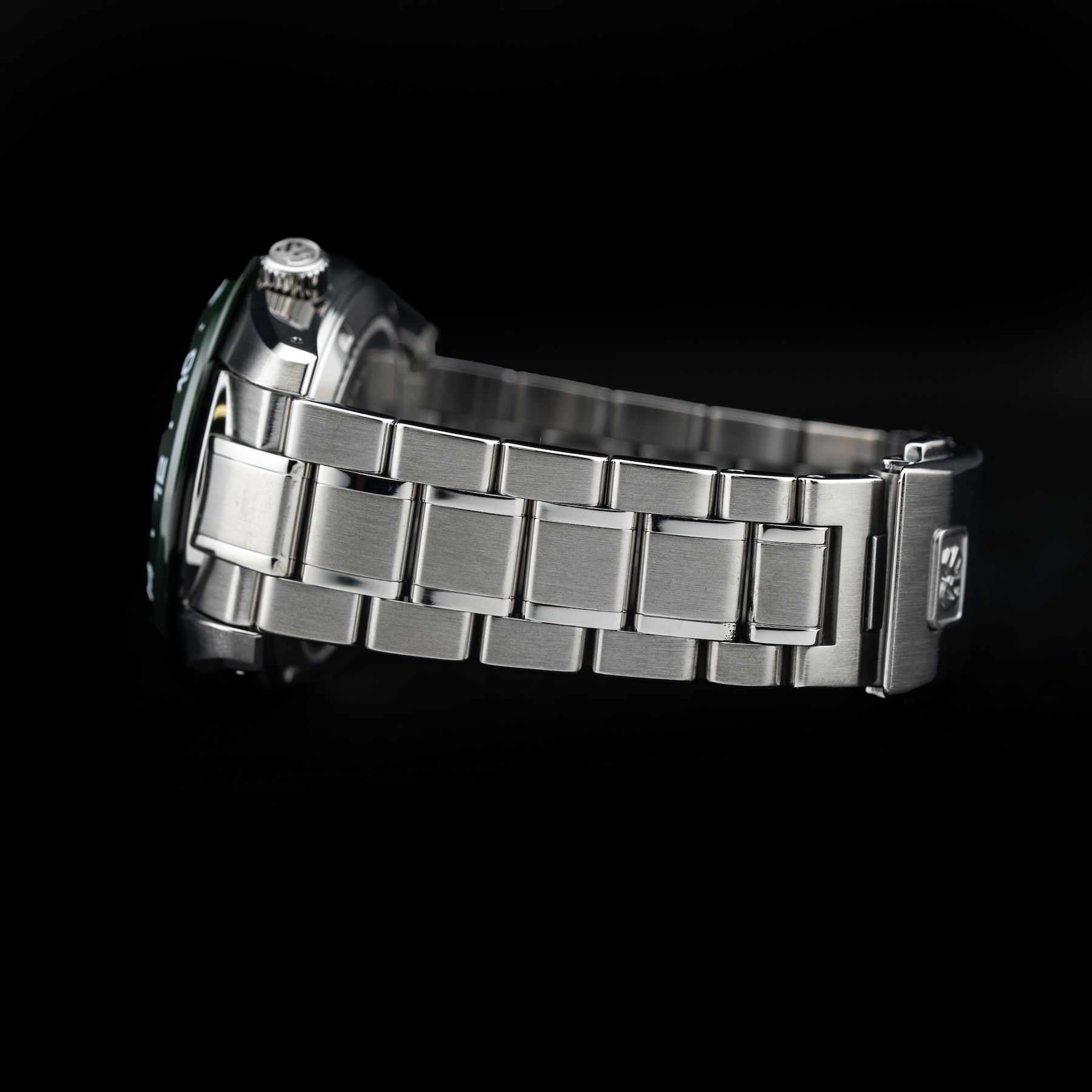 This watch features a 40mm stainless steel case on stainless steel bracelet. This watch also sports a green dial. Powered by a spring drive movement. Water resistance up to 200 meters.