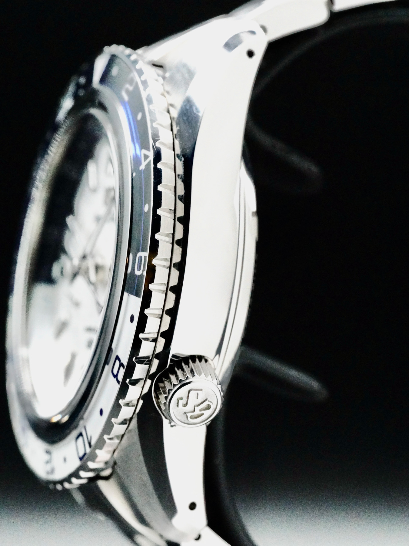 This watch features a 44 mm stainless steel case and bracelet. This watch also sports a white dial. Powered by a spring drive automatic with manual winding movement. Water resistance up to 200 meters.