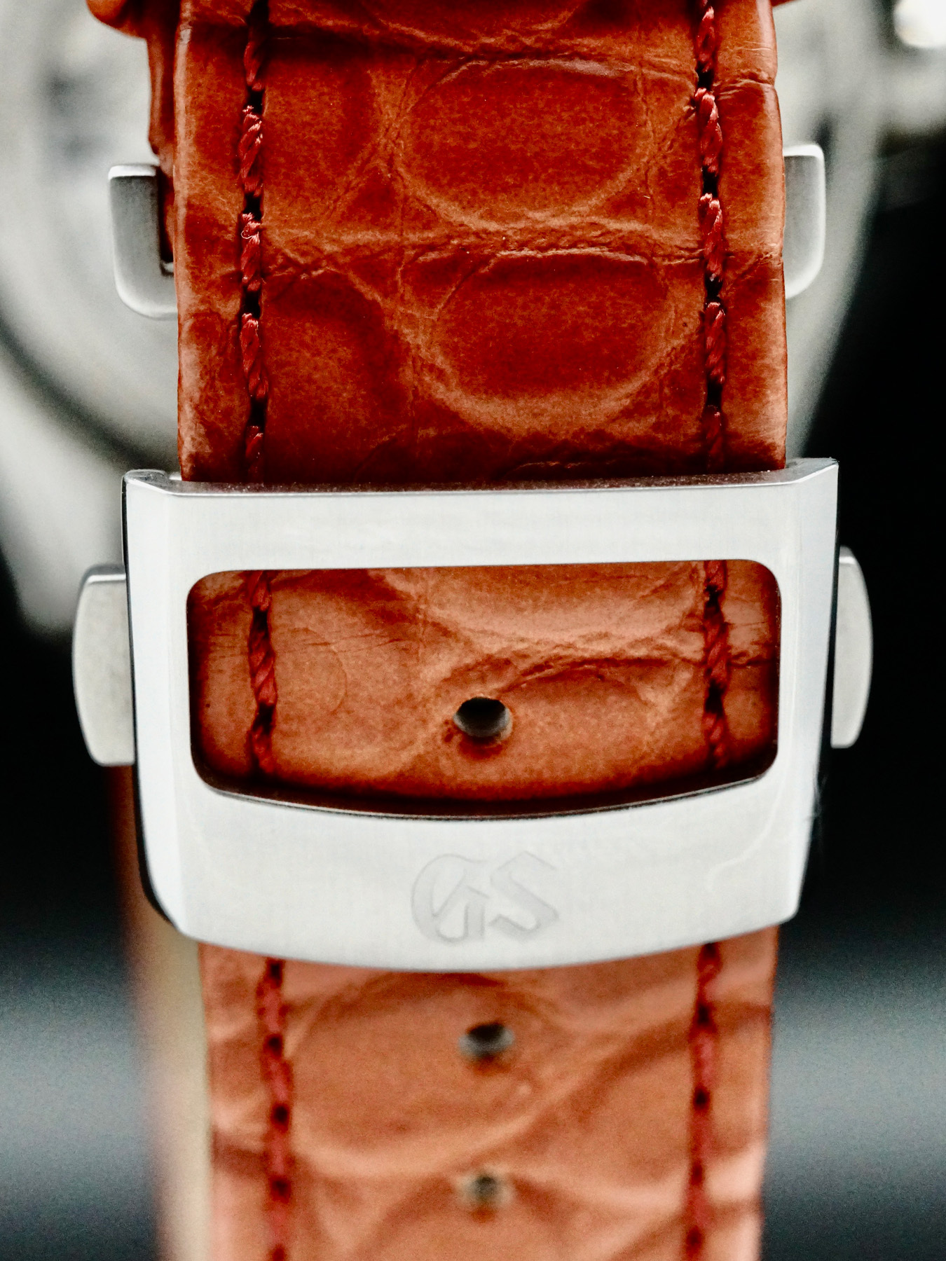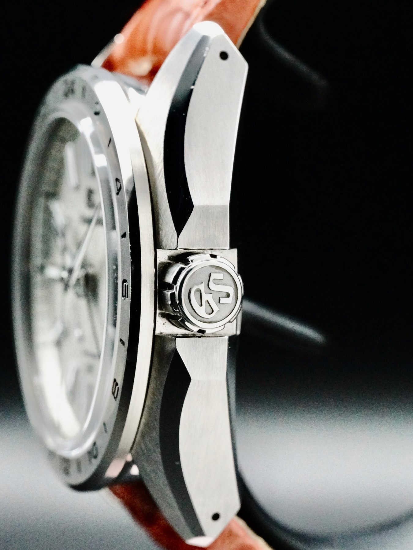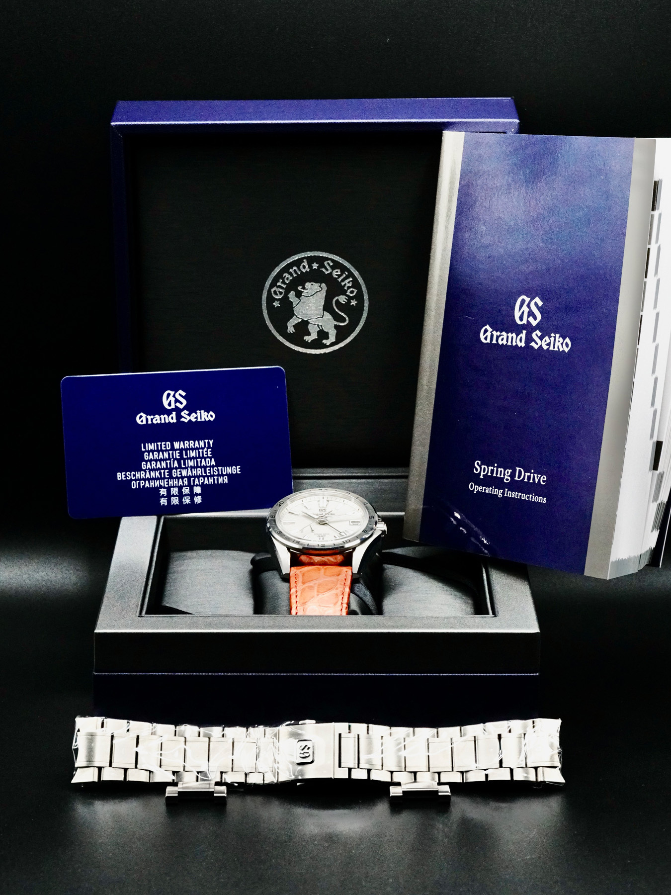 This Grand Seiko SBGE285 is in GOOD condition. This watch includes its original box, operating instructions, and warranty card dated for October 2022. Extra titanium bracelet and bracelet links.