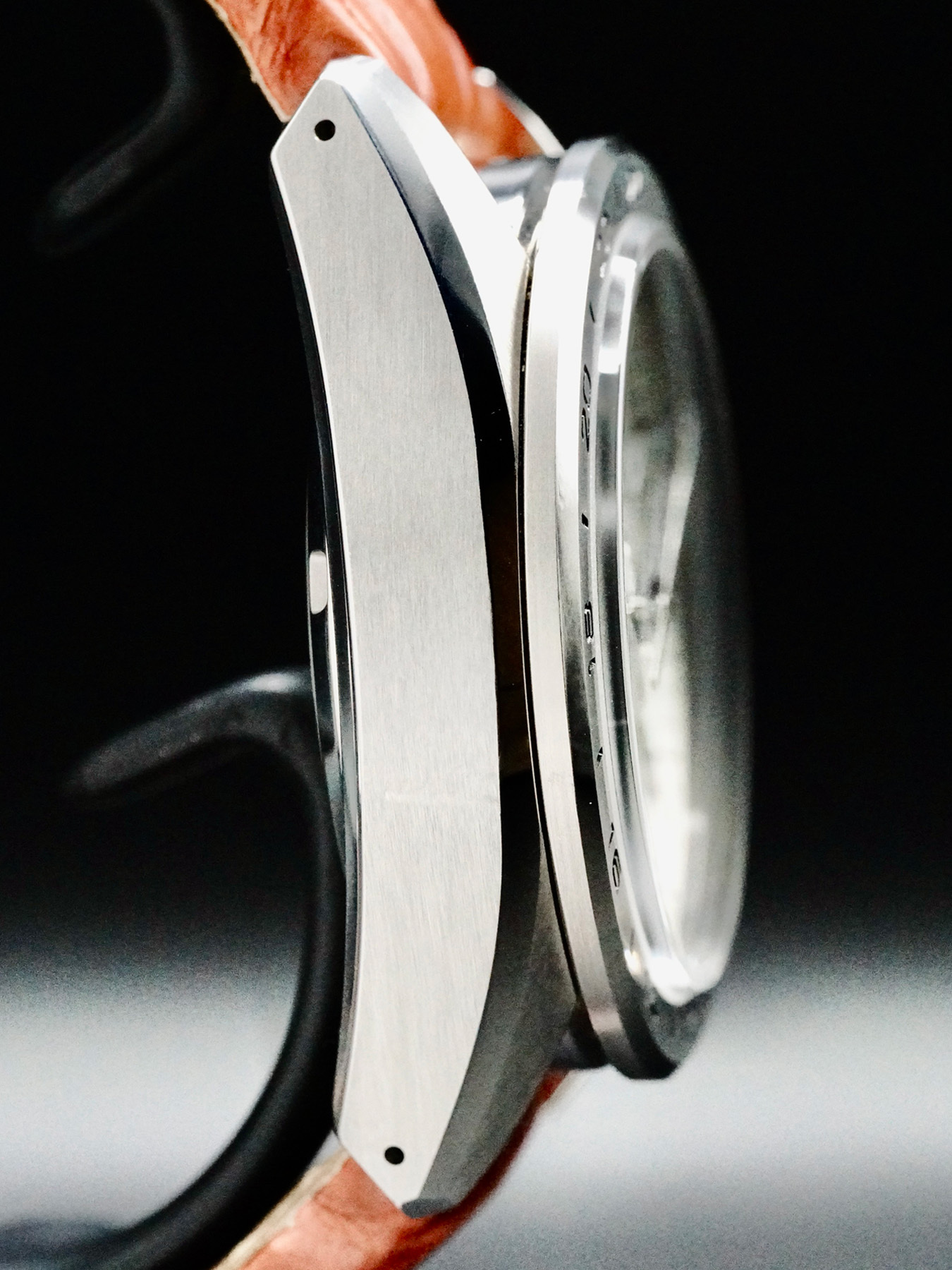 This Grand Seiko features a 41mm high-intensity titanium case with a display case back on a brown leather strap. This watch also sports a white dial with luminous hands and index dial markers covered by scratch resistant sapphire crystal.