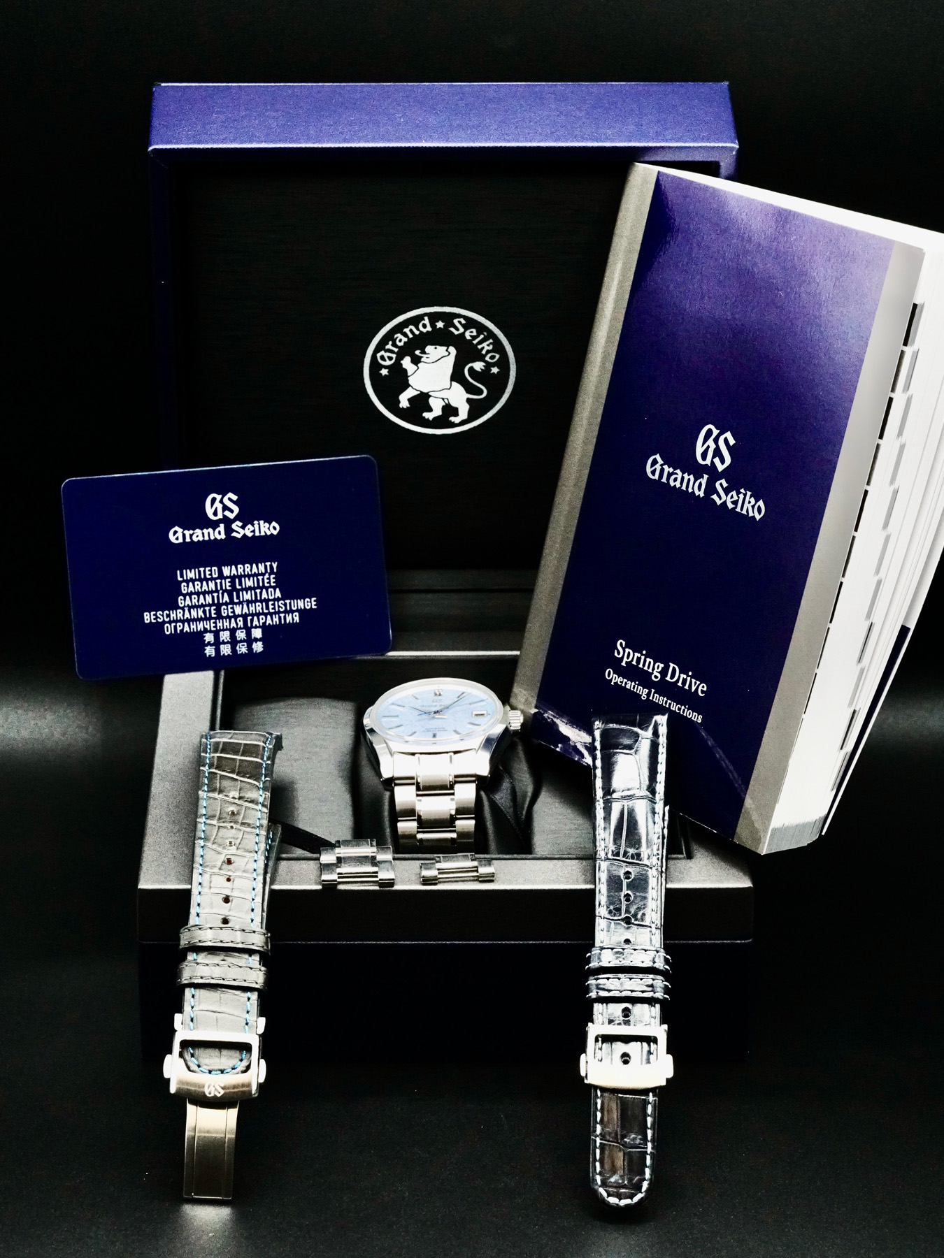 This Grand Seiko Hi-Beat 36000 Sōkō Kirazuri SBGH295 U.S. Exclusive is in EXCELLENT condition. This watch includes its original box, instruction manual, and warranty card dated for 2023. Extra grey leather strap, blue leather strap, and stainless steel bracelet links. This watch has been fully authenticated and certified by Exquisite Timepieces.