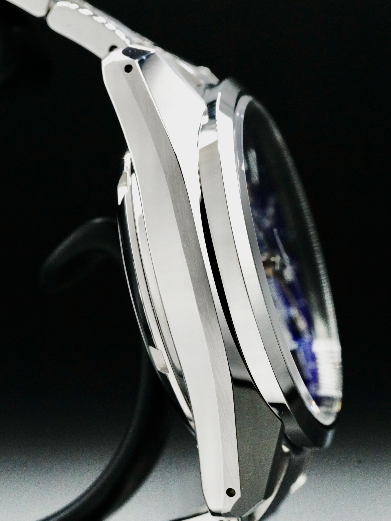 This Grand Seiko Hi Beat 36000 GMT Peacock features a 40mm stainless steel case with a display case back on a stainless steel bracelet. This watch also sports a blue dial with silver hands and index dial markers covered by scratch resistant sapphire crystal.