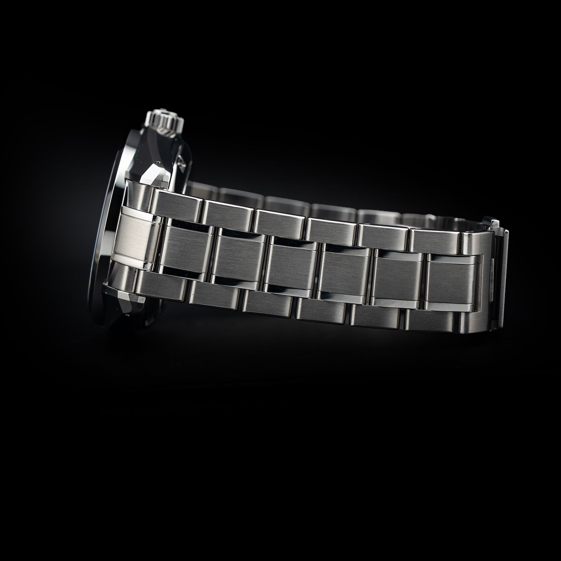 This watch features a 40 mm stainless steel case on stainless steel bracelet. This watch also sports a blue dial. Powered by a mechanical automatic movement. Water resistance up to 100 meters.