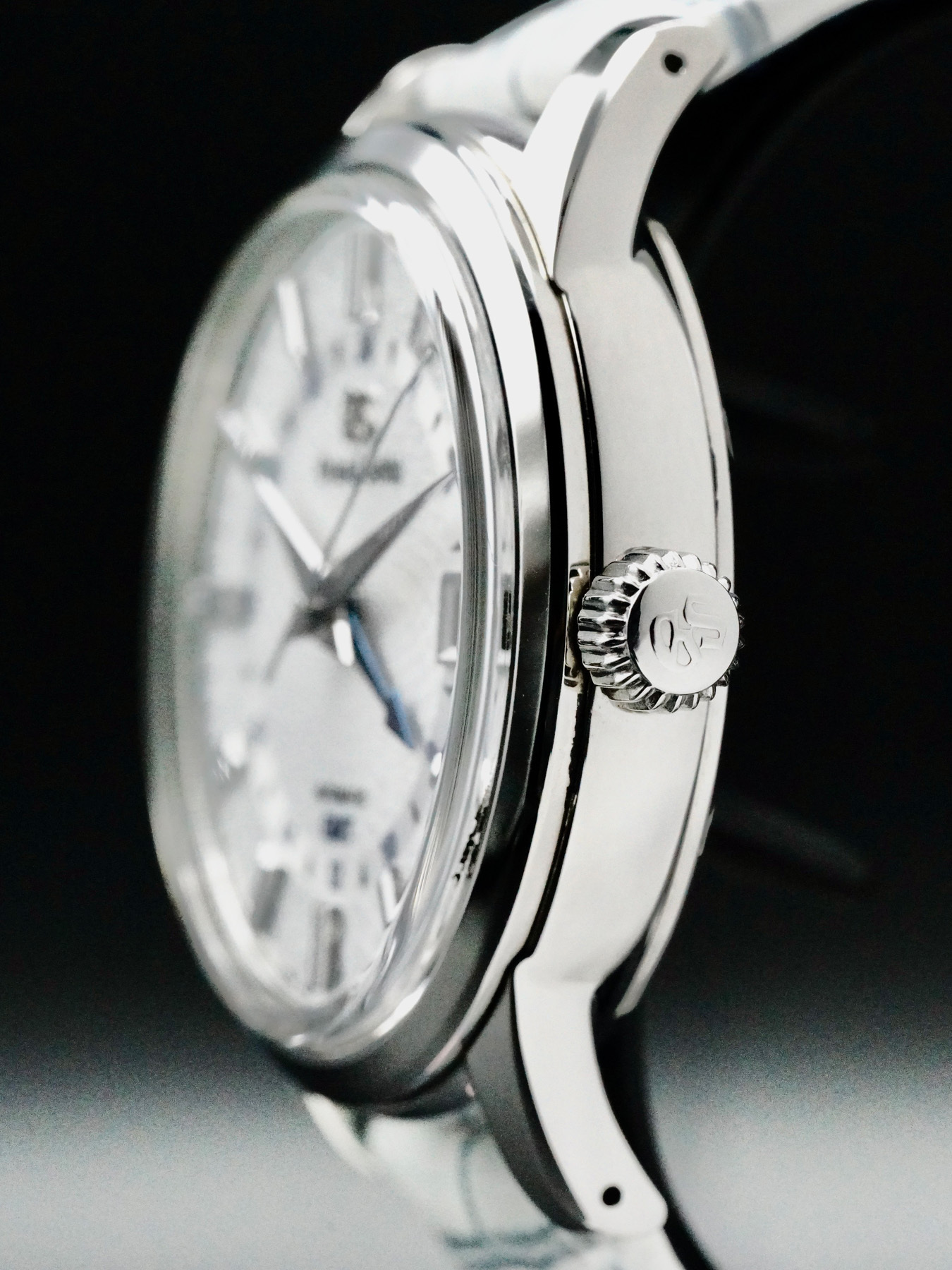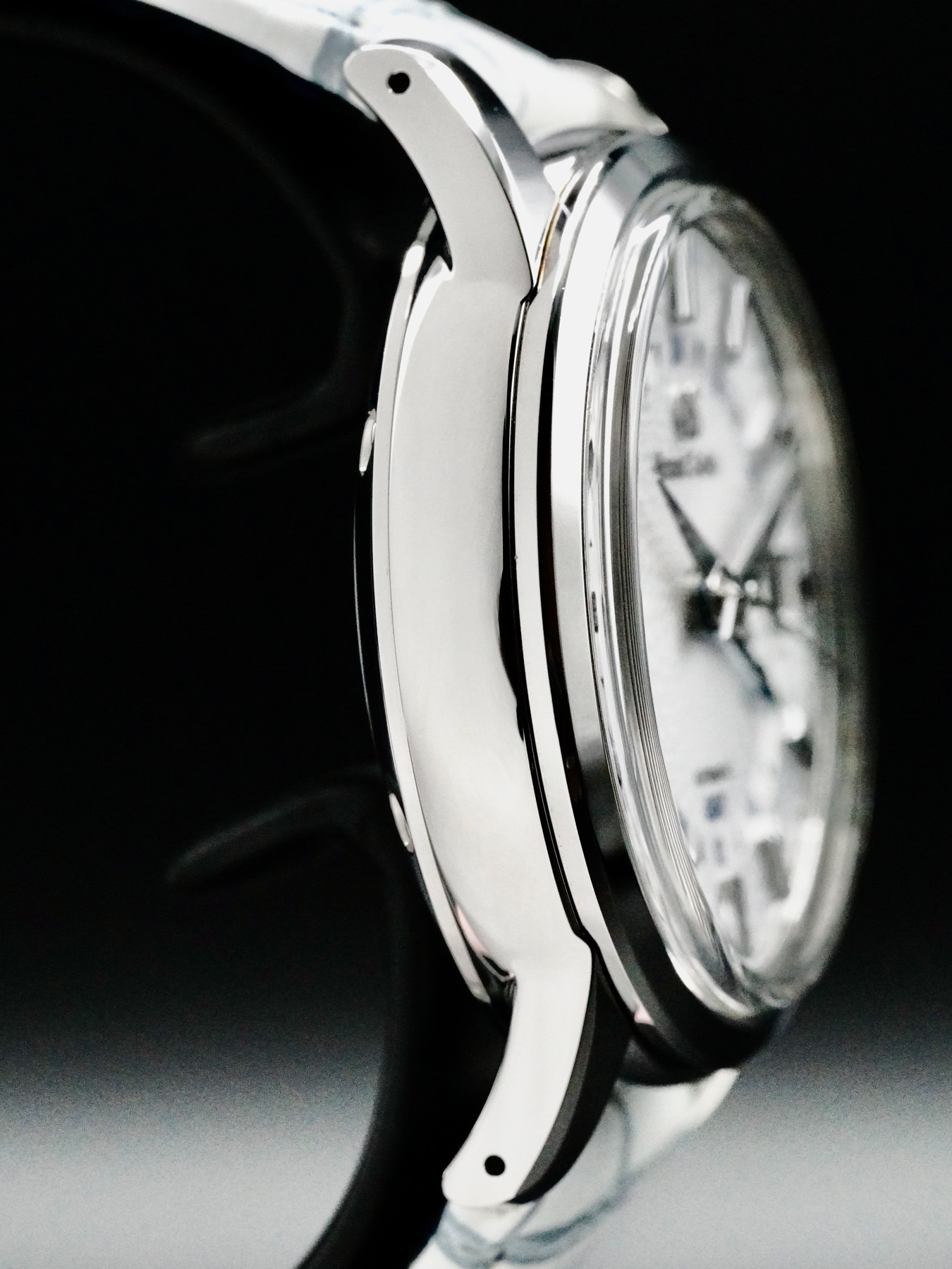 This Grand Seiko GMT features a 39.5mm stainless steel case with an exhibition case back on a white leather strap. This watch also sports a silver, textured dial with silver hands, blue GMT hand, and index dial markers covered by scratch resistant sapphire crystal.