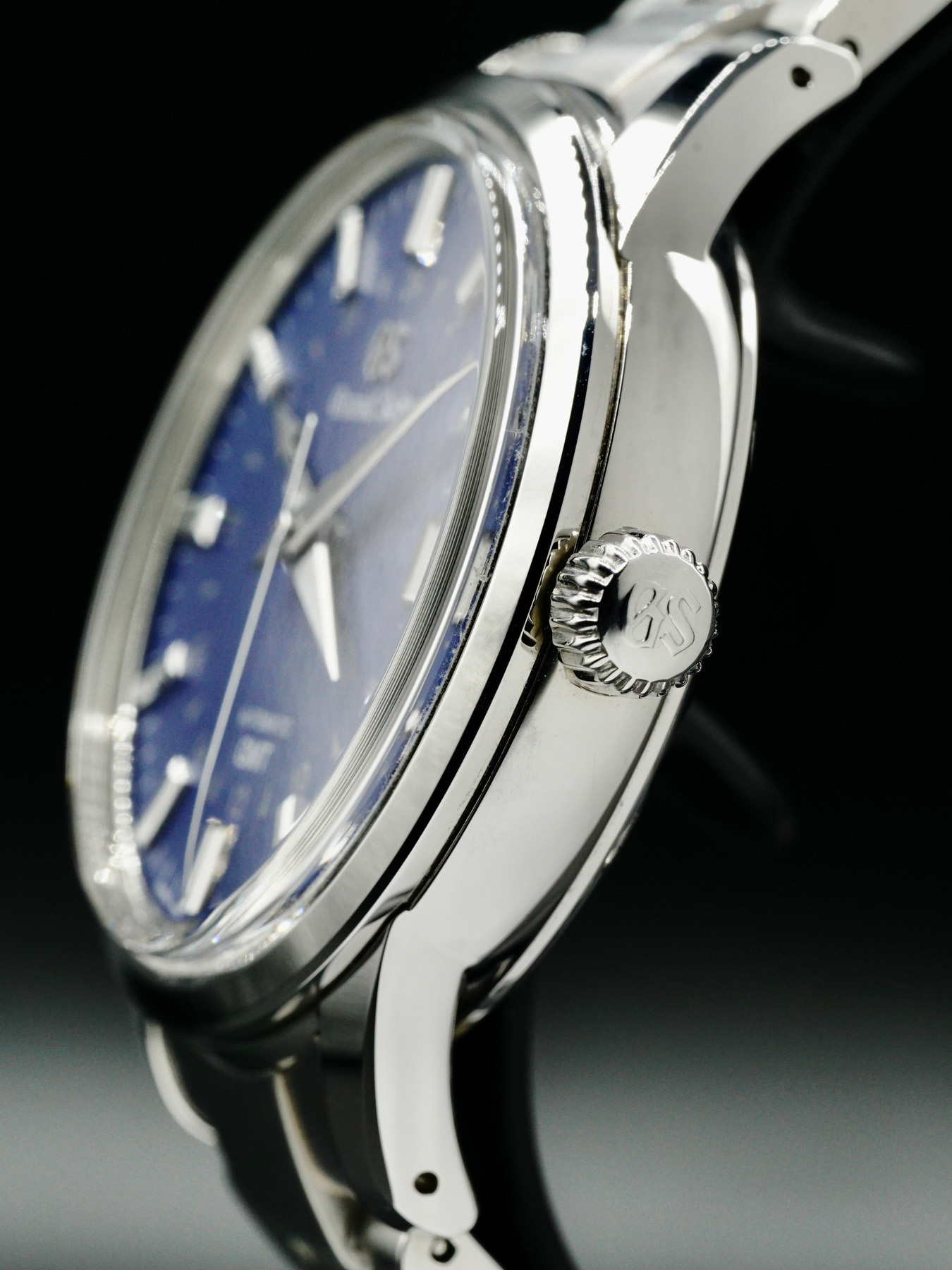 This Grand Seiko features a 39.5mm stainless steel case & bezel with a transparent case back on a stainless steel bracelet. This watch also sports a blue dial with silver hands and index dial markers covered by scratch resistant sapphire crystal.