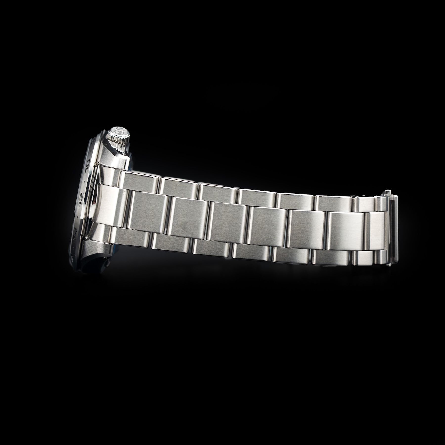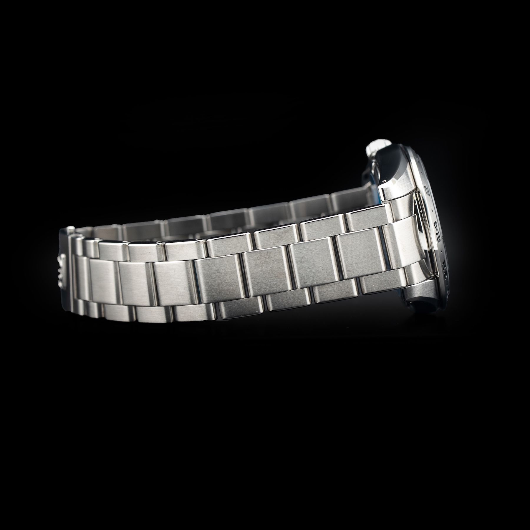 - This timepiece features a 39mm steel case paired with a high quality steel bracelet. It showcases a distinctive black dial and is powered by a precise quartz winding movement. The watch is designed with a water resistance of up to 200m.