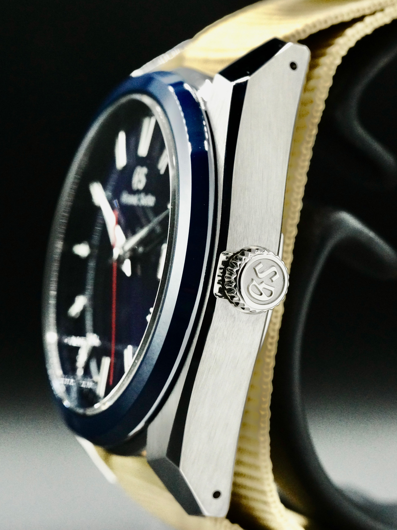 This Grand Seiko features a 40mm stainless steel case with a blue zirconia ceramic bezel on a tan NATO strap. This watch also sports a blue sunray dial with silver hands and index dial markers covered by scratch resistant sapphire crystal.