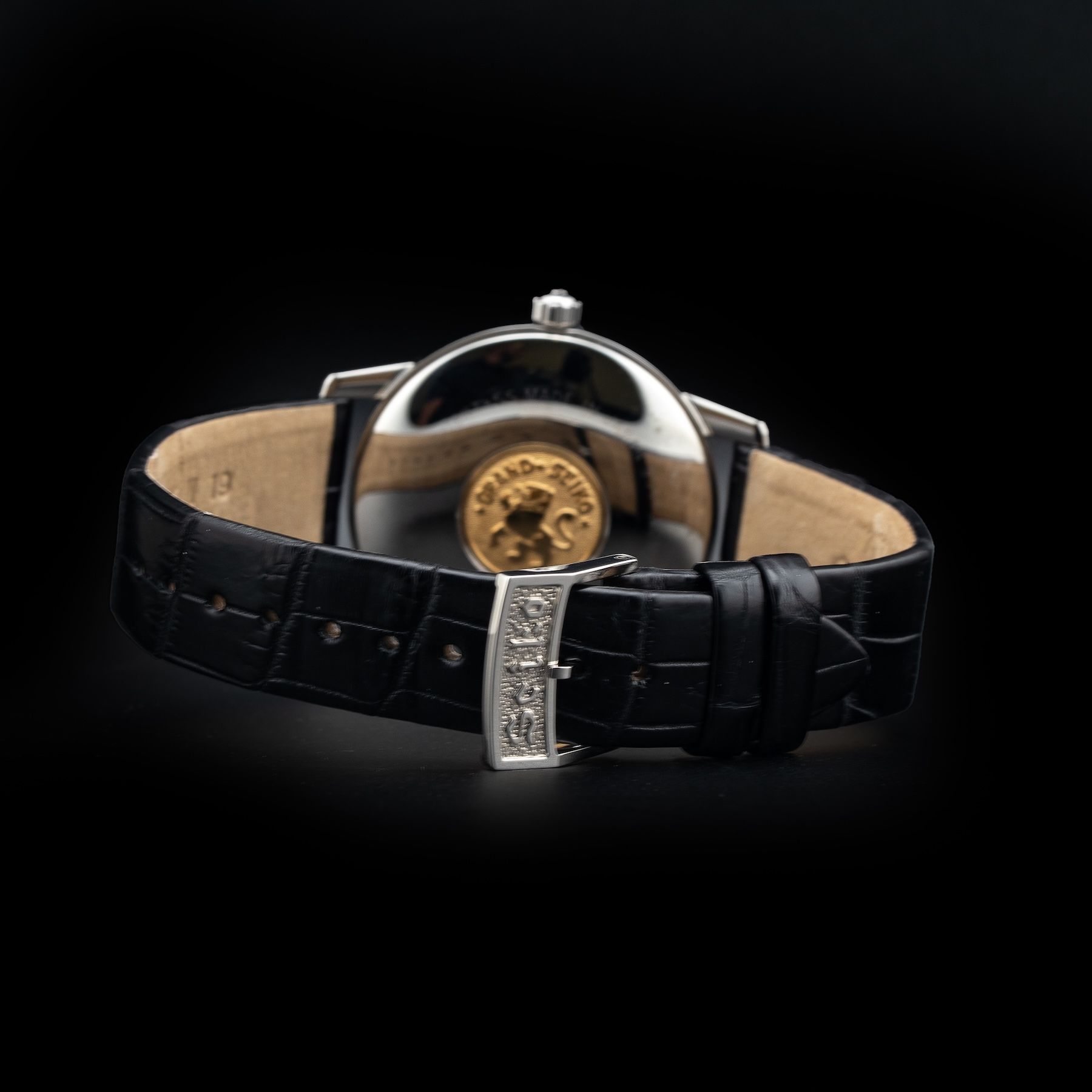 This watch features a 38mm stainless steel case on leather strap. This watch also sports a white dial. Powered by a manual wind mechanical movement. Water resistance up to 30 meters.