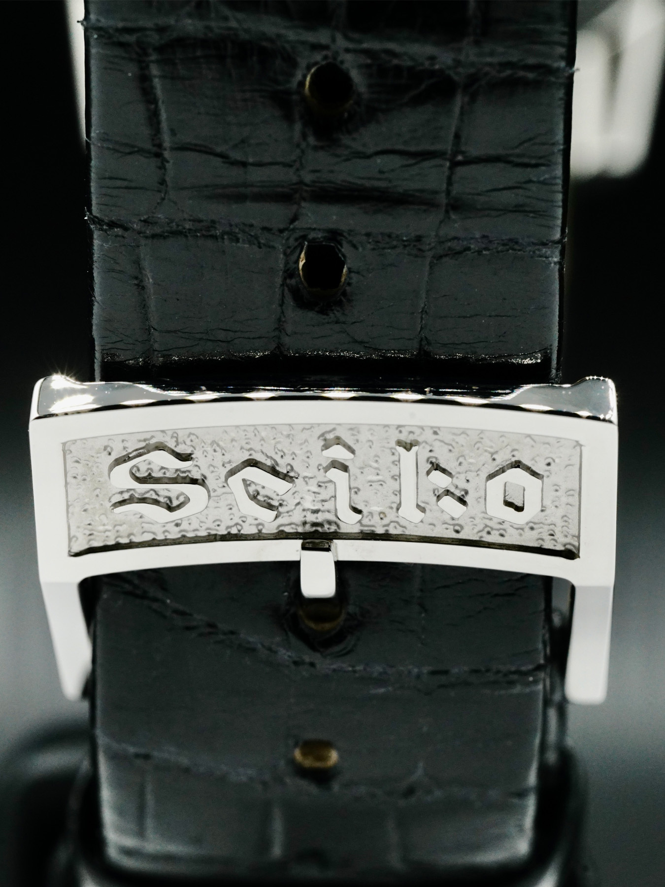 This Grand Seiko features a 38mm stainless steel case and a solid case back with the Grand Seiko lion logo embedded in 18k yellow gold, on a black leather strap. This watch also sports a white dial with delta-shaped hand and index dial markers covered by scratch resistant sapphire crystal.