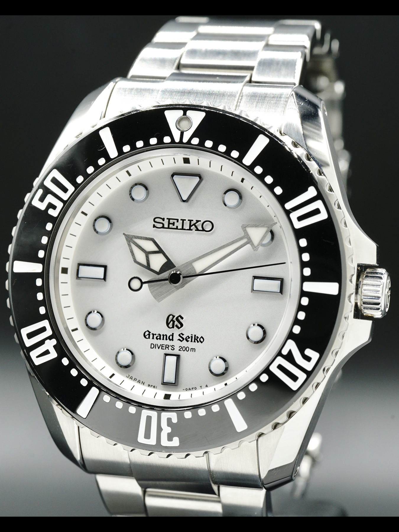 This Grand Seiko Quartz Diver features a 42mm stainless steel case with a solid case back. This watch also showcases a white dial with luminous hands covered by scratch-resistant sapphire crystal.