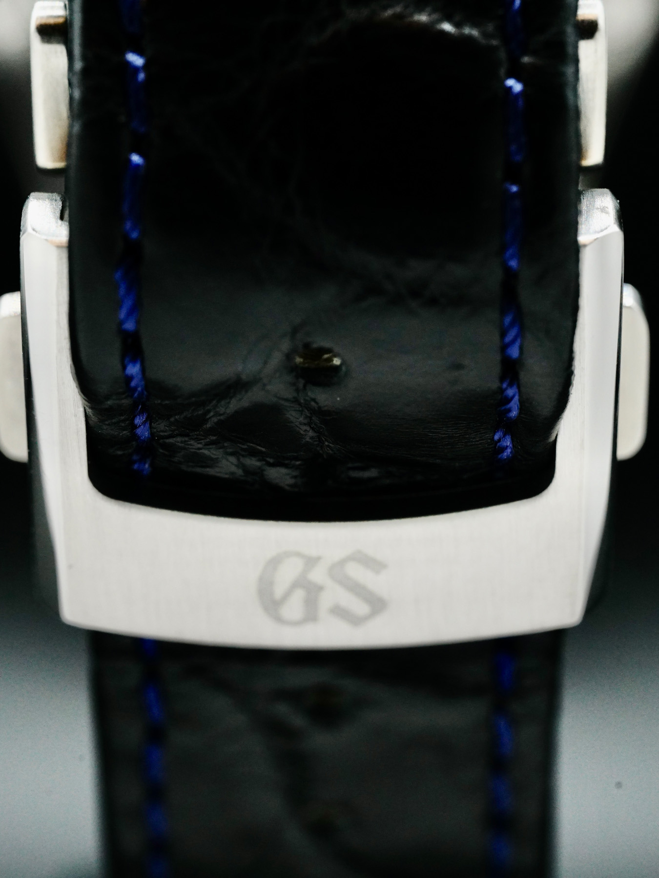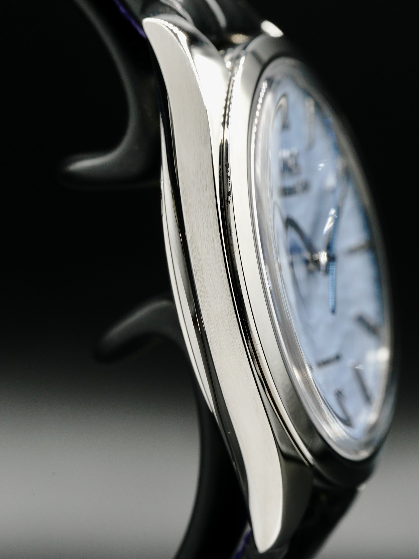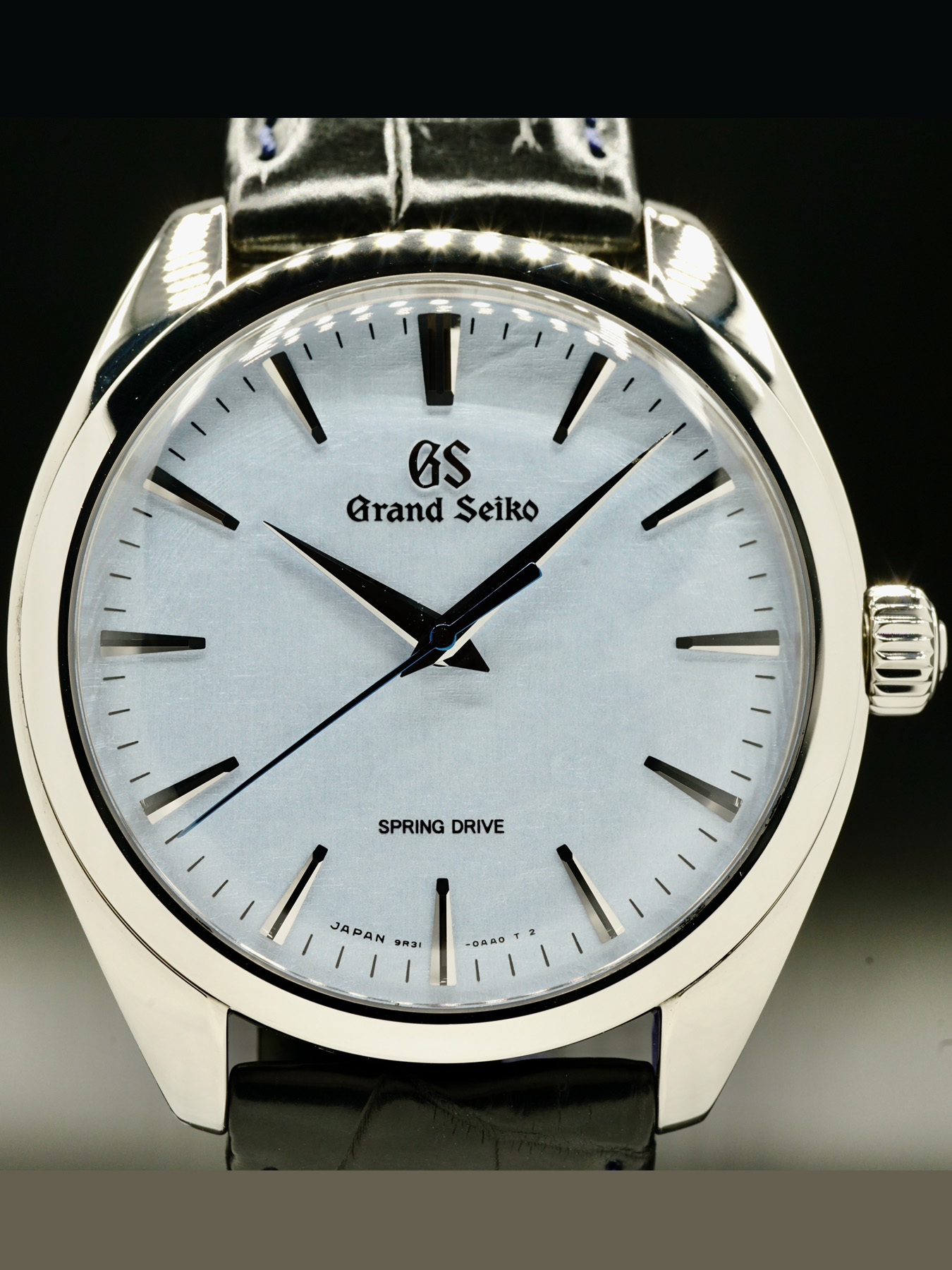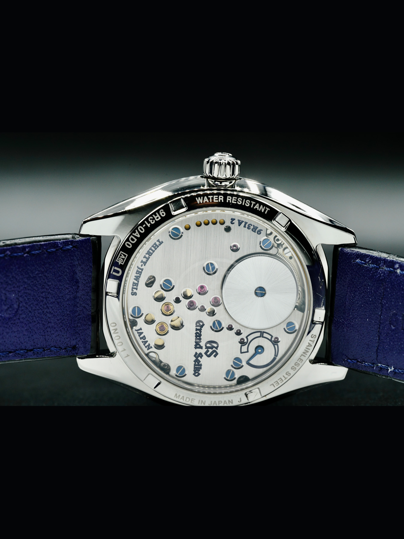This watch features a 38.5mm stainless steel case on leather strap. This watch also sports a blue dial. Powered by a spring drive movement. Water resistance up to 30 meters.