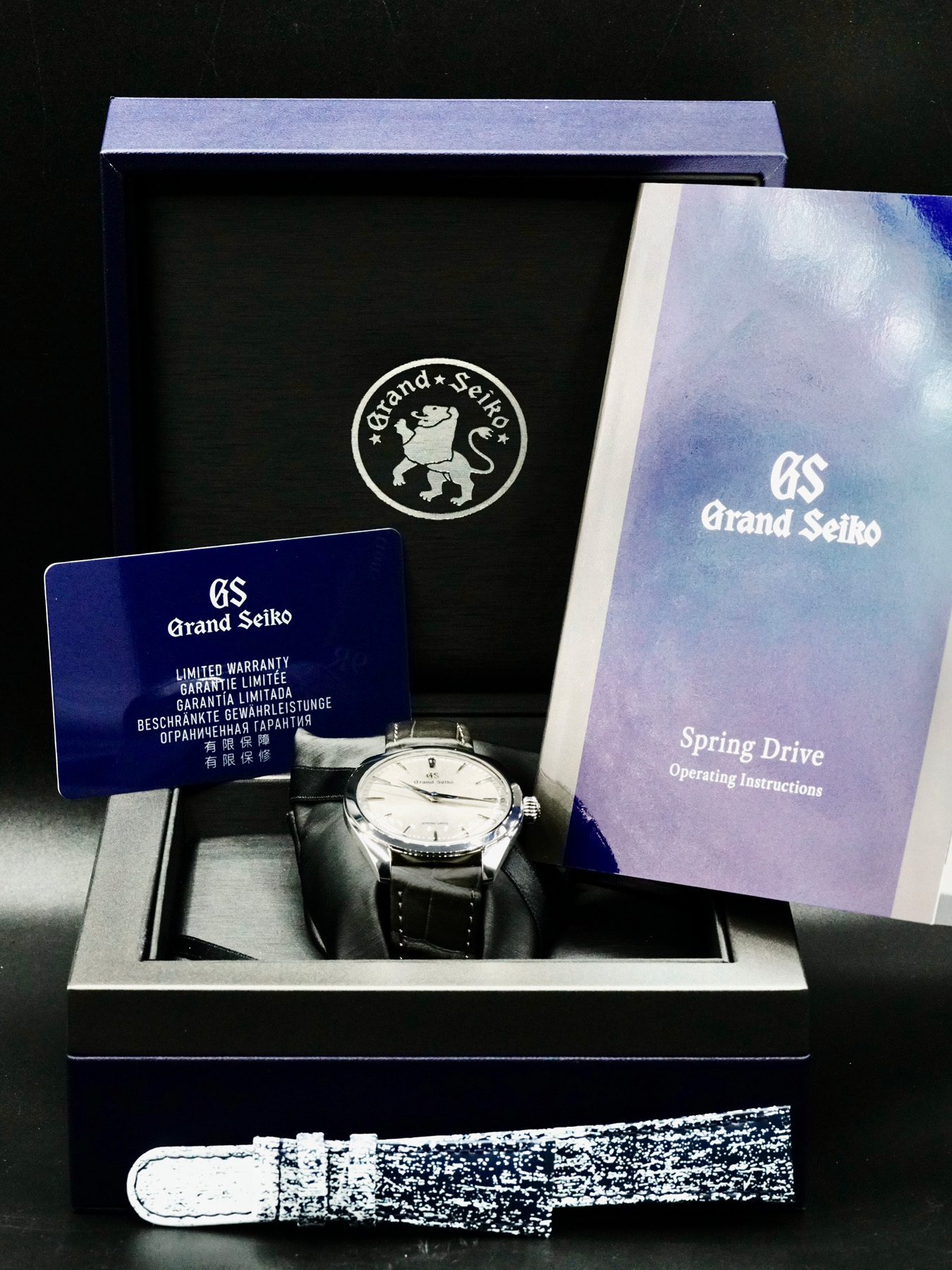 This Grand Seiko Spring Drive Manual SBGY023 is in EXCELLENT condition. This watch includes its original box, operating instructions, and limited warranty card dated for November 2022. GS9 Club Limited Edition of 299 pieces. Extra blue leather strap.