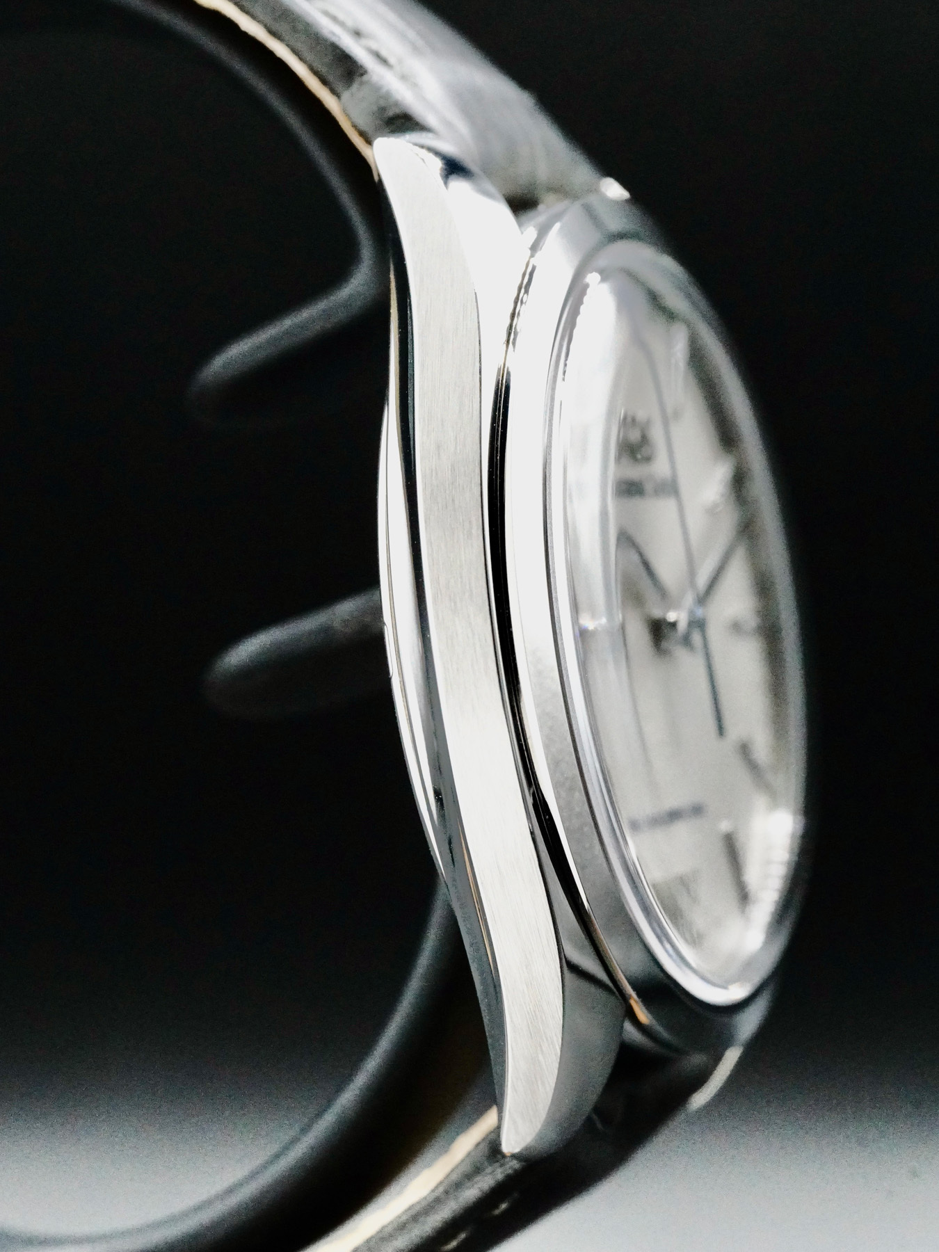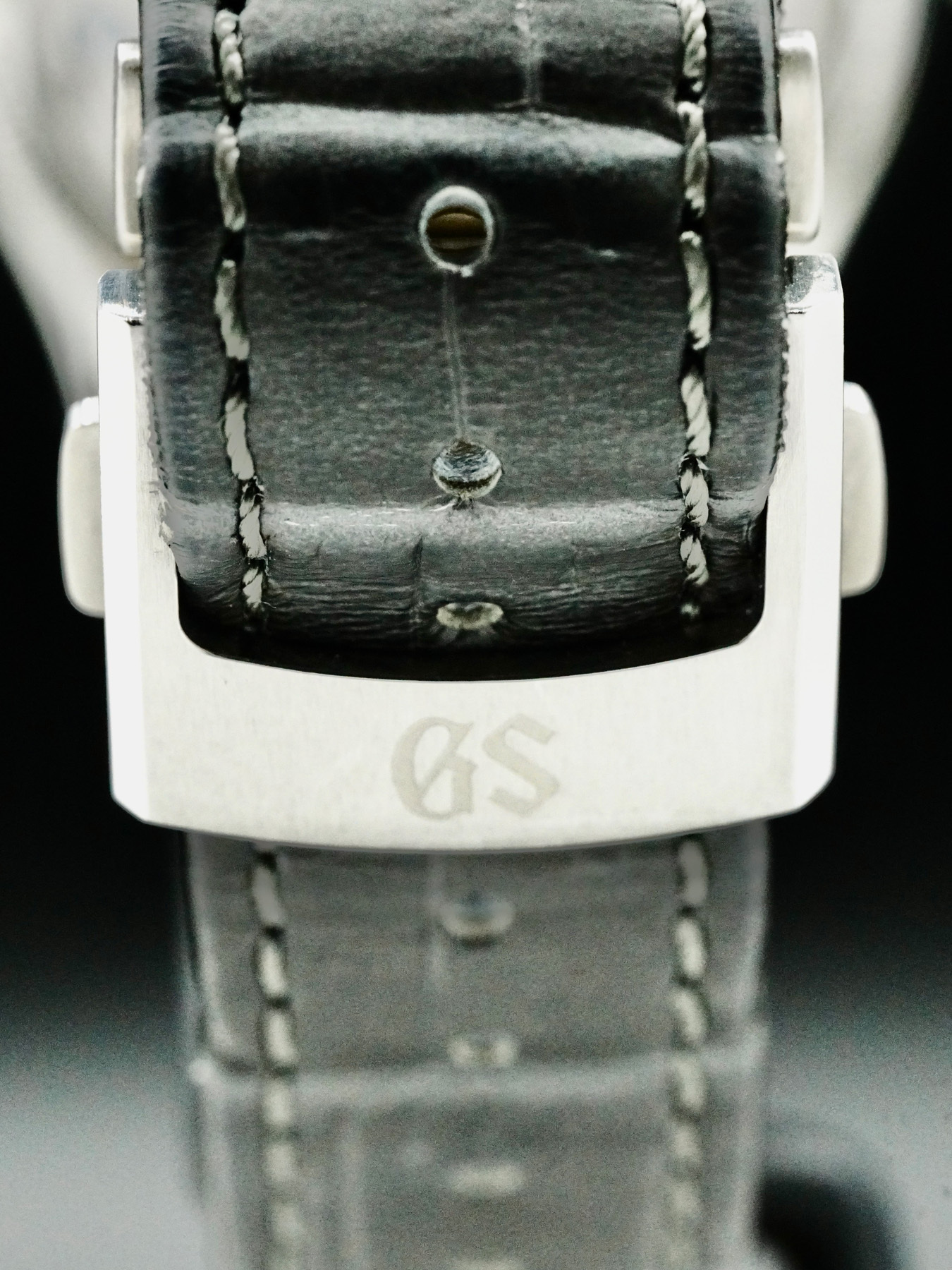 This Grand Seiko Spring Drive Manual features a 38.5mm stainless steel case with a display case back on a grey leather strap. This watch also sports a grey Kirazui dial with silver hands and index dial markers covered by dual curve sapphire crystal.