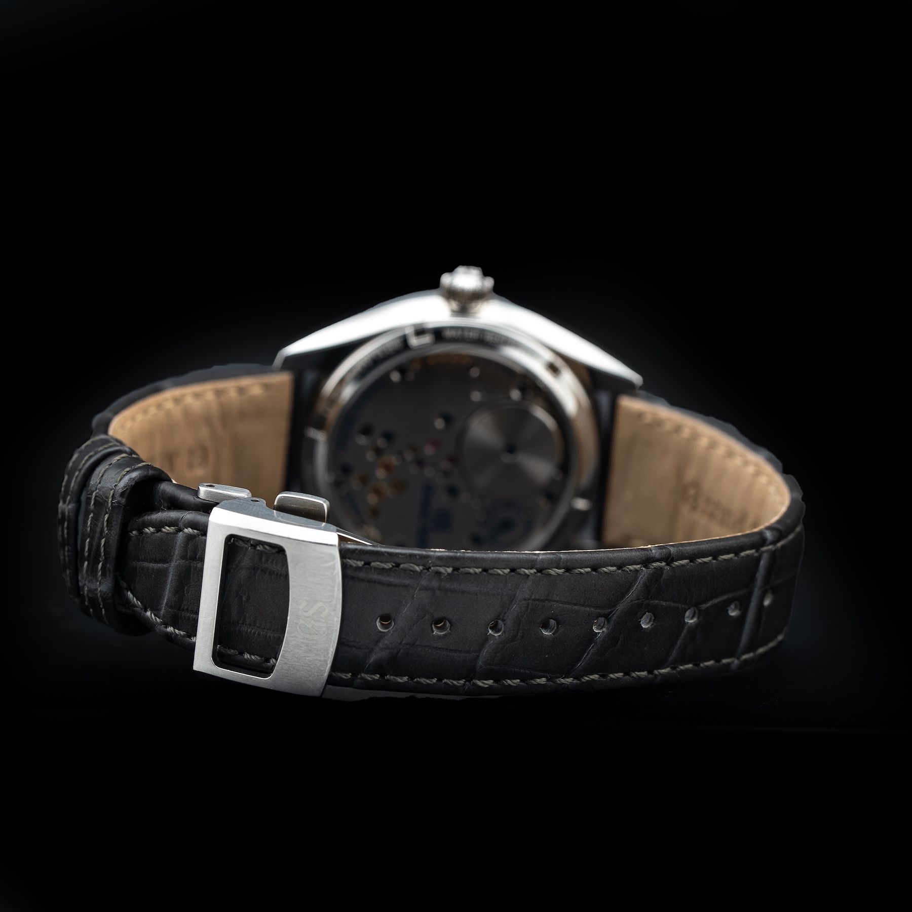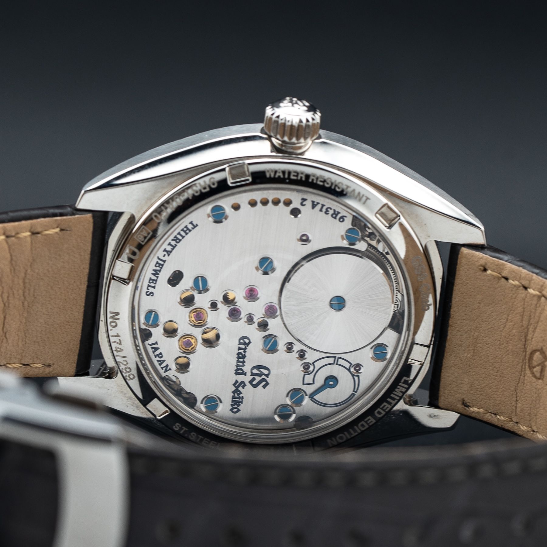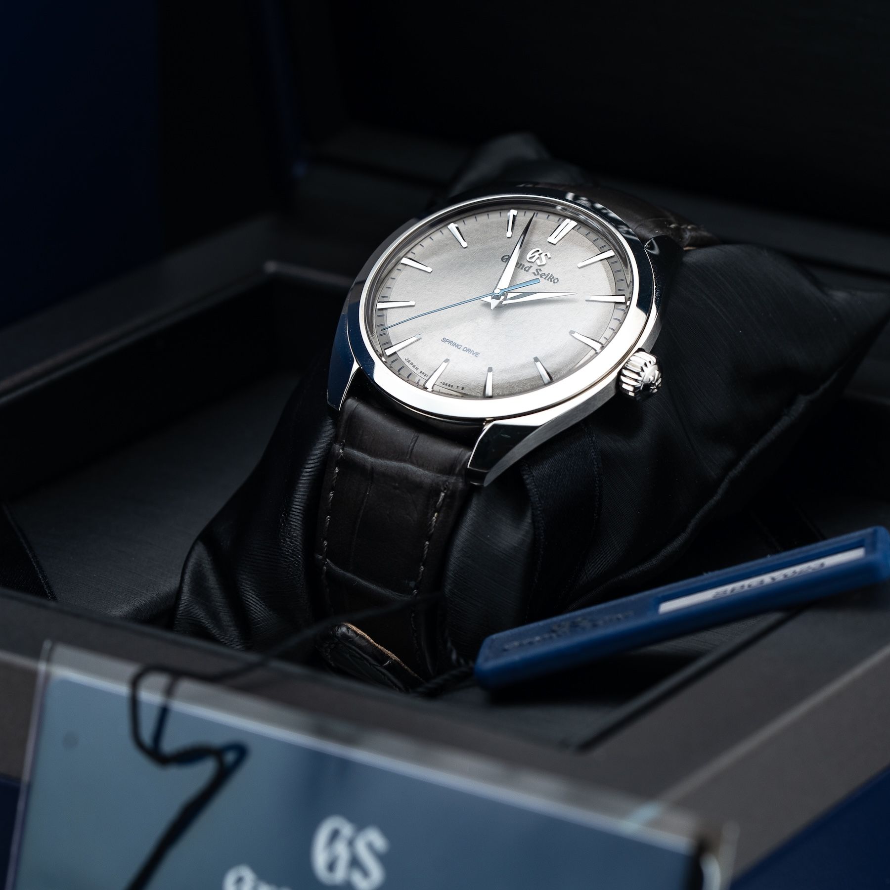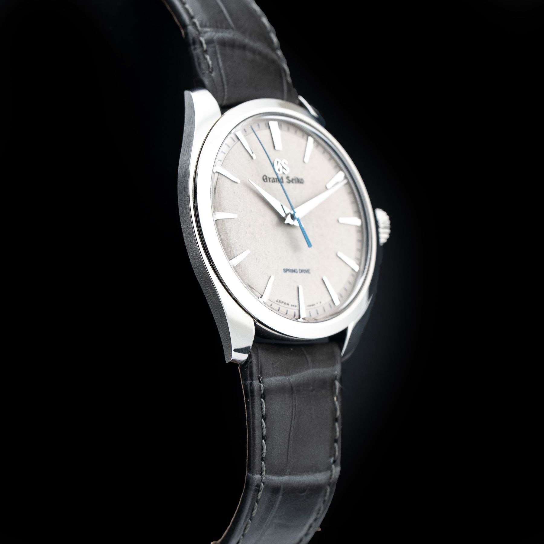 This watch features a 38.5mm stainless steel case on leather strap. This watch also sports a grey Kirazui dial. Powered by a Spring Drive movement powered by Grand Seiko Caliber 9R31 movement. Water resistance up to 30 meters.