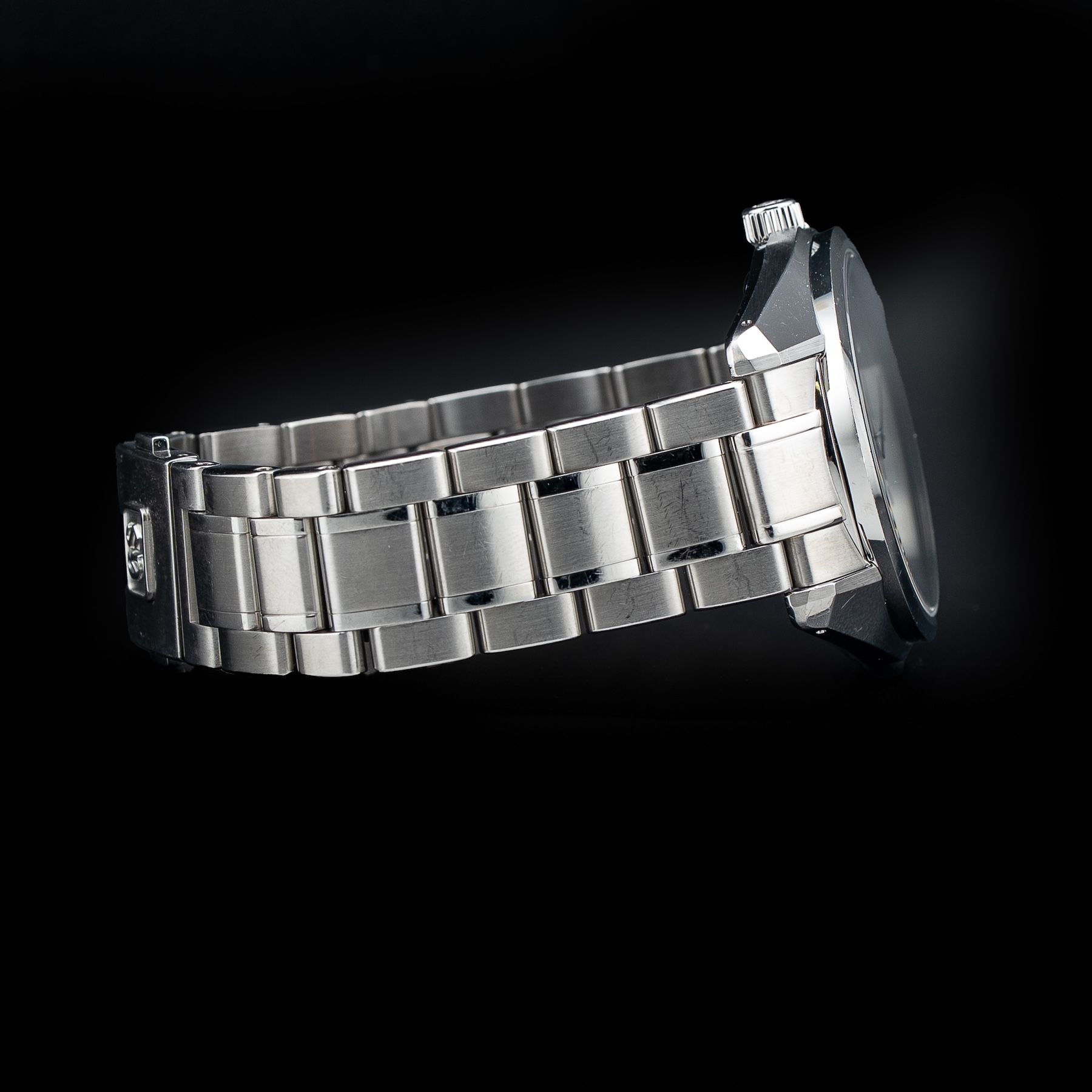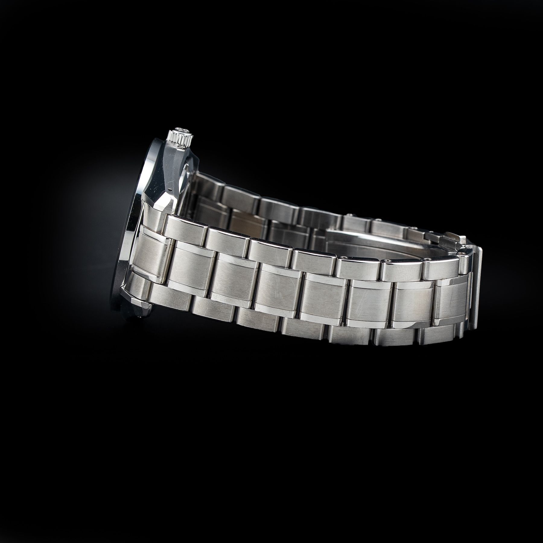 This watch features a 40mm stainless steel case on stainless steel bracelet. This watch also sports a blue dial. Powered by a quartz movement. Water resistance up to 100 meters.
