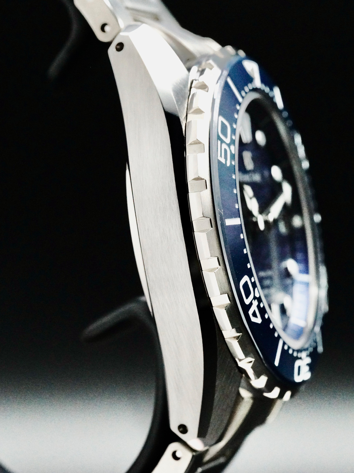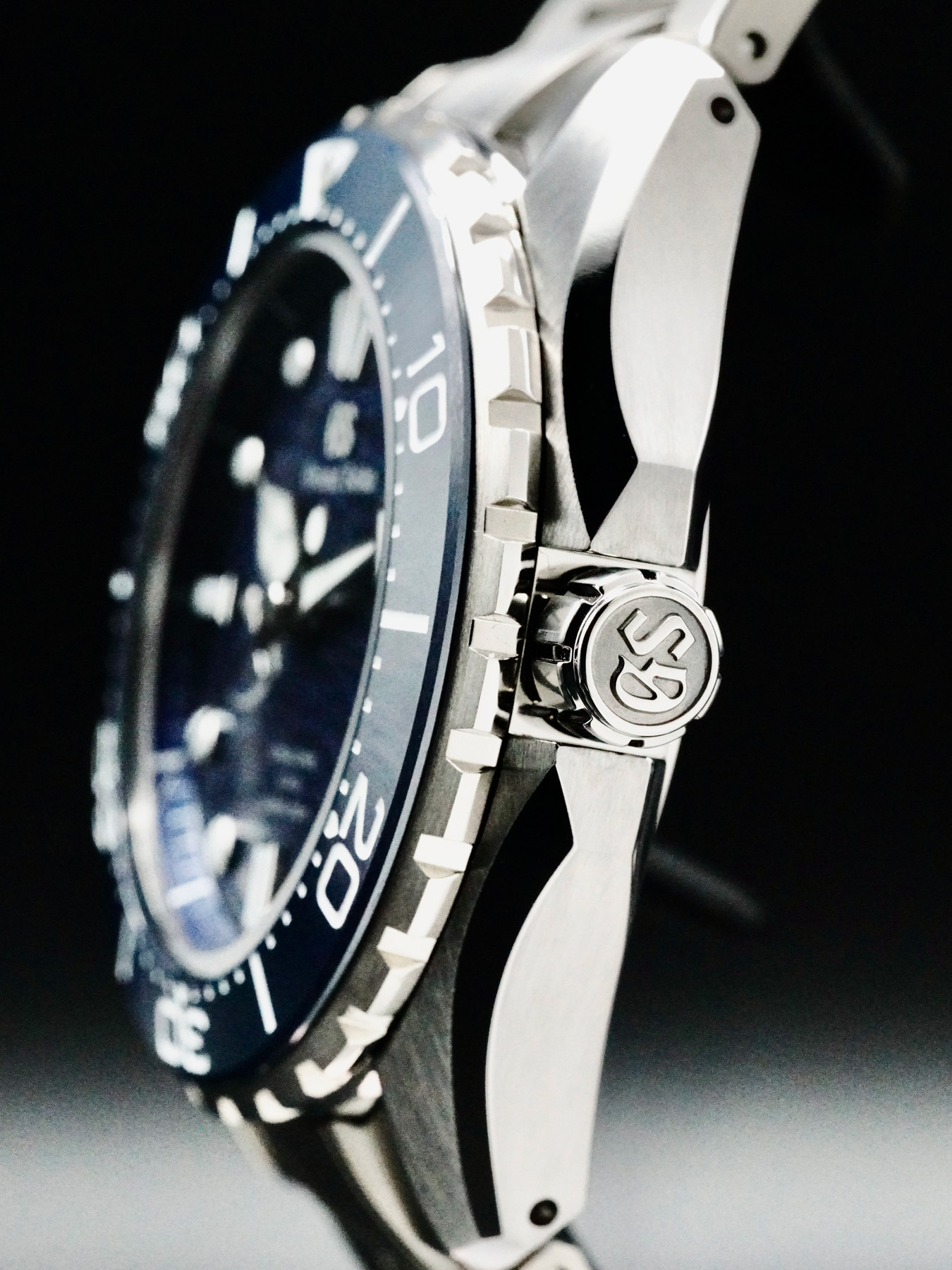 This Grand Seiko Ushio features a 43.8mm high-intensity titanium case with a solid case back on a high-intensity titanium bracelet. This watch also sports a blue "ushio" pattern dial with luminous hands and index dial markers covered by anti-reflective sapphire crystal.