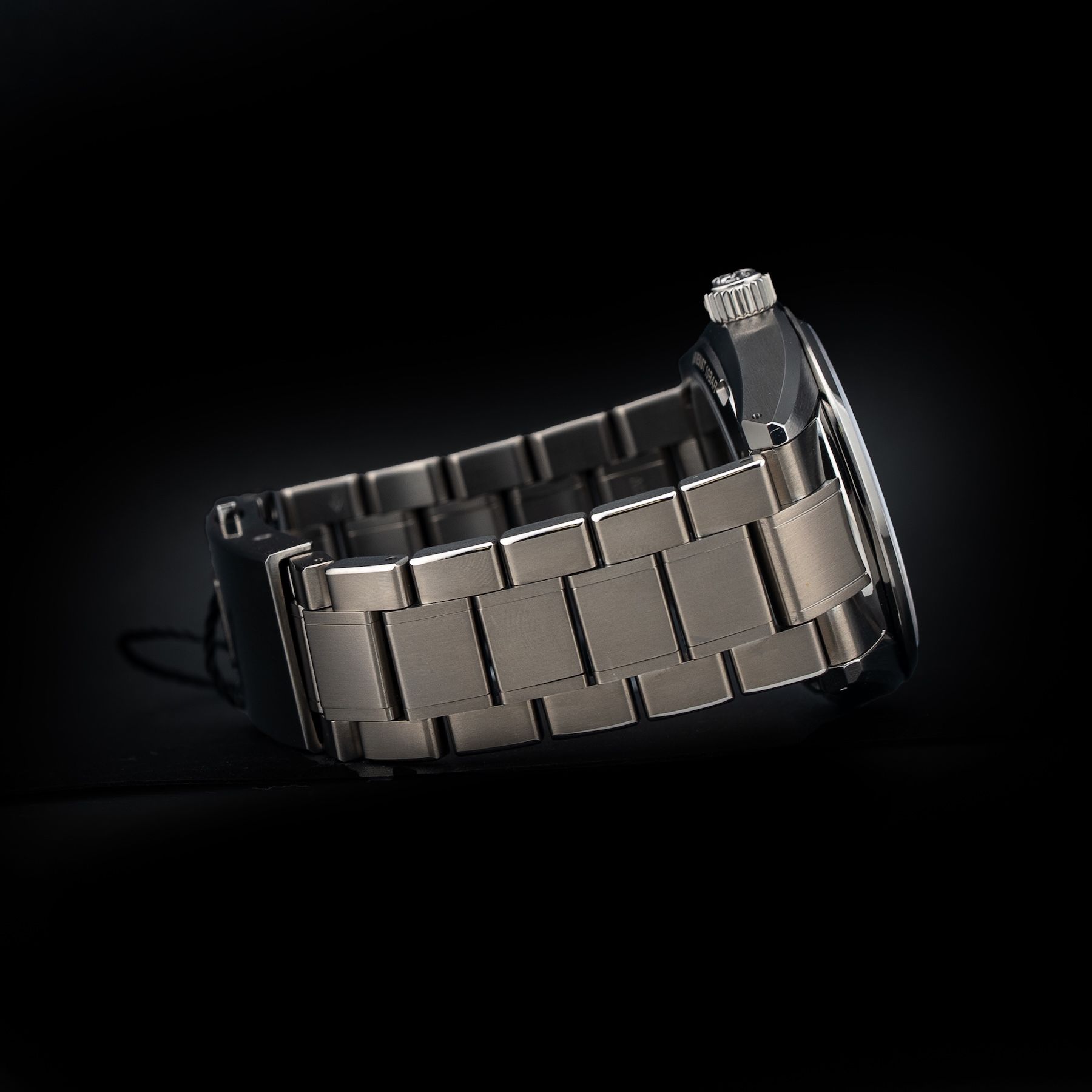 - This timepiece features a 37mm titanium case paired with a high quality titanium bracelet. It showcases a distinctive blue dial and is powered by a precise spring drive winding movement. The watch is designed with a water resistance of up to 100m.