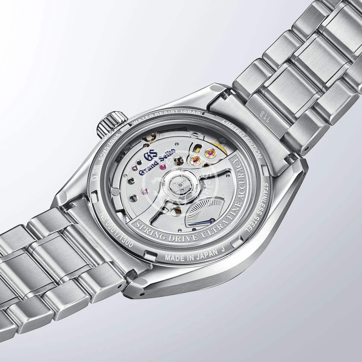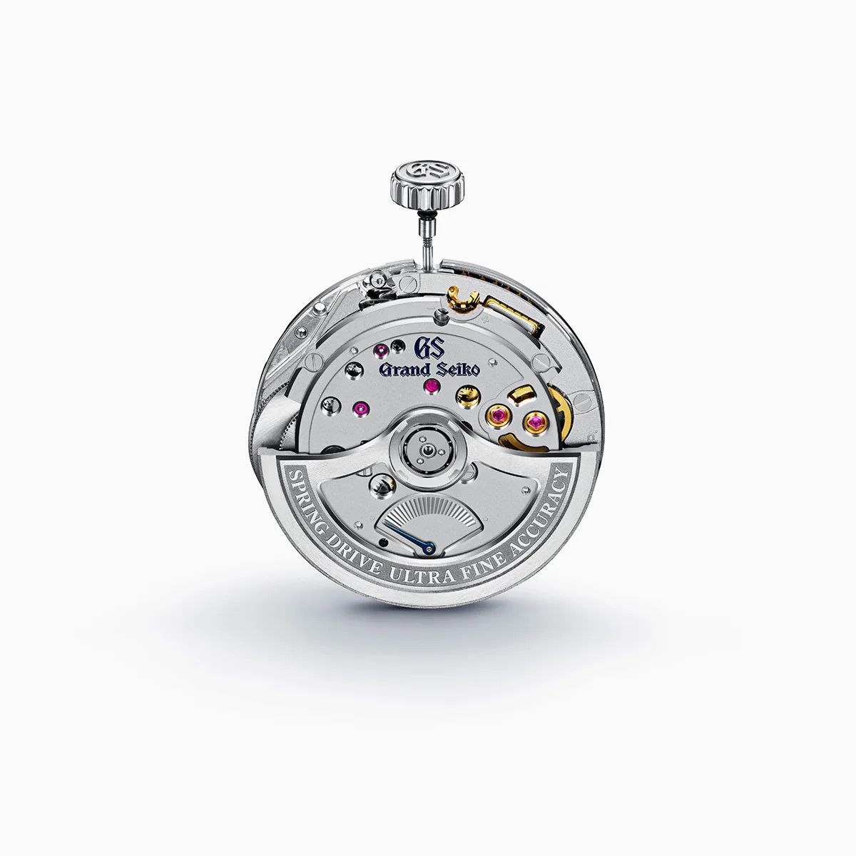 Powering the SLGB005 is the Spring Drive Caliber 9RB2, a movement with an impressive ±20 seconds per year accuracy, earning the Ultra Fine Accuracy designation. This performance is achieved through a specially aged quartz oscillator, a low-power integrated circuit, and vacuum-sealed components that ensure long-term stability. Visible through the sapphire crystal case back, the movement features frosted finishing that recalls Shinshu’s winter landscapes, with jewels that sparkle like stars above the mountains. The oscillating weight is engraved with “Spring Drive Ultra Fine Accuracy,” underscoring this achievement.