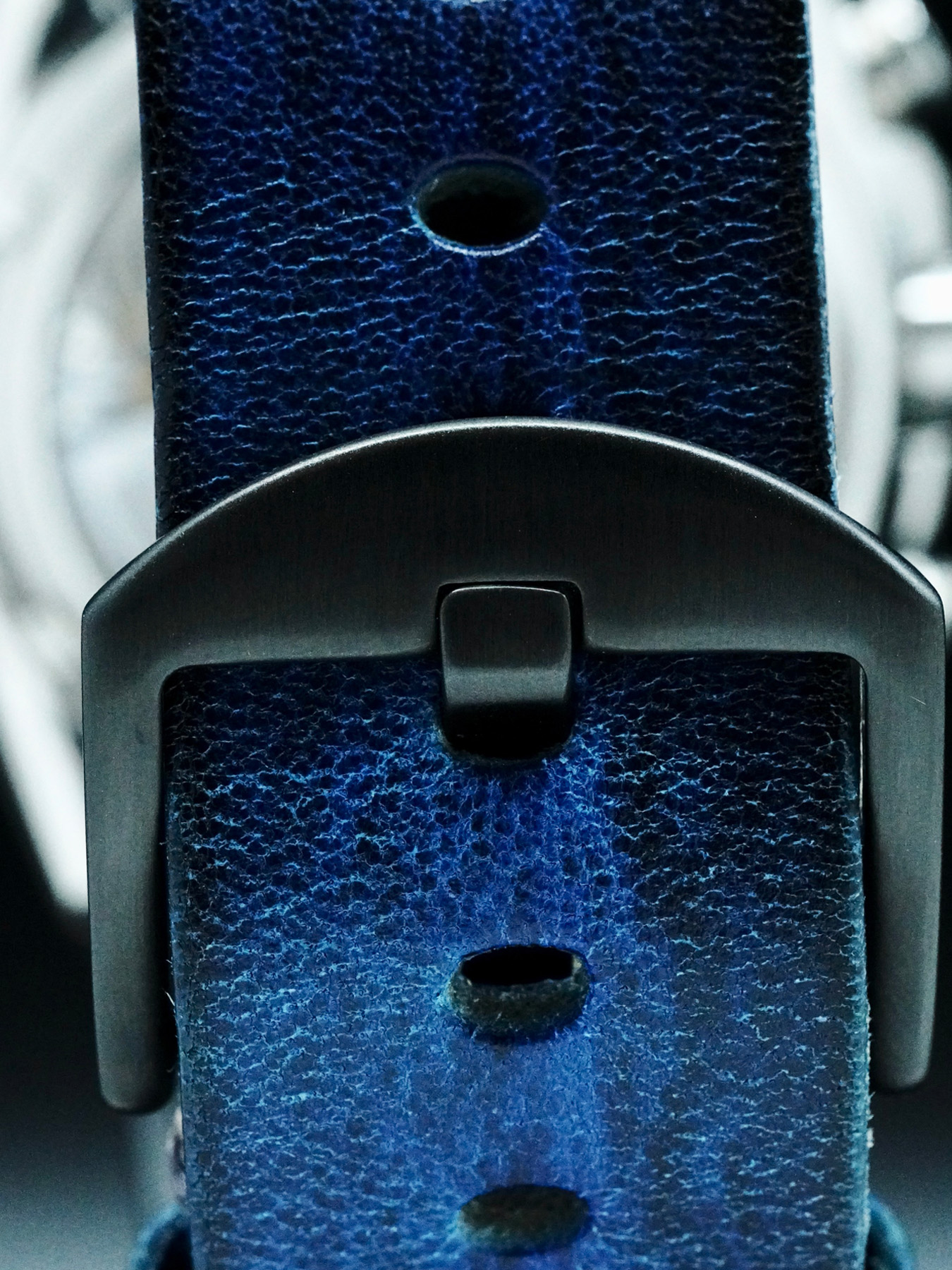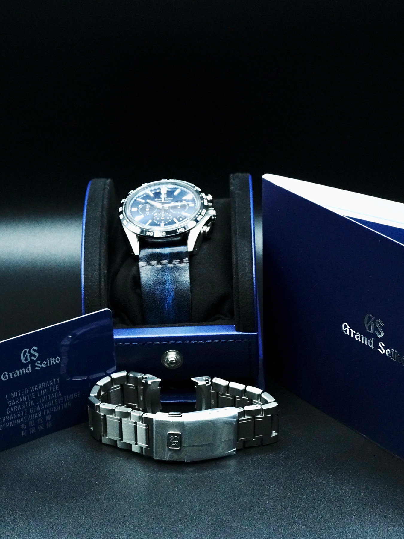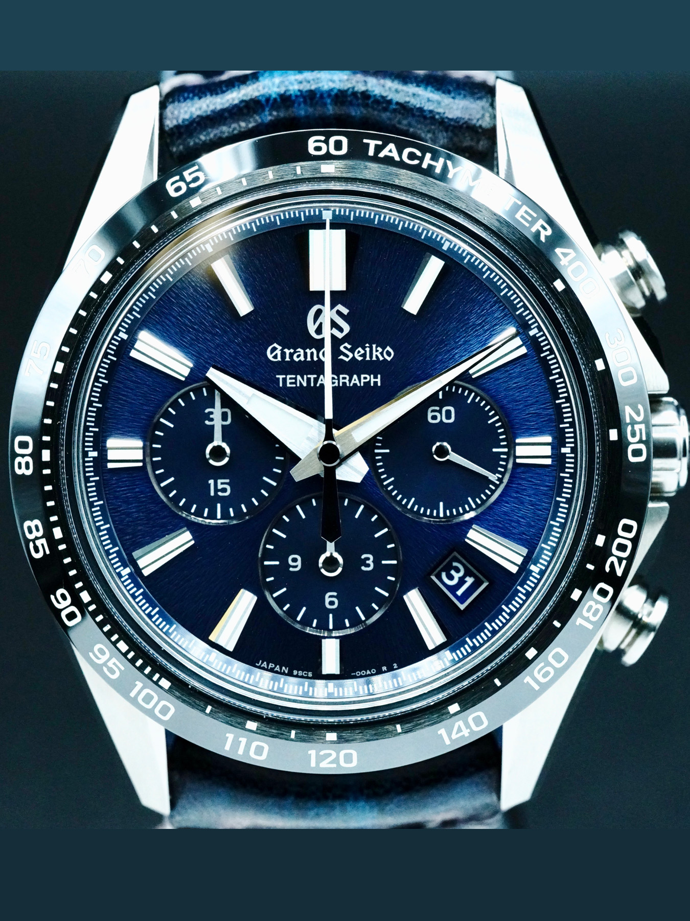 This Grand Seiko Tentagraph features a 43.2mm high-intensity titanium case with an exhibition case back on an off-brand leather strap. This watch also sports a blue dial with luminous hands and index dial markers covered by scratch resistant sapphire crystal.