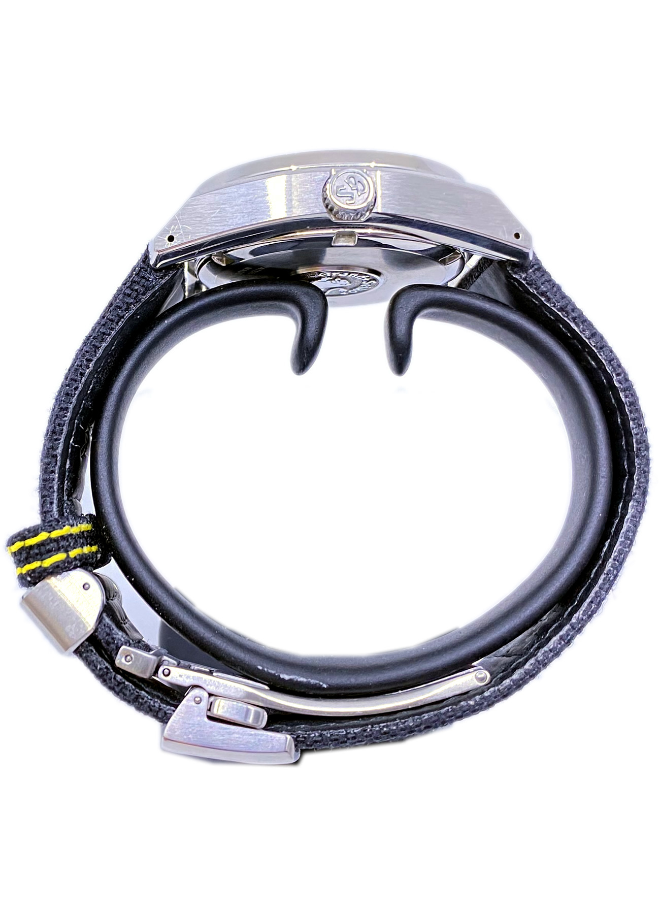 - This timepiece features a 40mm steel case paired with a high quality nylon strap. It showcases a distinctive black dial and is powered by a precise quartz winding movement. The watch is designed with a water resistance of up to 100m.
