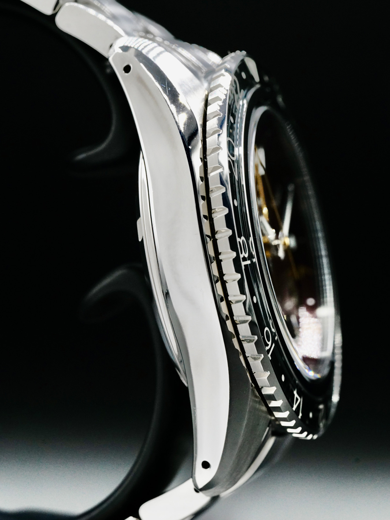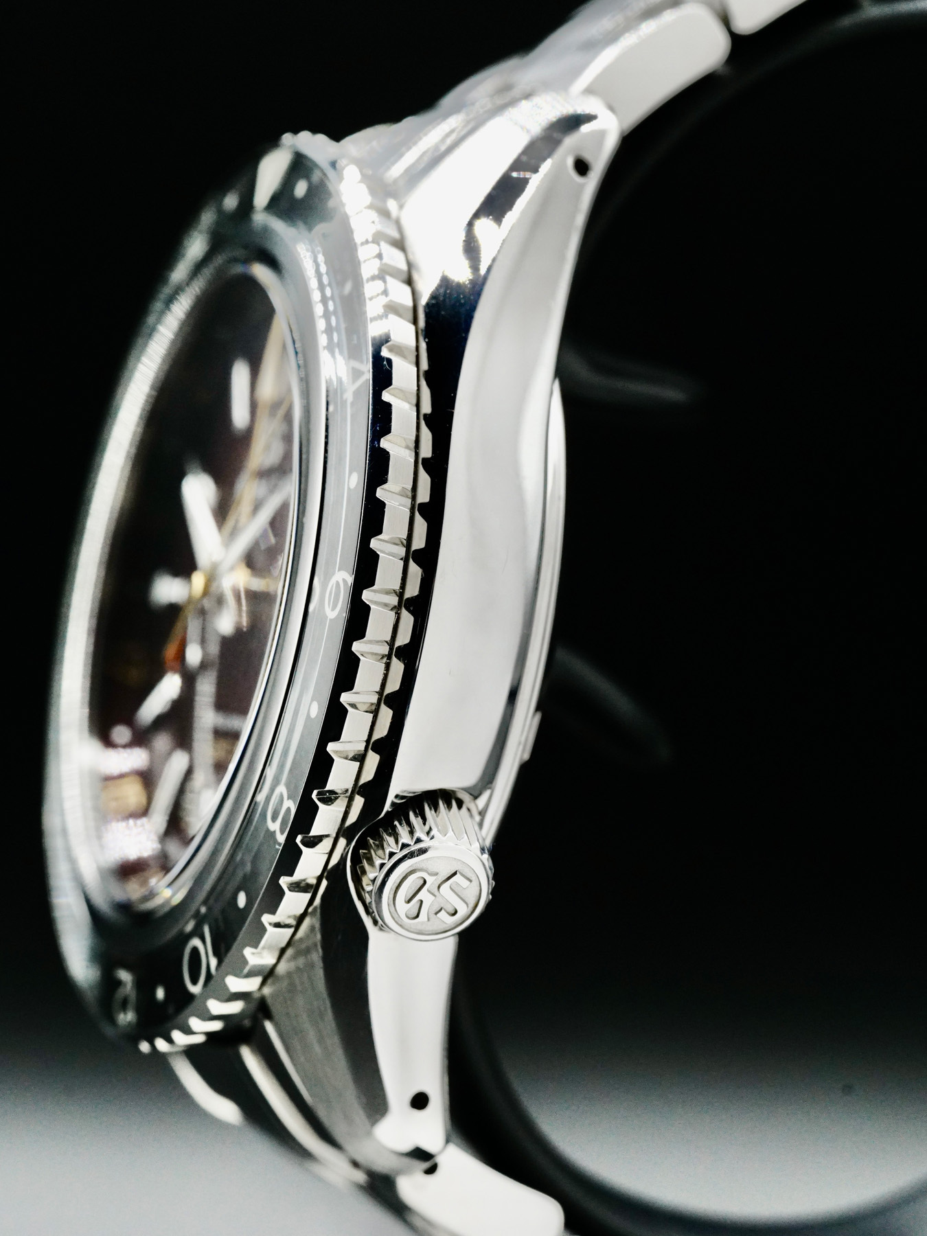 This Grand Seiko Spring Drive GMT features a 44mm stainless steel case with a ceramic bezel on steel bracelet. This watch also sports a brown dial covered by anti-reflective, scratch-resistant sapphire crystal.
