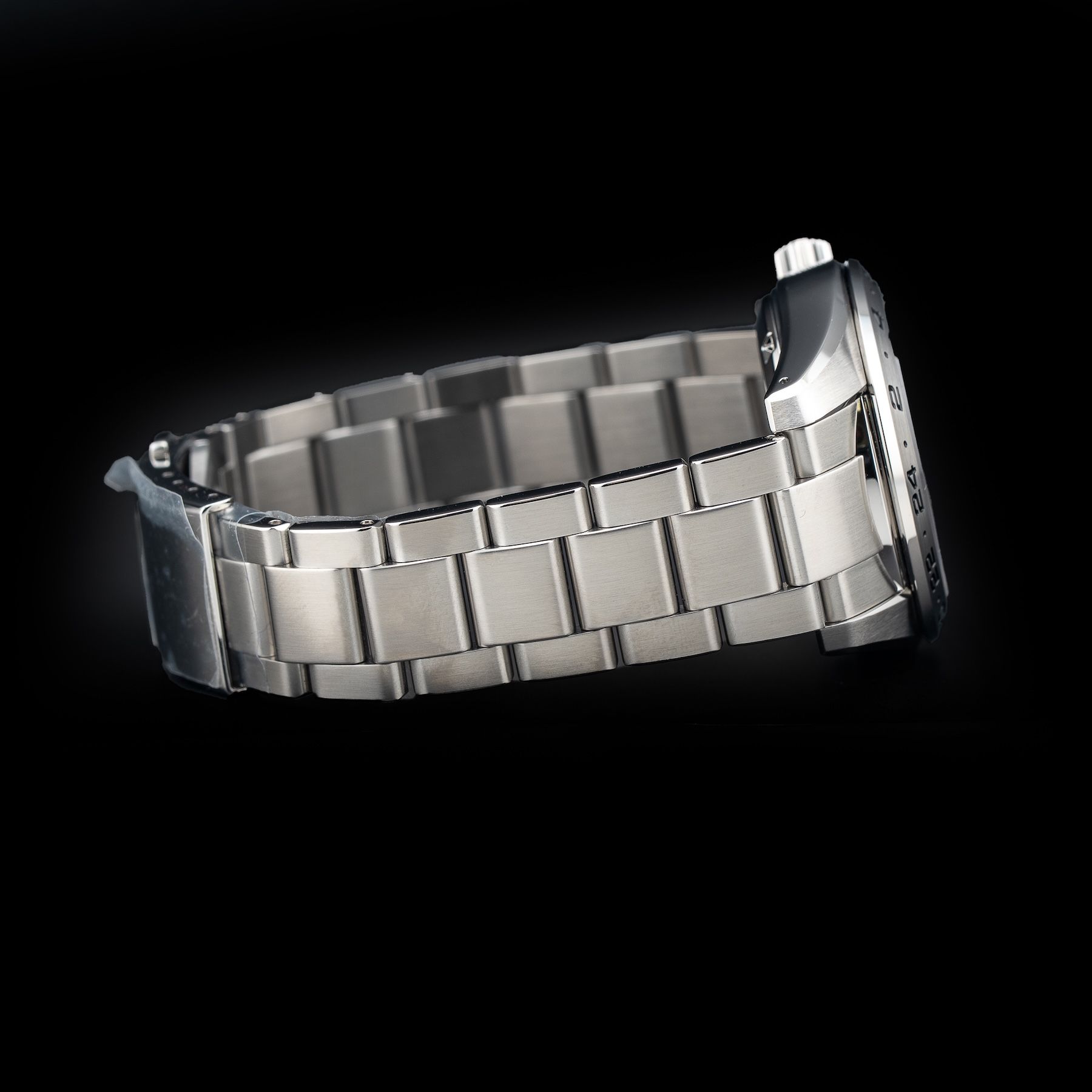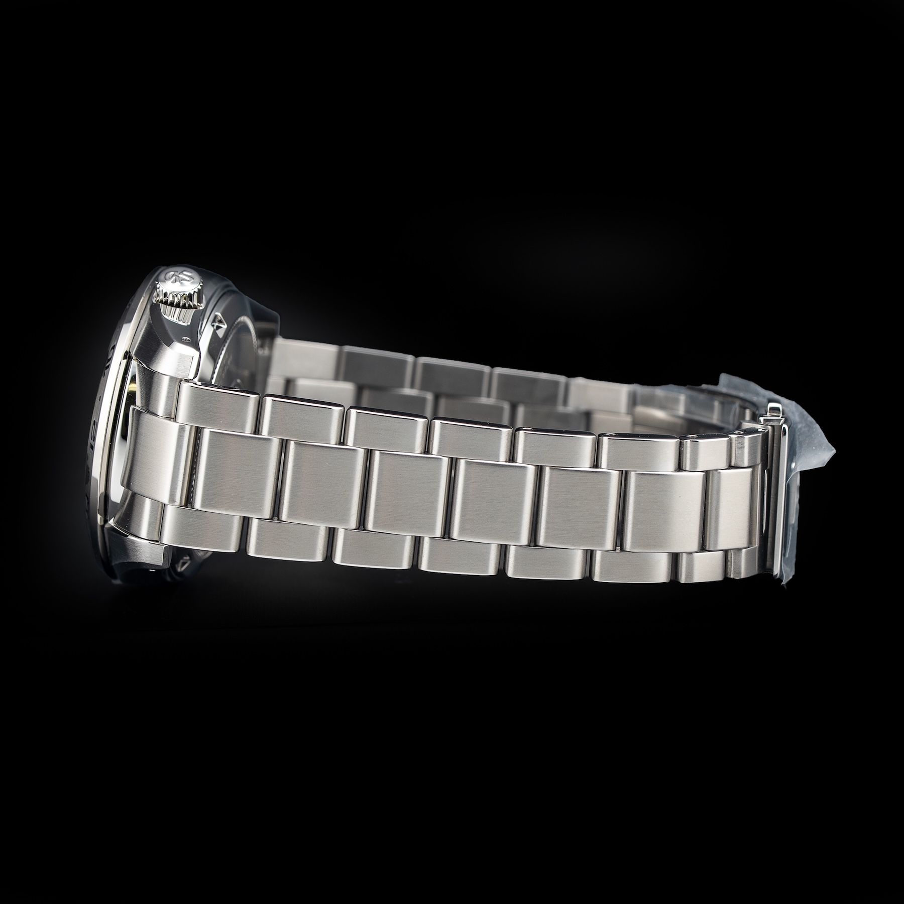 This watch features a 40mm stainless steel case on stainless steel bracelet. This watch also sports a blue dial. Powered by a mechanical automatic movement. Water resistance up to 200 meters.