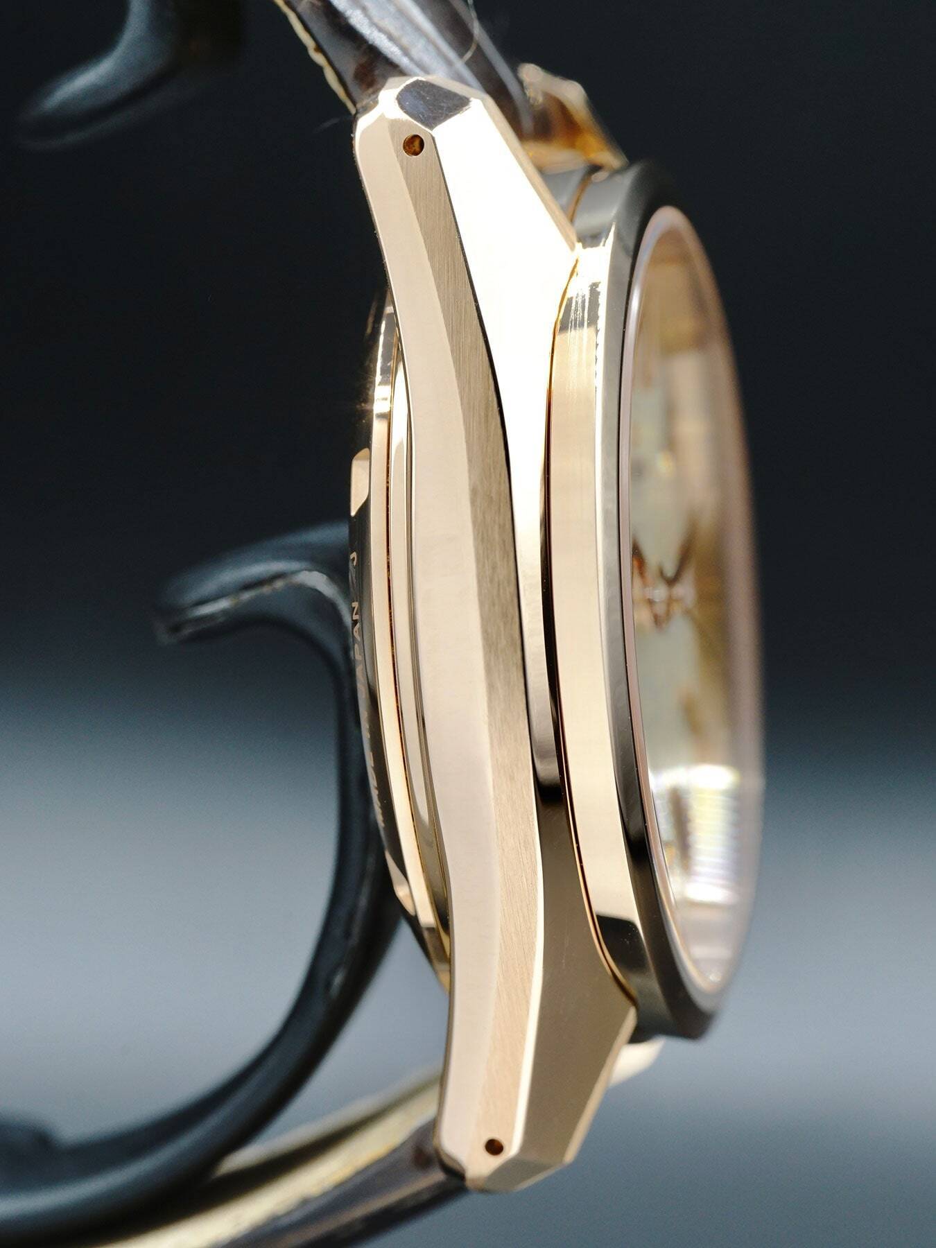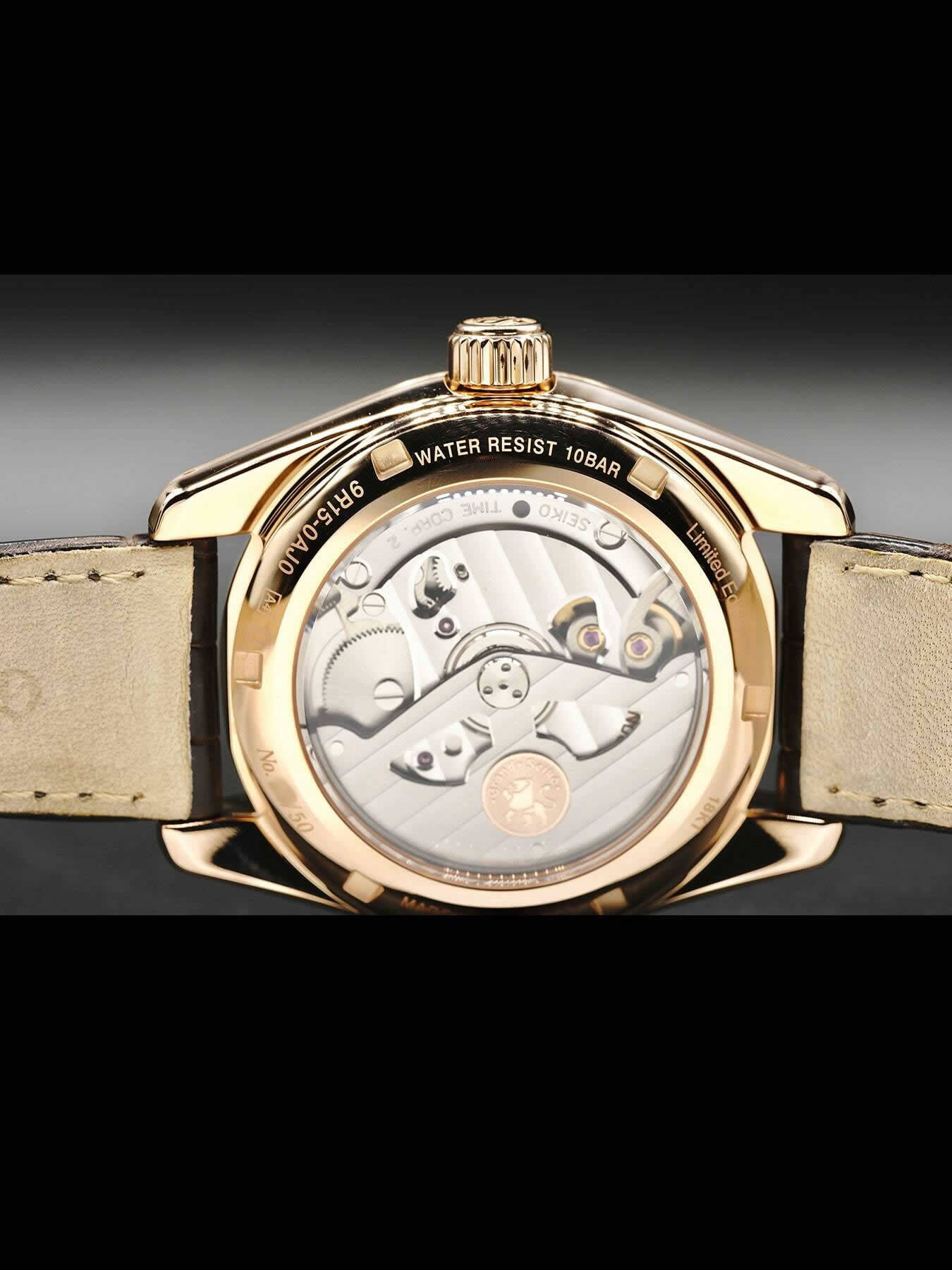 This Grand Seiko Spring Drive Limited Edition features a 40mm 18k rose gold case with a transparent case back on a brown leather strap. This watch also showcases a white, intricate patterned dial with rose gold-tone hands covered by dual-curved, anti-reflective sapphire crystal.