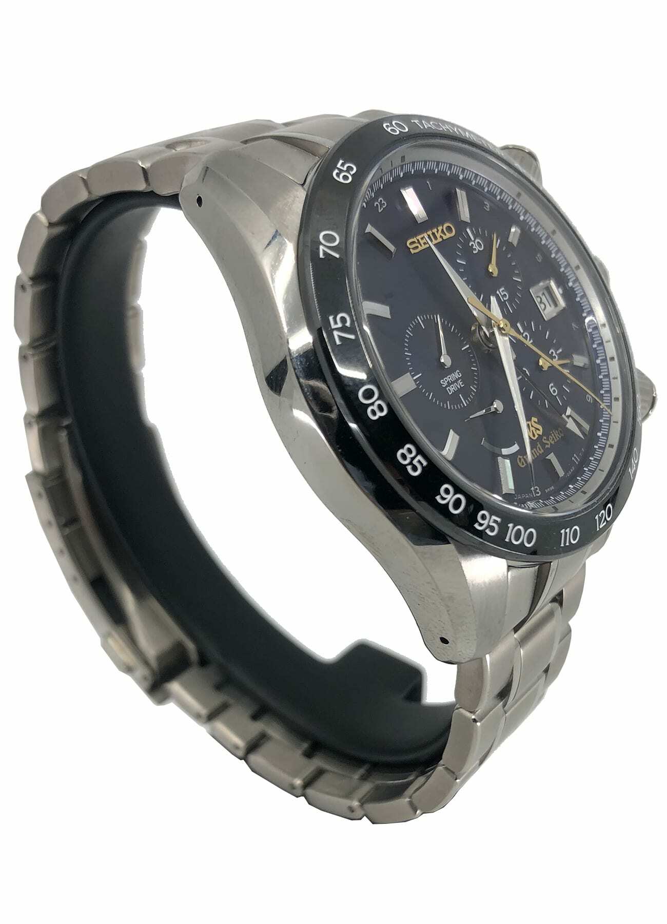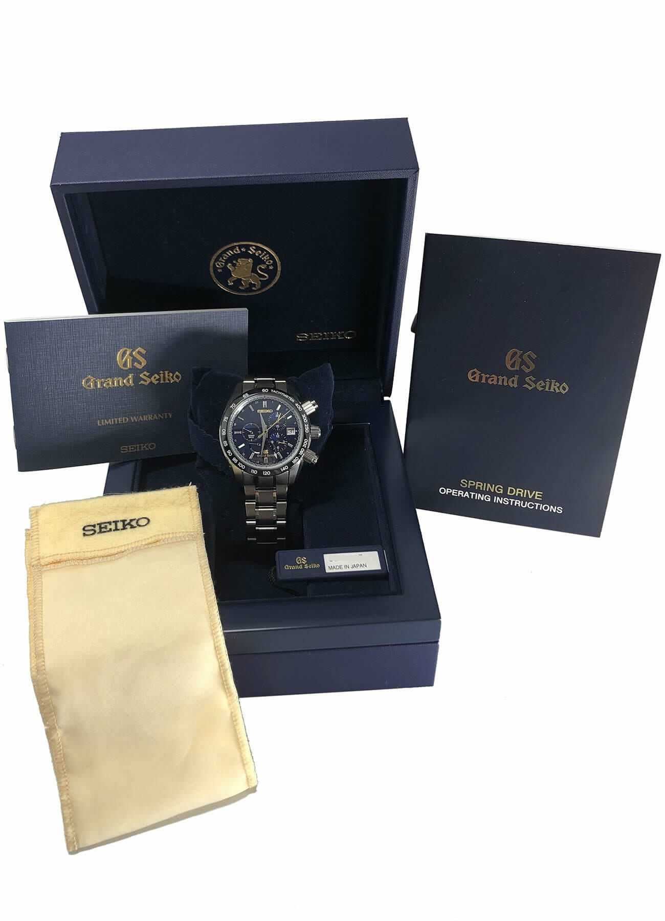 This watch features a 43mm titanium case on titanium bracelet. This watch also sports a blue dial. Powered by a Spring Drive Movement. Water resistance up to 100 meters.