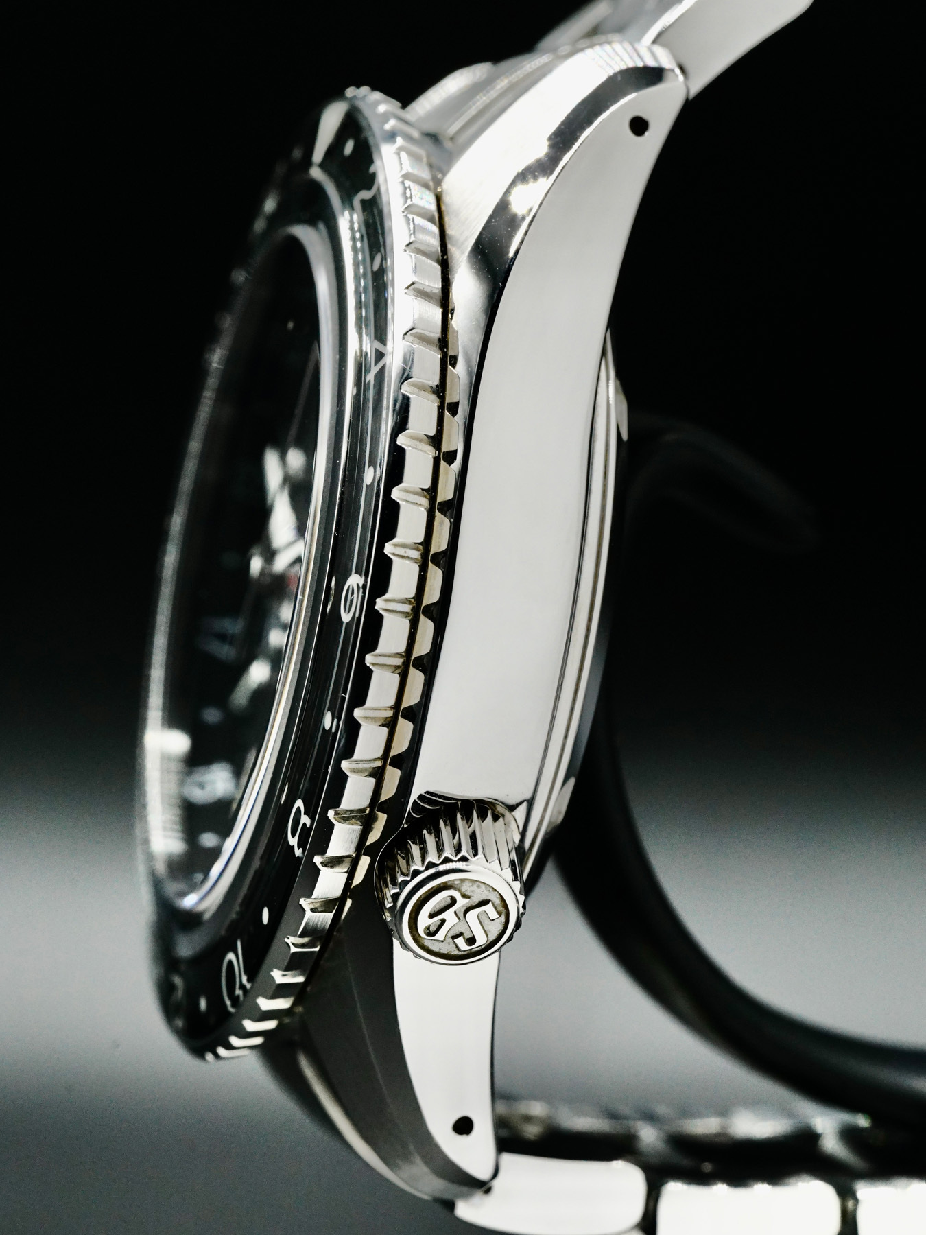 This Grand Seiko Spring Drive features a 43.5mm stainless steel case with a solid case back on a stainless steel bracelet. This watch also sports a black dial with luminous hands and index dial markers covered by scratch resistant sapphire crystal.