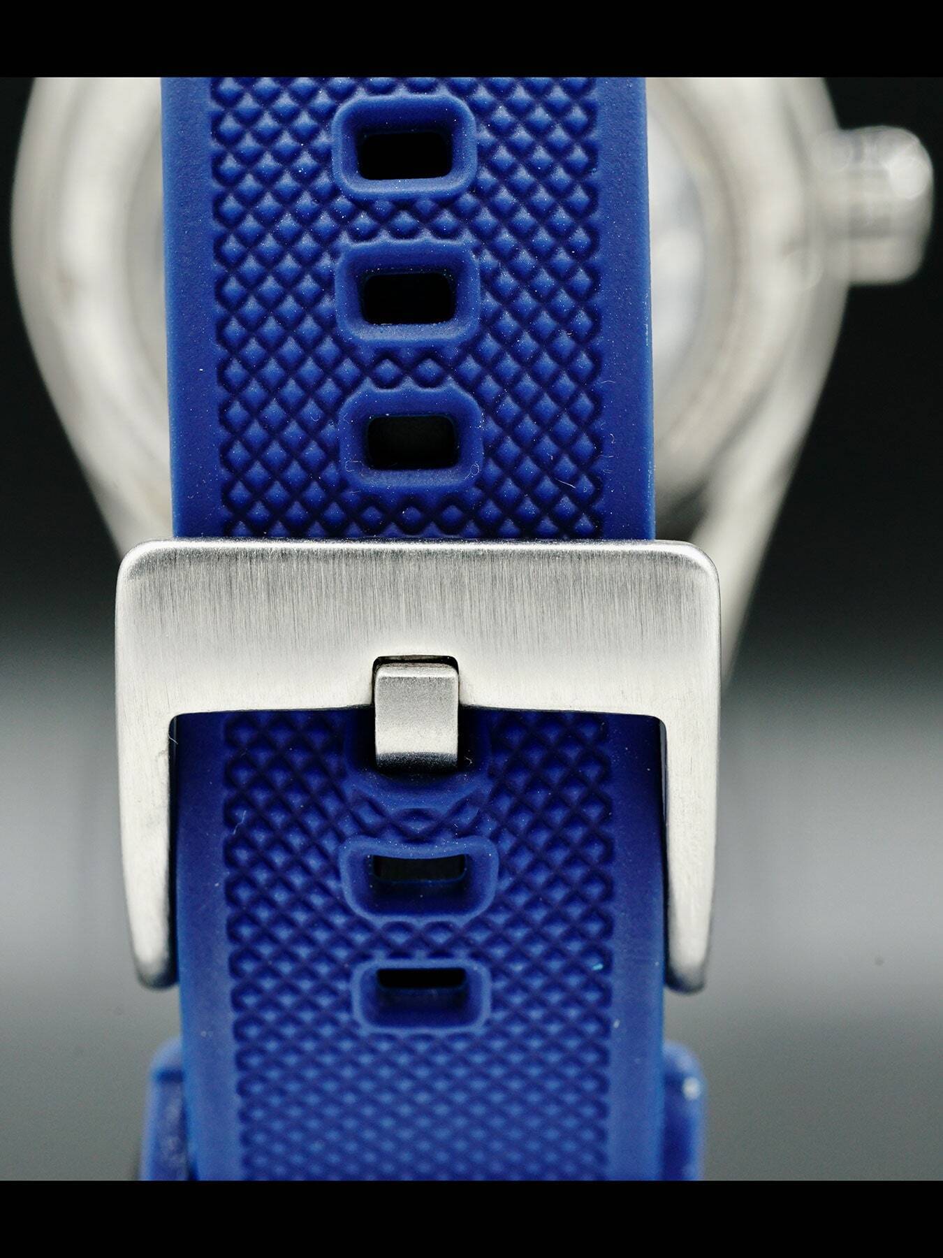 The blue steel second hand moves smoothly in glide motion, and glows over the contrasting pure white face to create an even more dramatic movement.