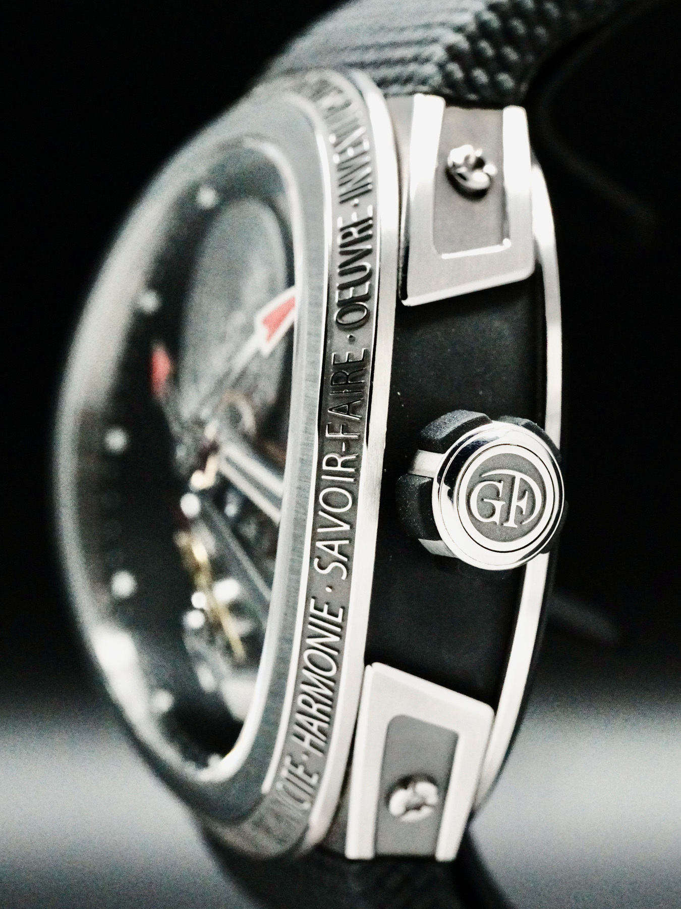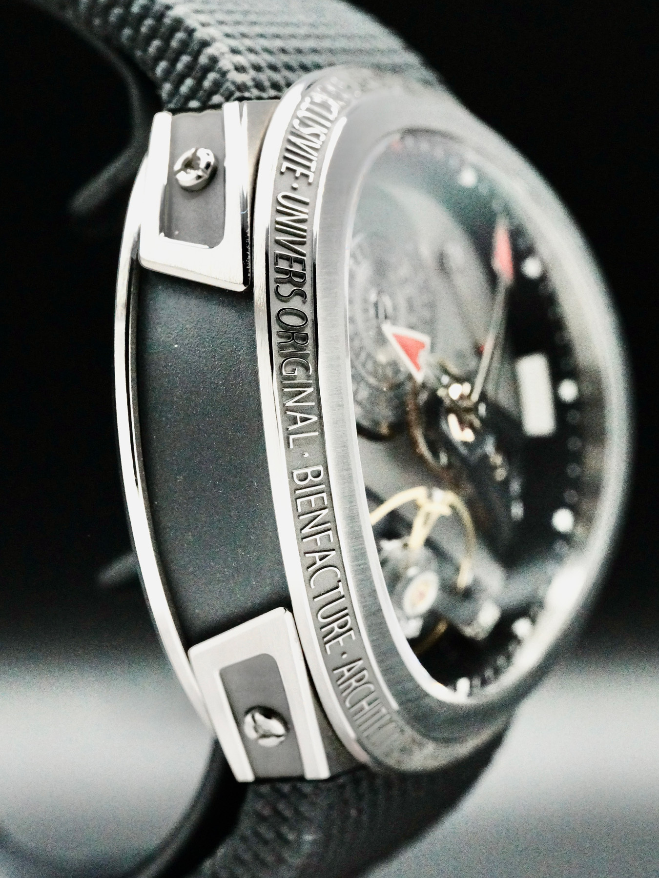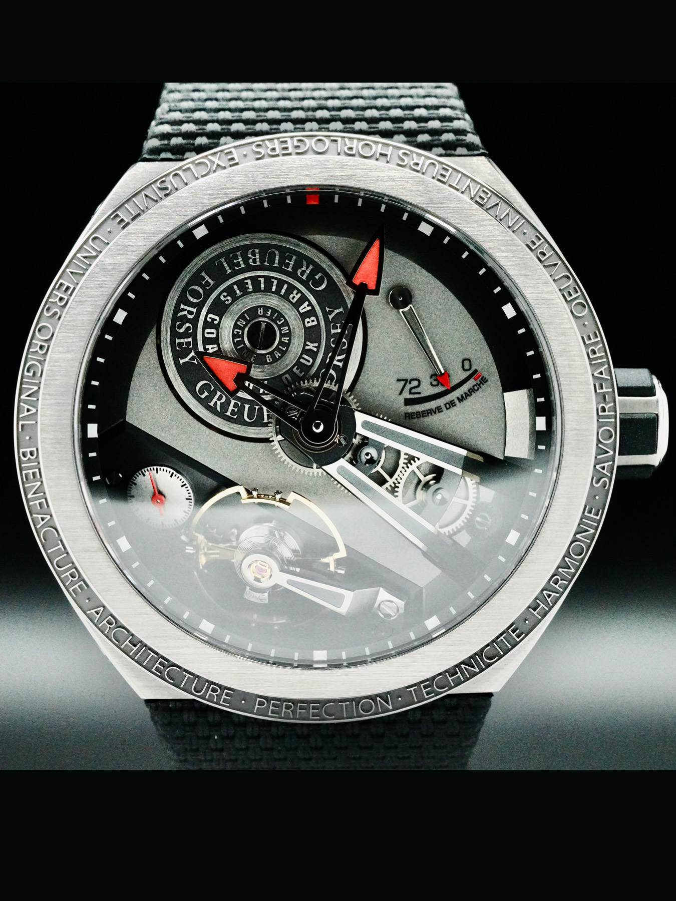 This Greubel Forsey Balancier S features a 45mm titanium case with an exhibition case back on a black textil strap. This watch also sports a grey dial with luminous red-tip hands and index dial markers covered by sapphire crystal.