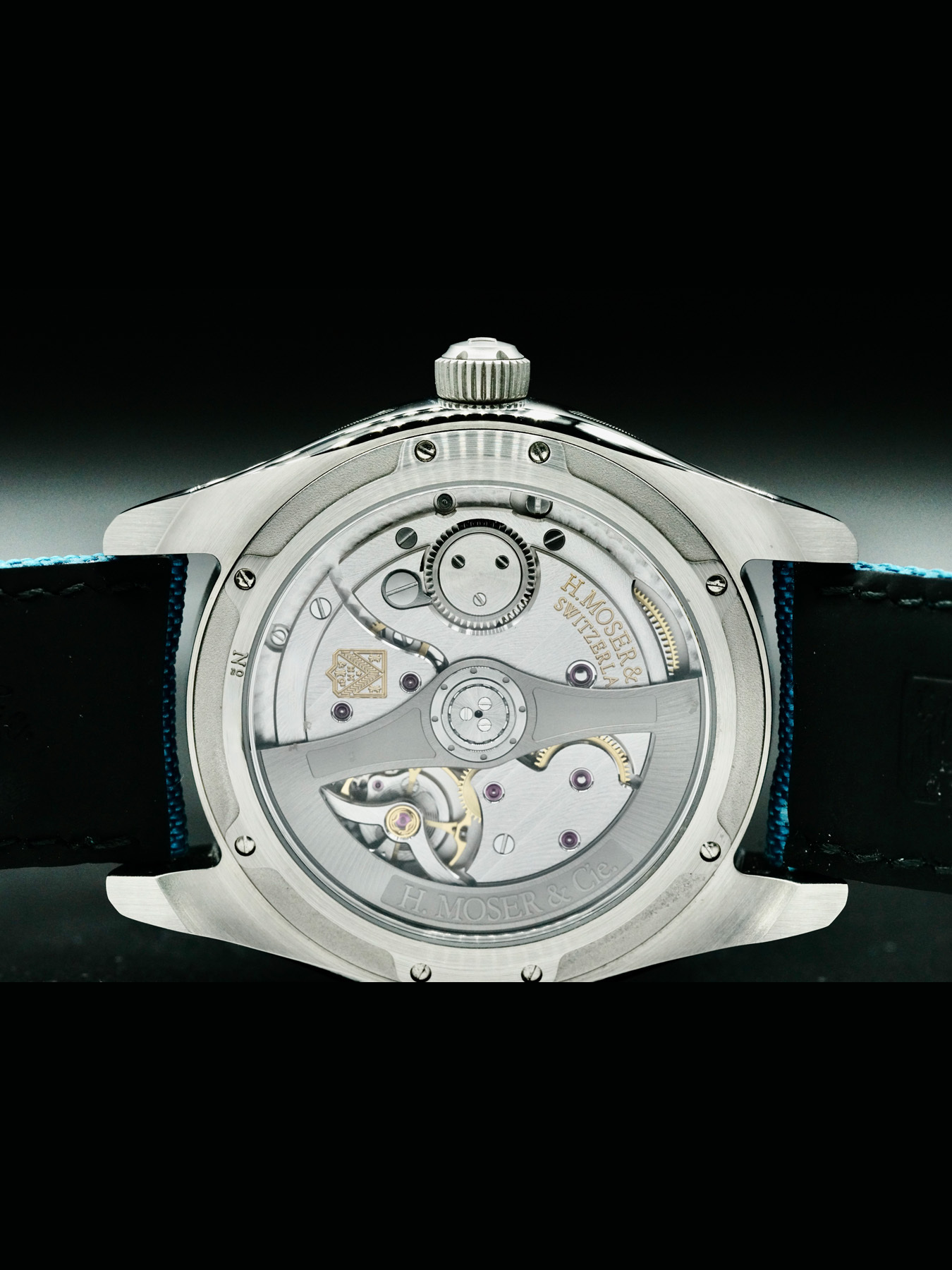 Mechanical Automatic movement powered by H. Moser & Cie. Caliber HMC 200. Water resistant up to 120 meters.